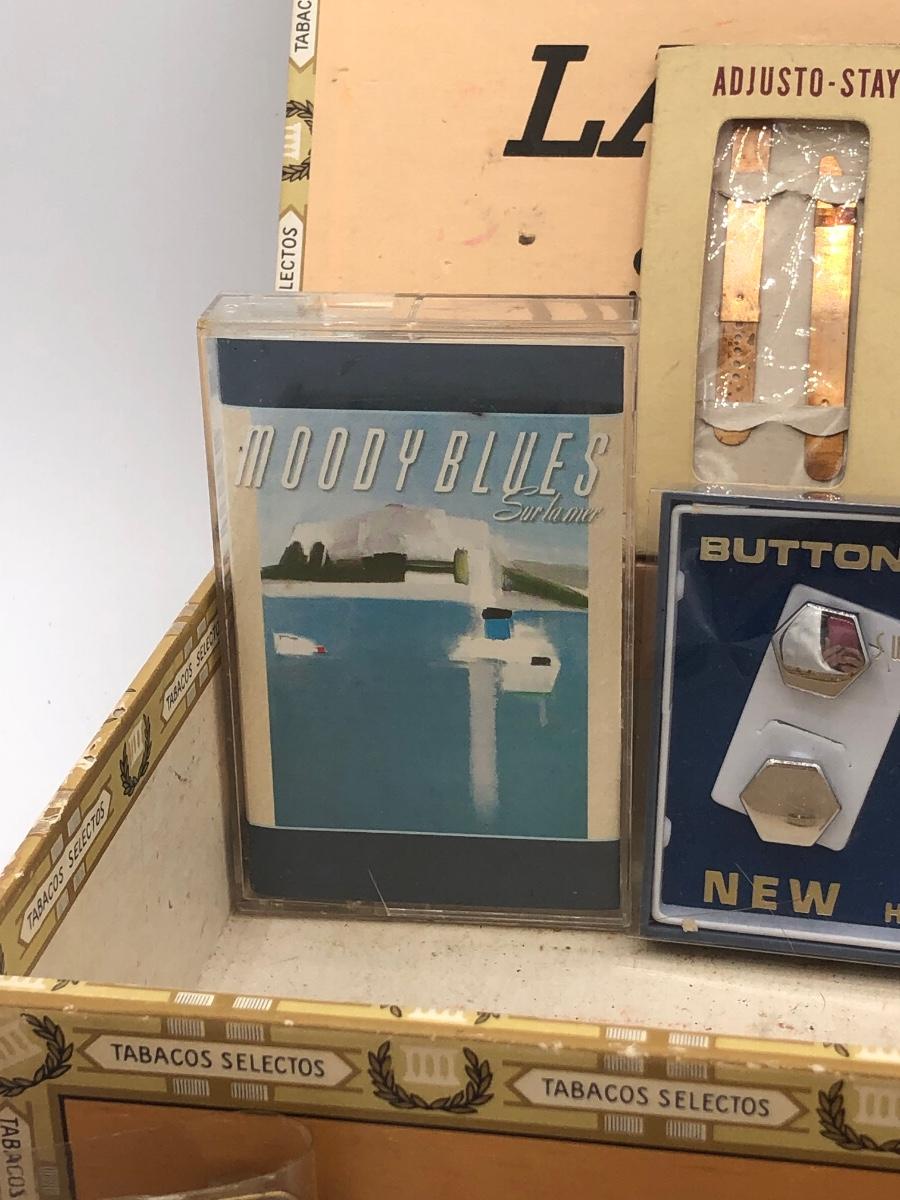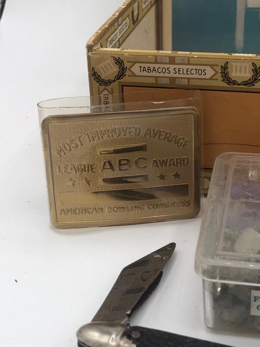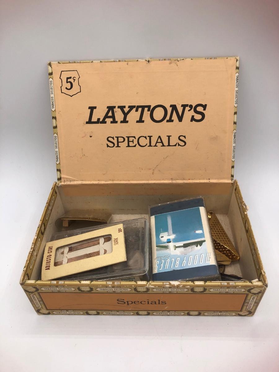 LOT 26K: Vintage Layton’s Cigar Box filled with Goodies! Coins, Swank Accessories NIP, Folding Pocket Knife, Earth Exploration Co Mineral and Fossil Collection & More