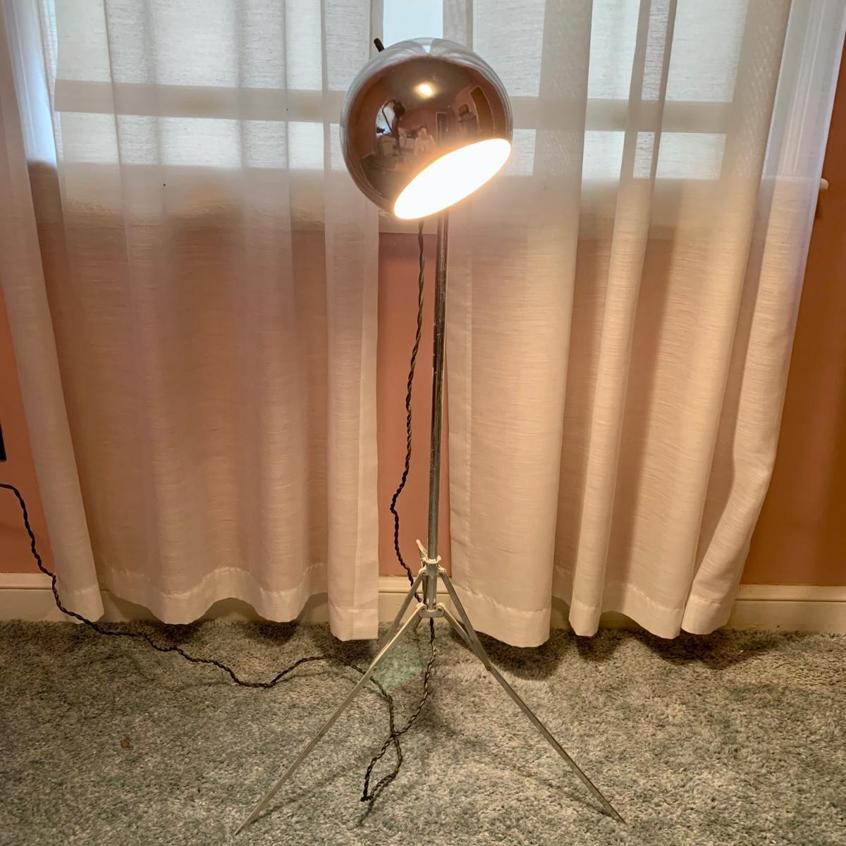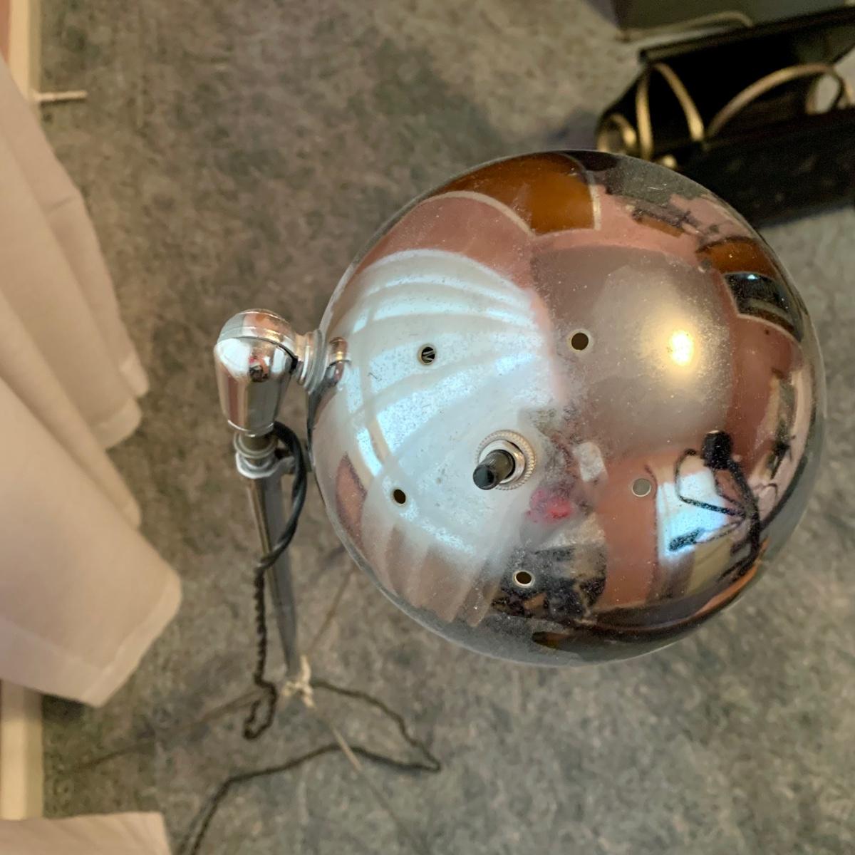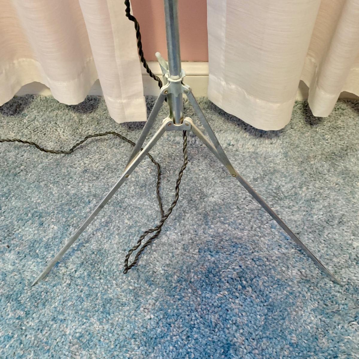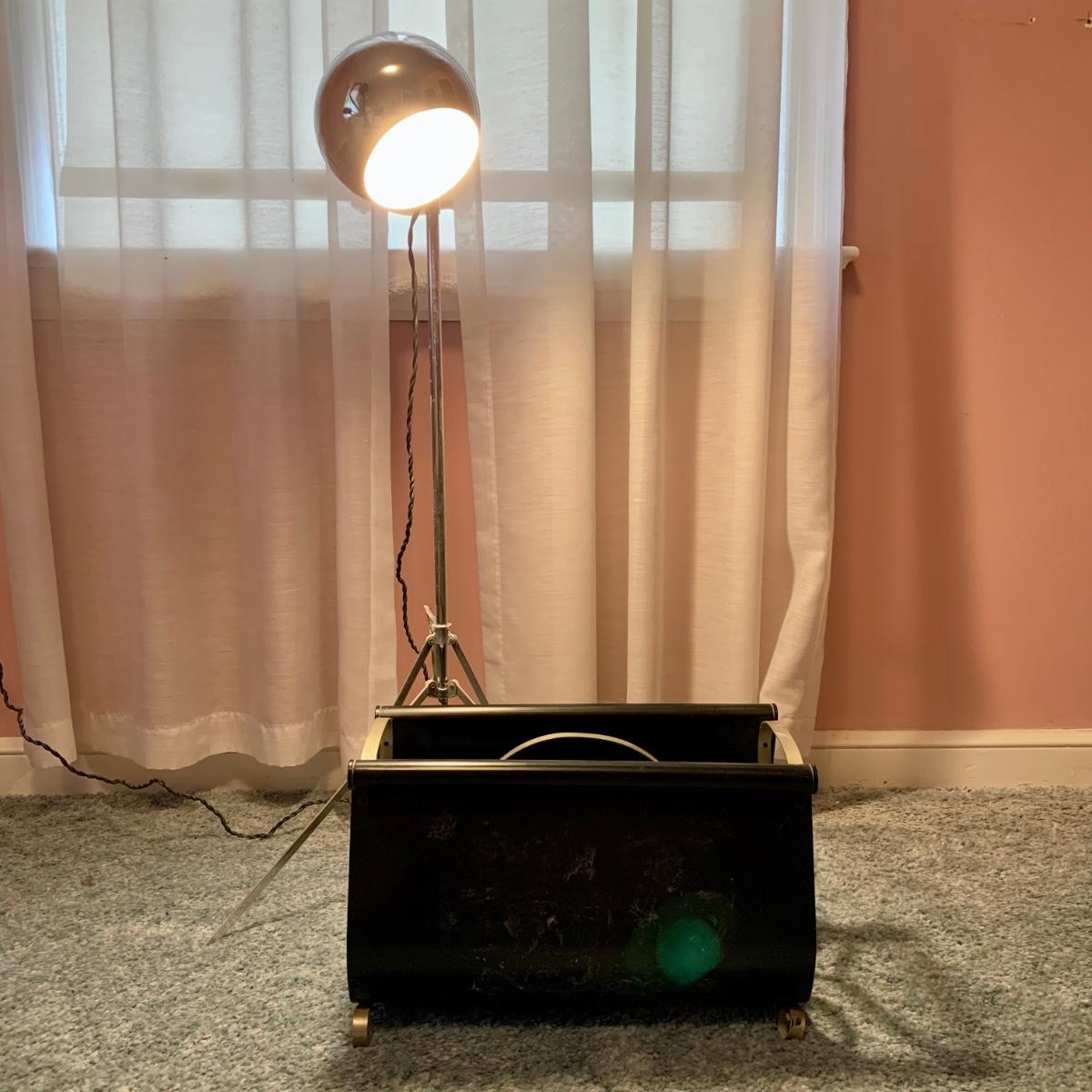 LOT 46 Y: Vintage MCM Chrome Orb Adjustable Tripod Floor / Desk Lamp & 50's Toleware Metal Scroll Magazine Holder