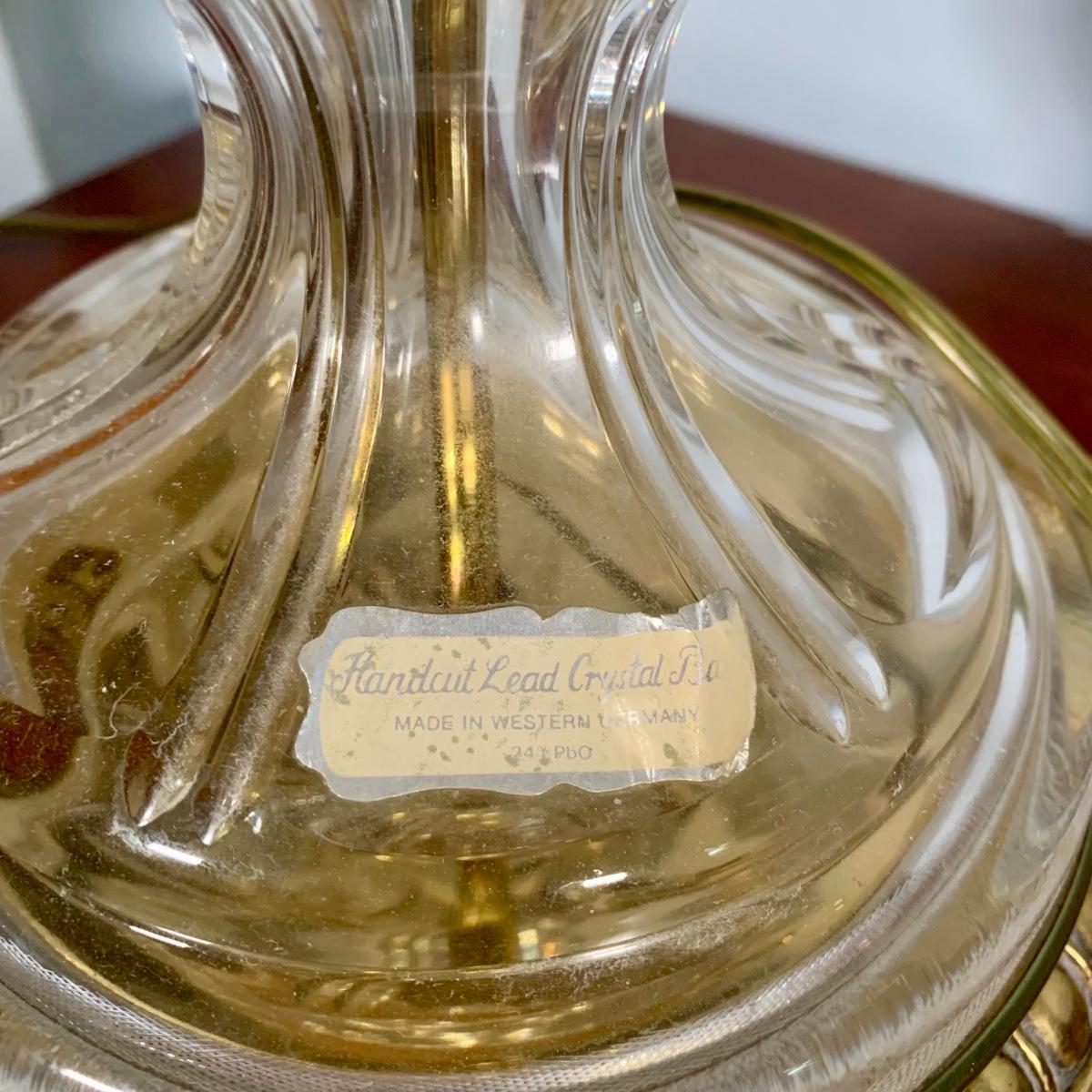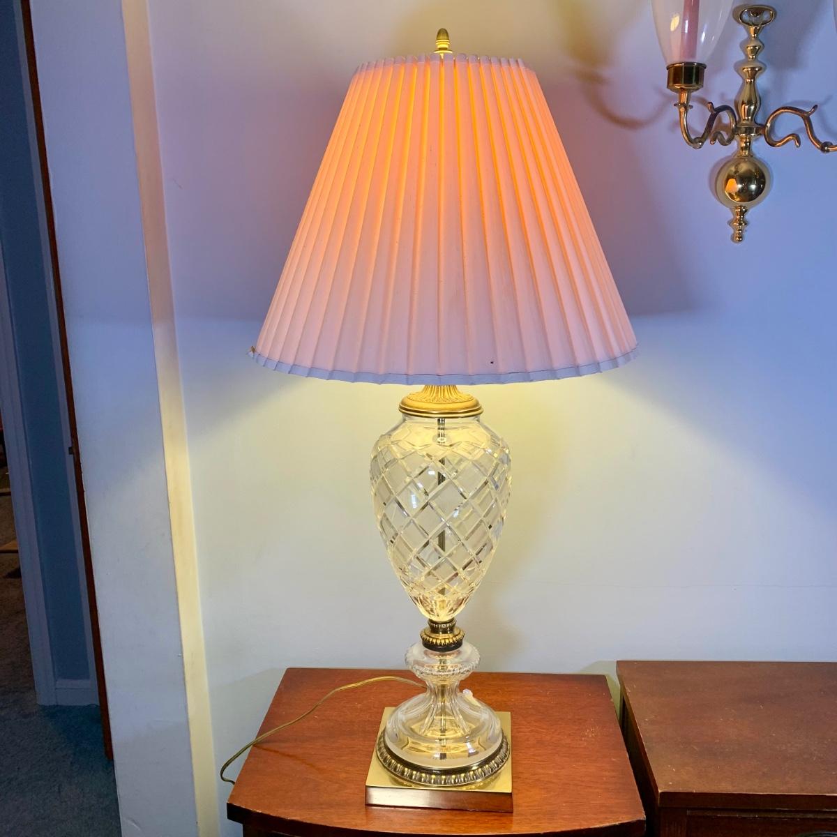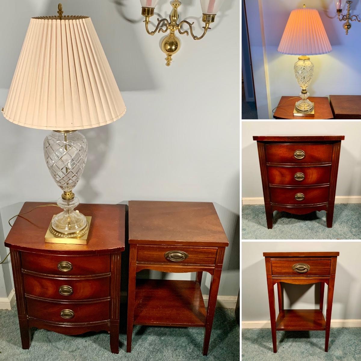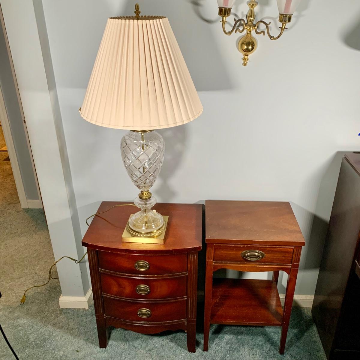LOT 53 L: Hand Cut Lead Crystal German made Lamp & Dixie Mahogany 2 & 1 Drawer Nightstands