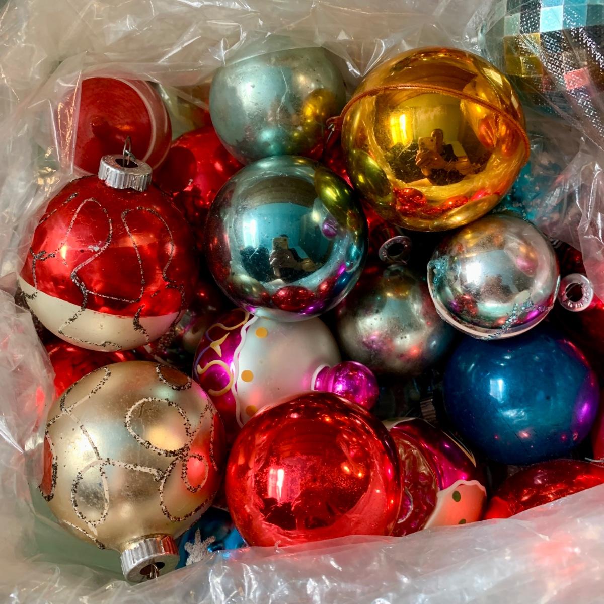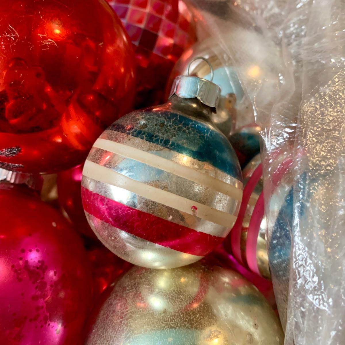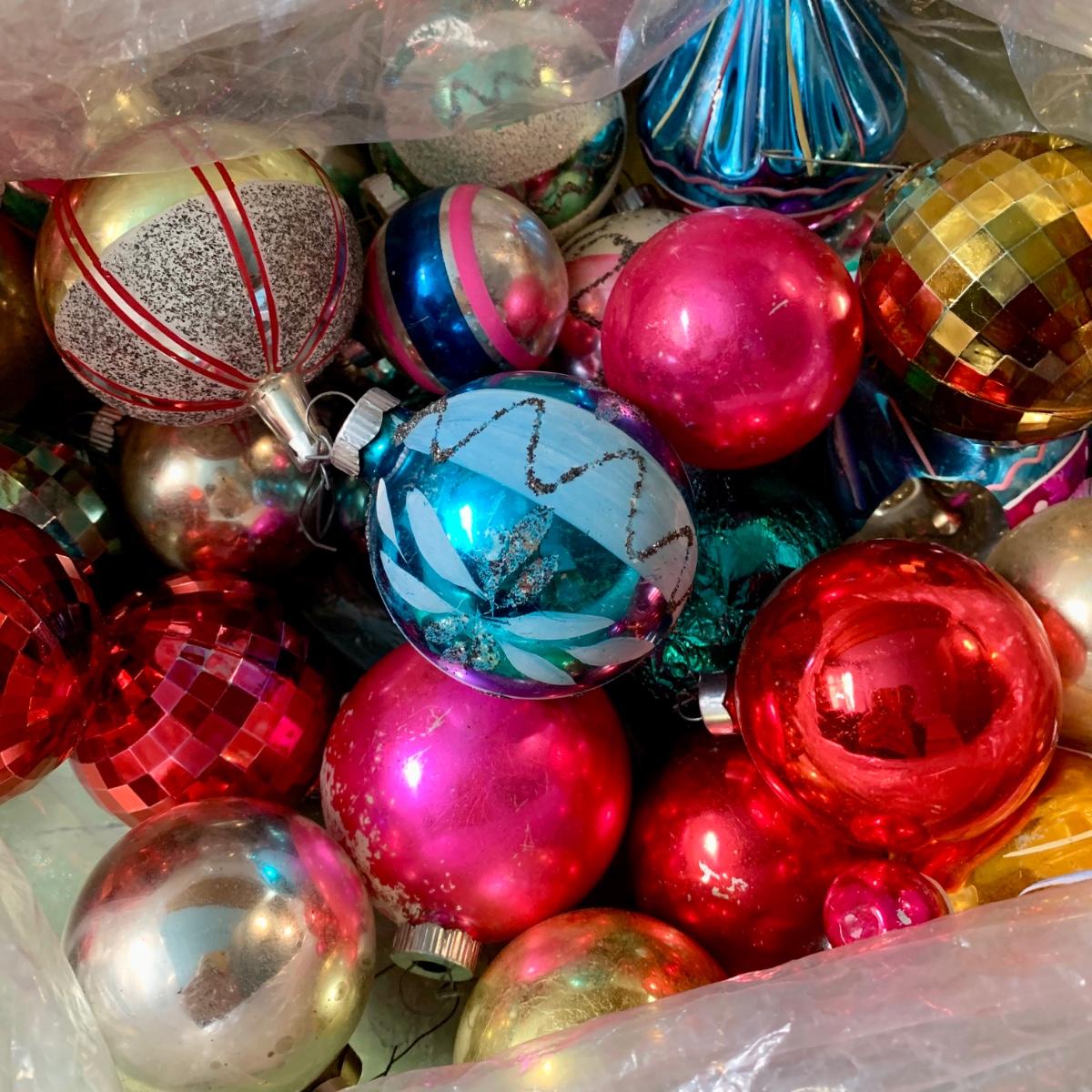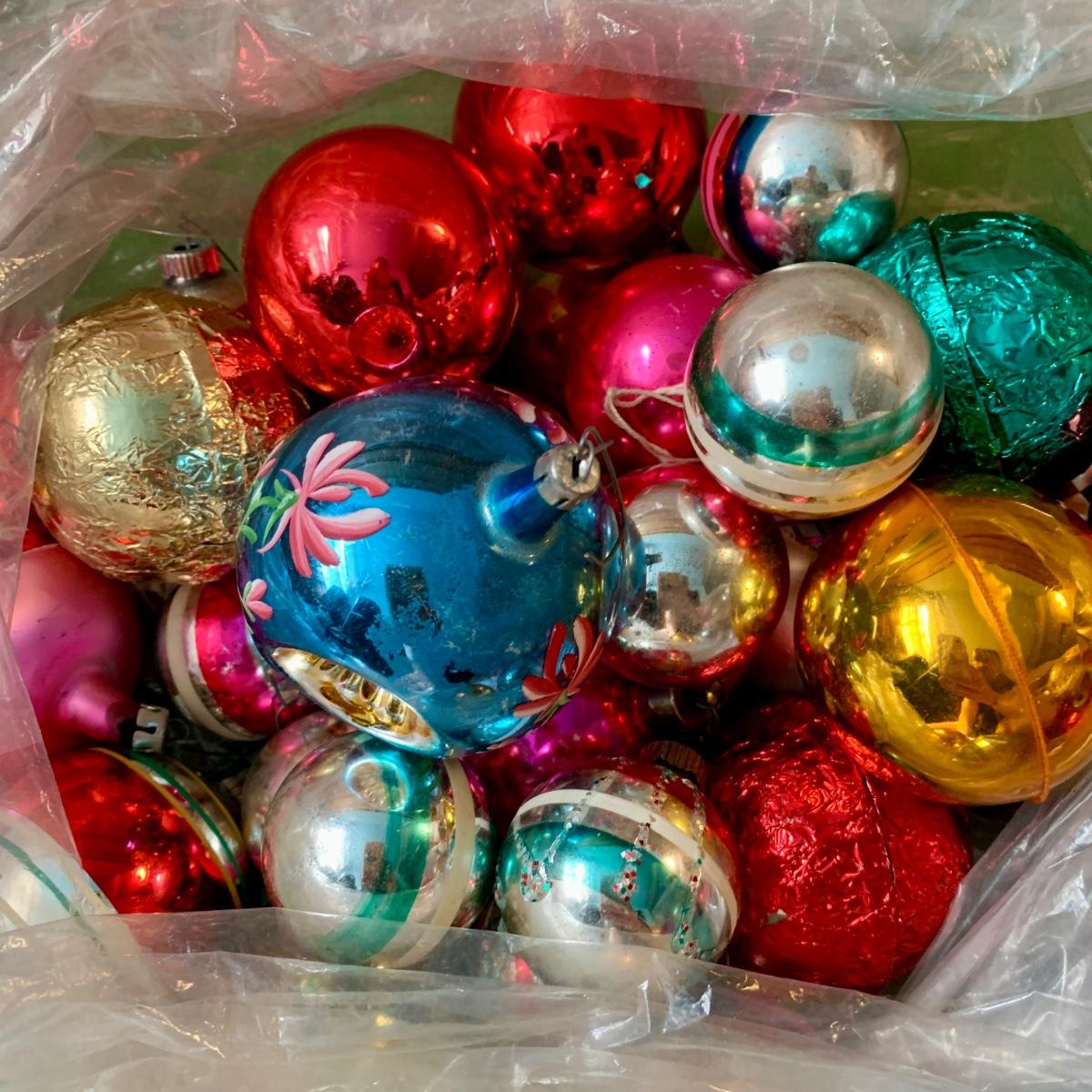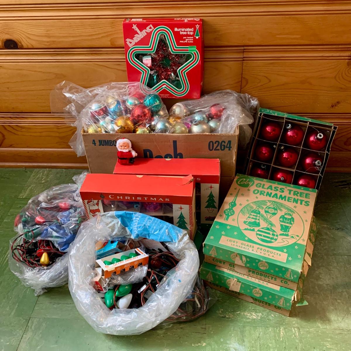 LOT 67 A: Vintage Christmas Collection: Glass Ball Tree Ornaments (Some Handpainted), Davinci Tree Topper, & Multiple Strands of Multicolored String Lights
