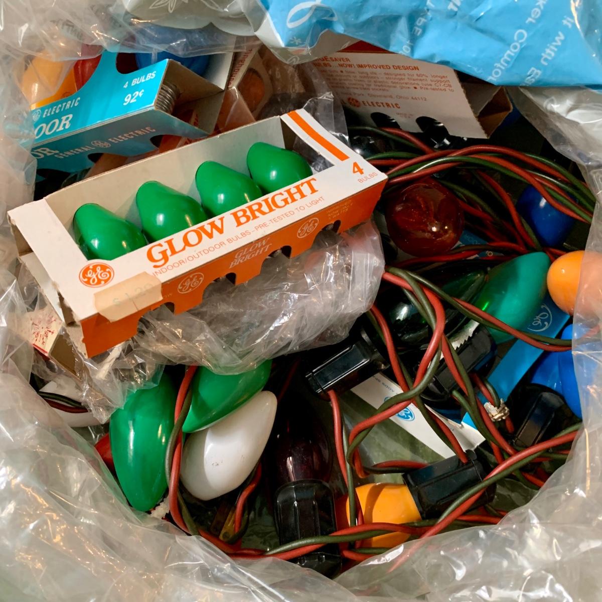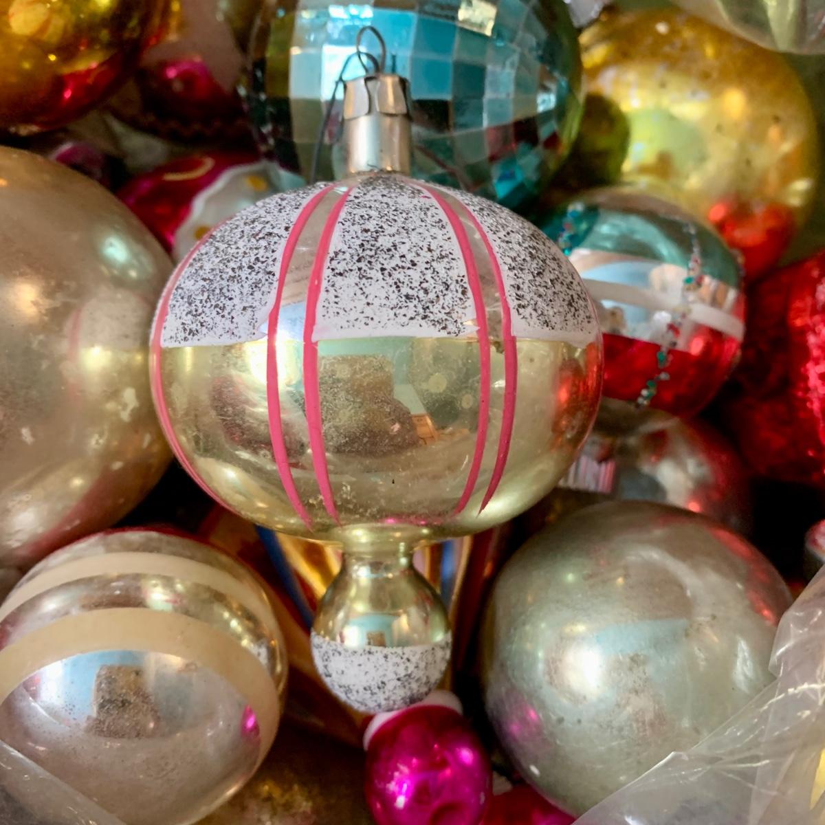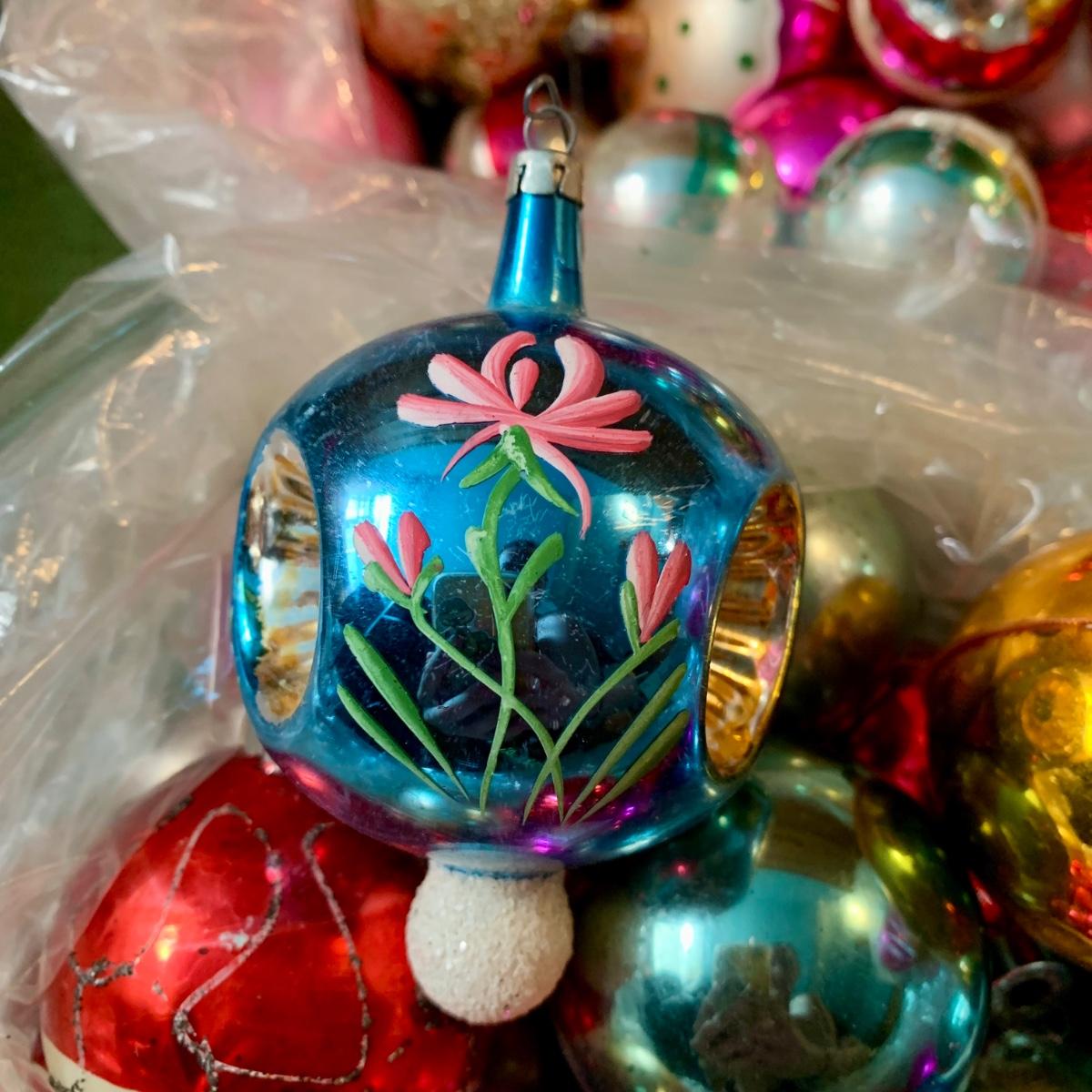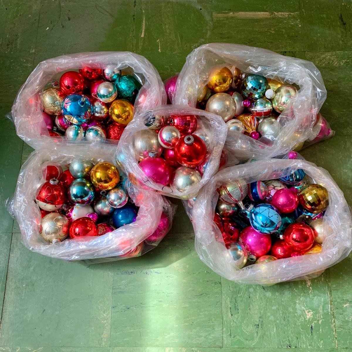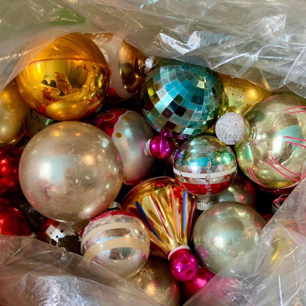 LOT 67 A: Vintage Christmas Collection: Glass Ball Tree Ornaments (Some Handpainted), Davinci Tree Topper, & Multiple Strands of Multicolored String Lights
