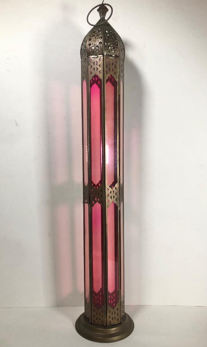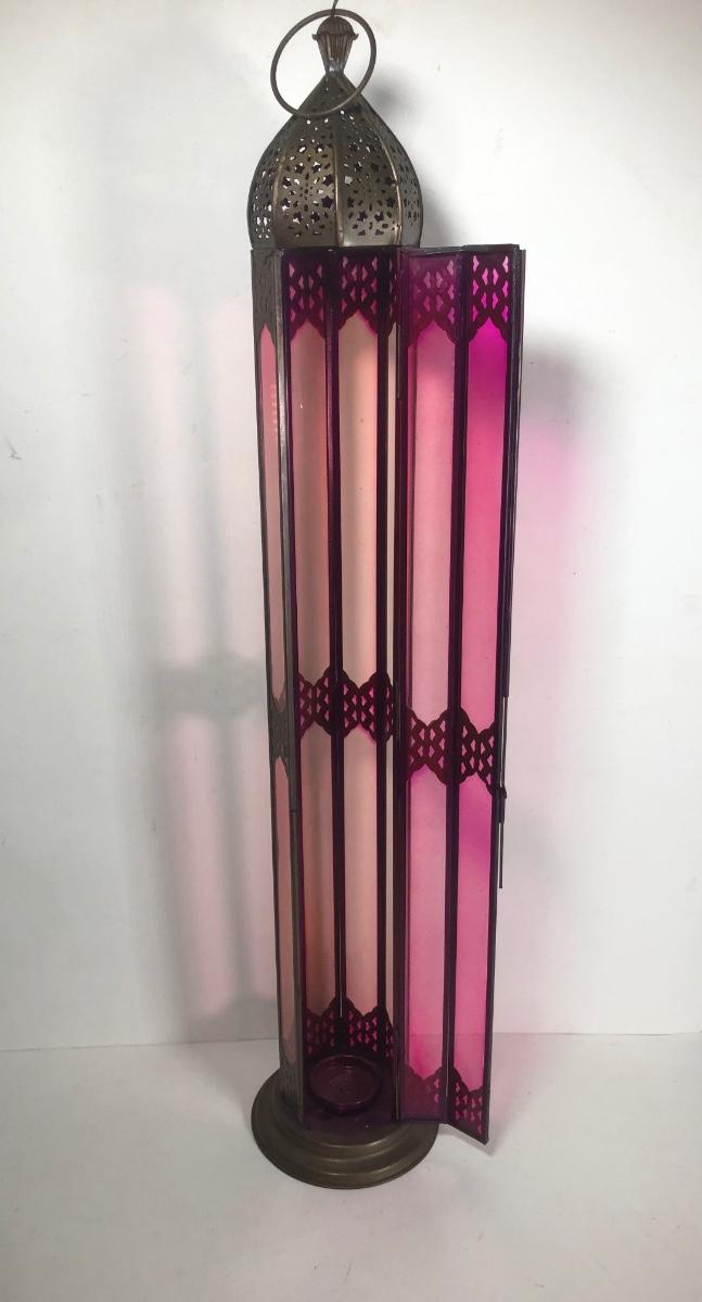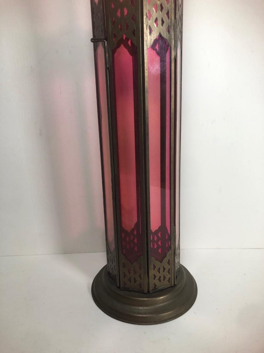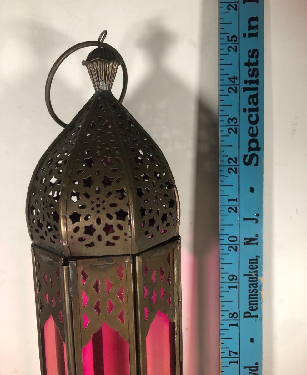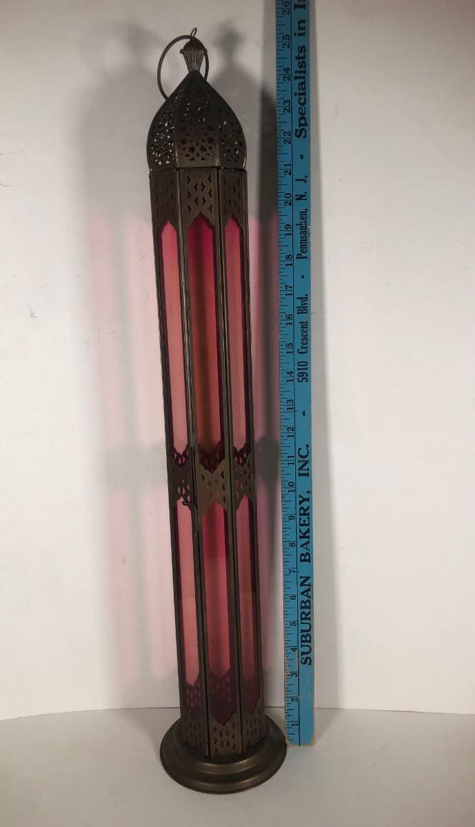 LOT 108K: Vintage 25" Tall Decorative Red Glass & Metal Moroccan Tower Lantern