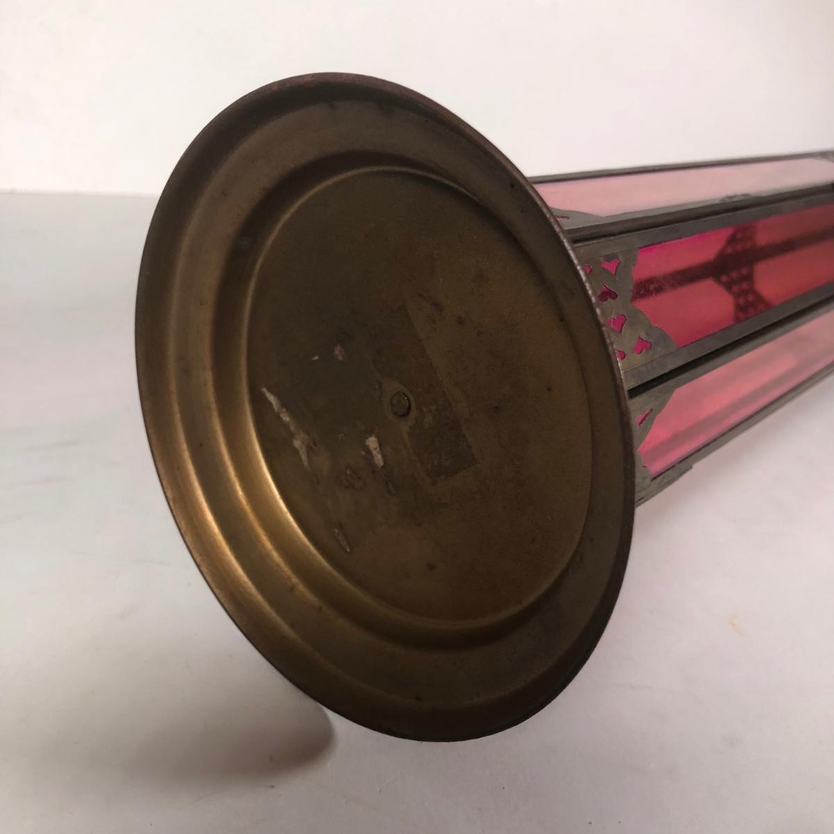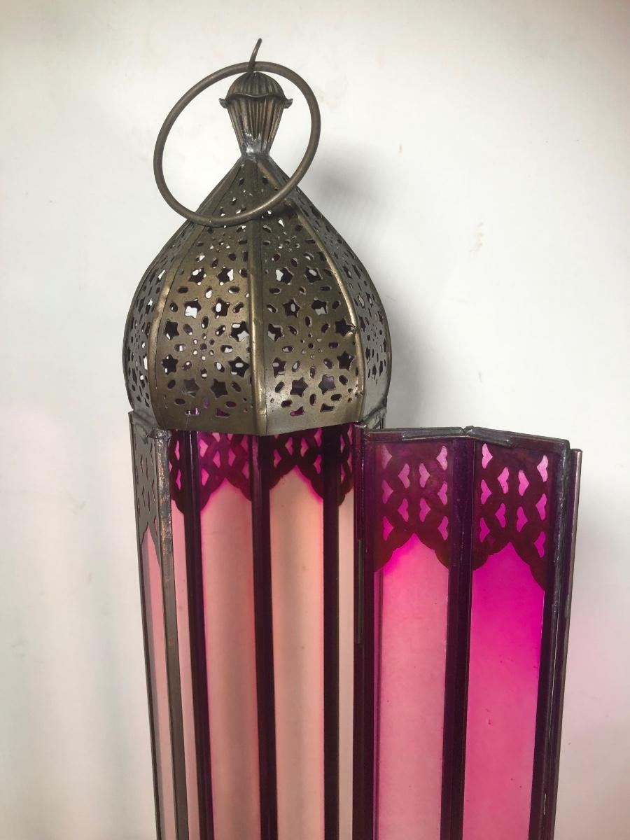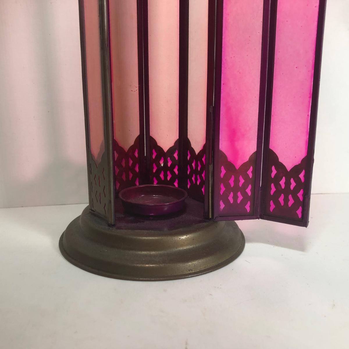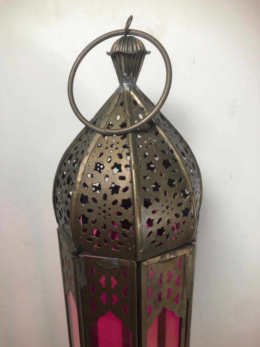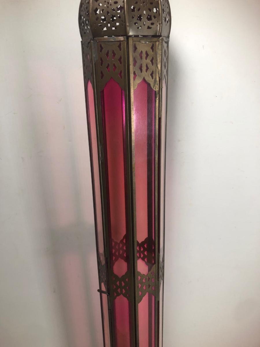 LOT 108K: Vintage 25" Tall Decorative Red Glass & Metal Moroccan Tower Lantern