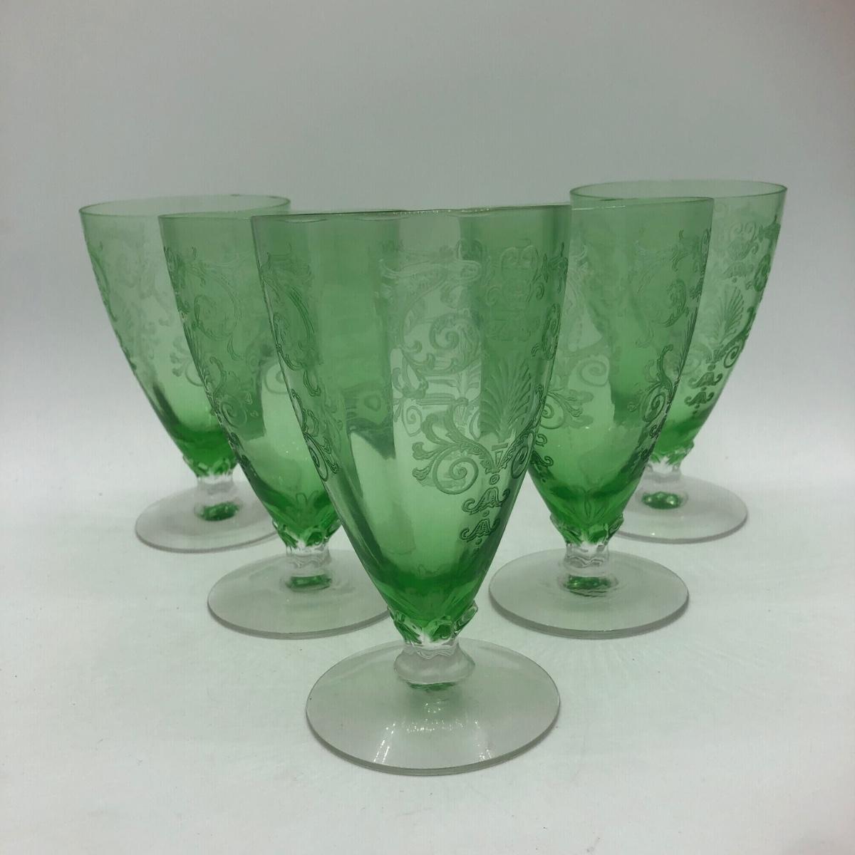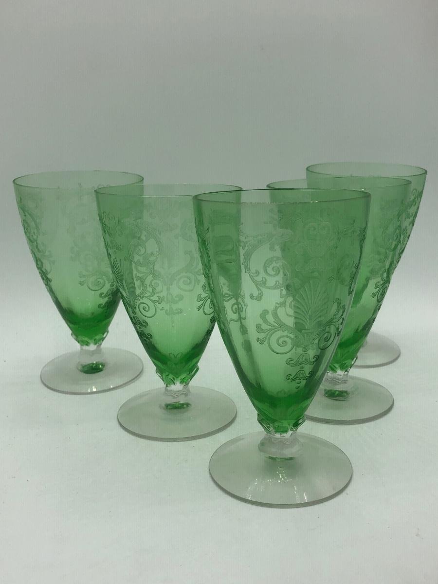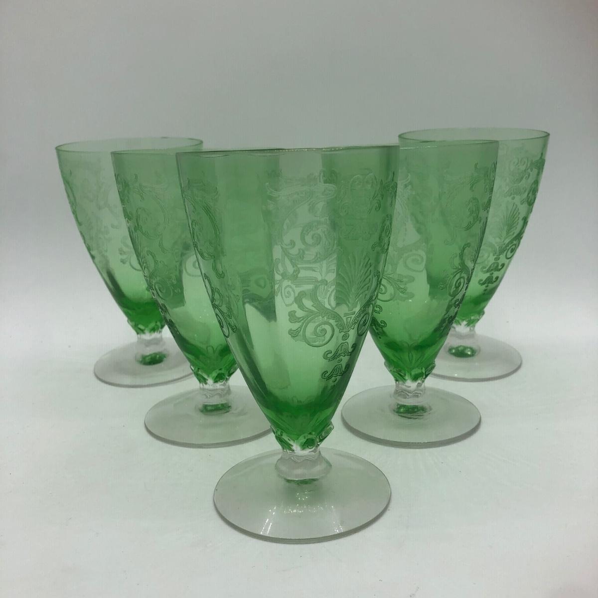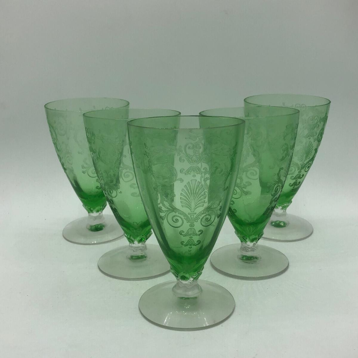 LOT 112L: Vintage Etched Fostoria Versailles Green Depression Uranium Glass Footed 9 oz Juice Glasses (5)