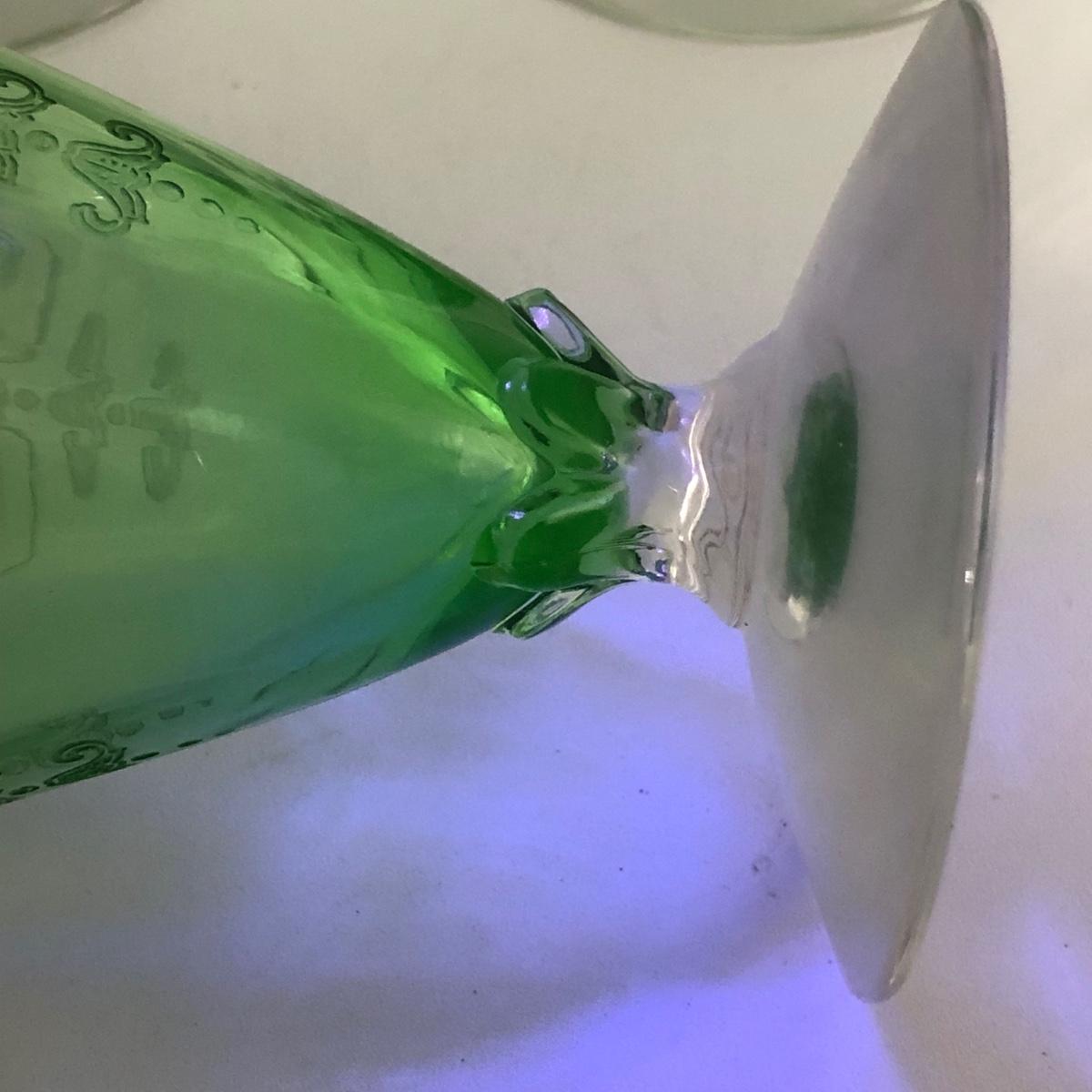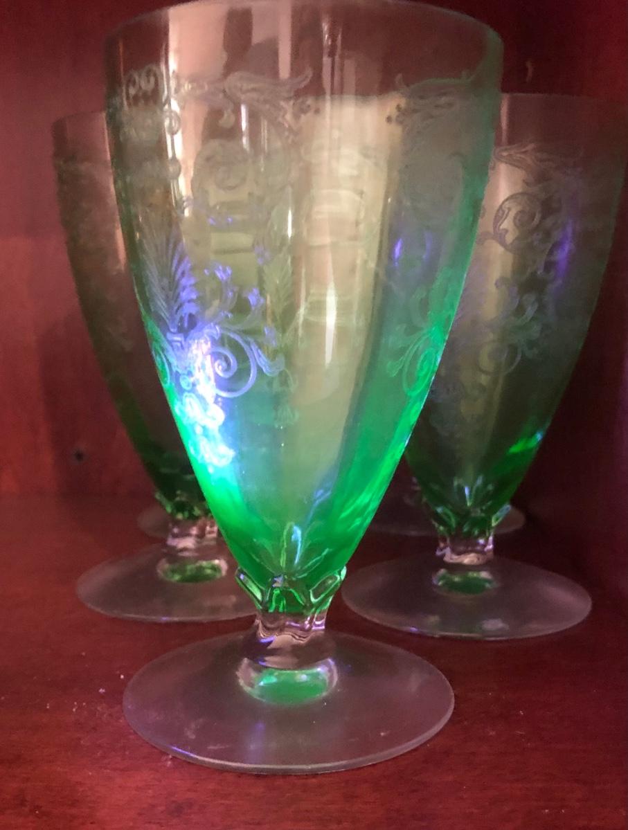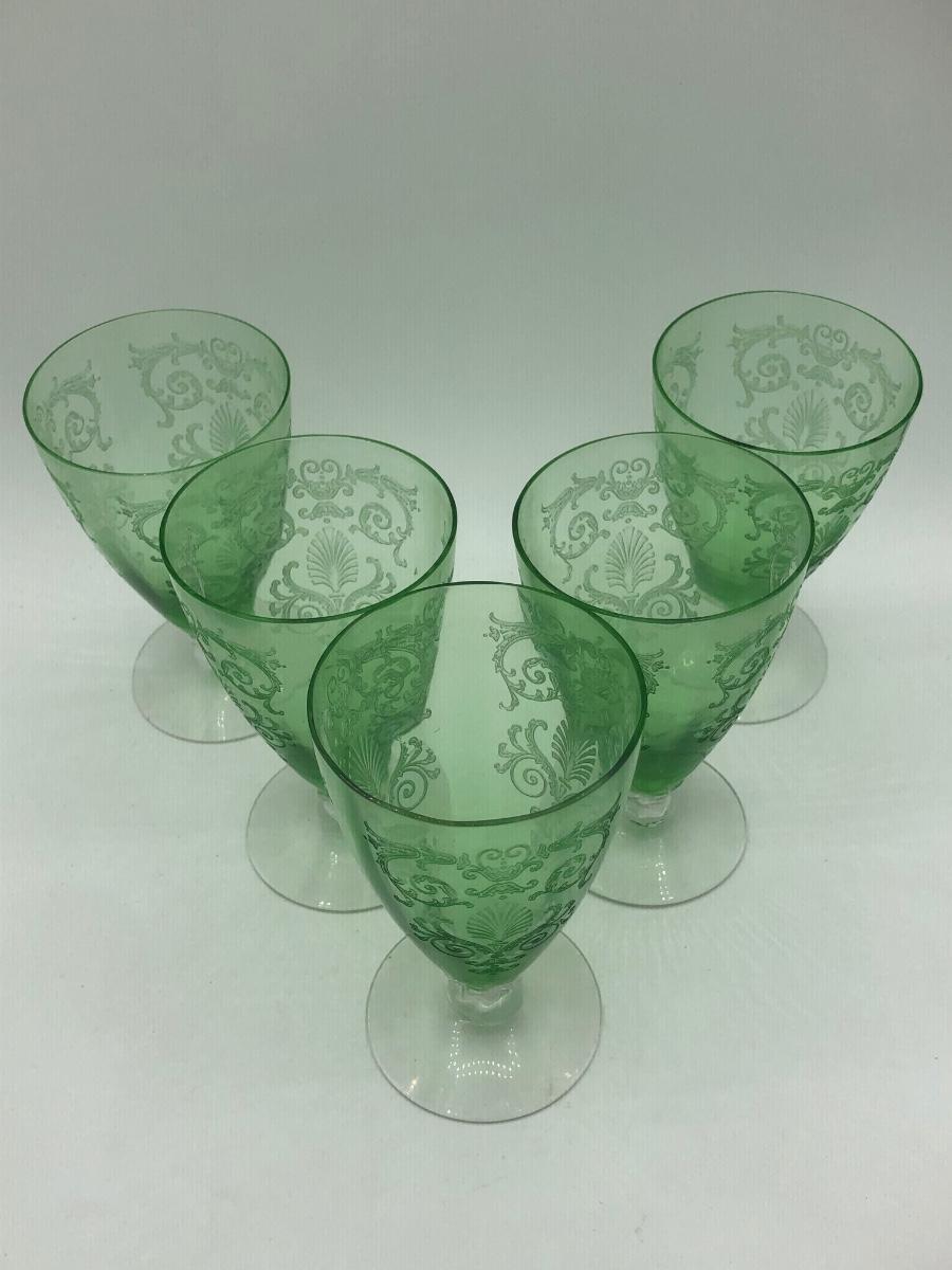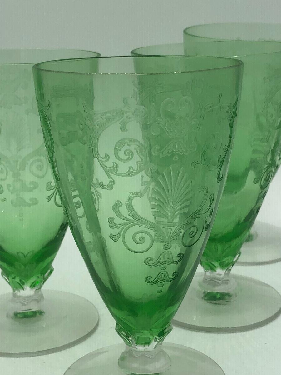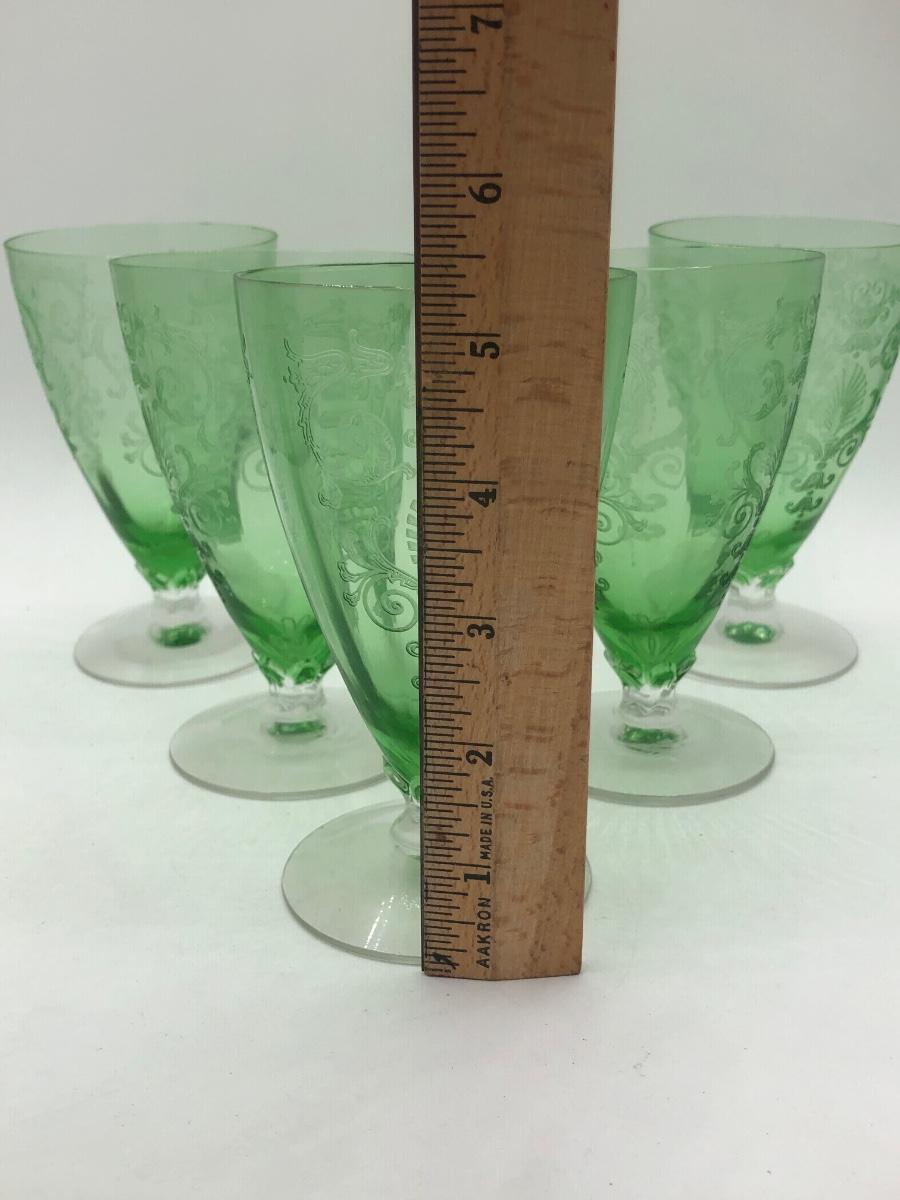 LOT 112L: Vintage Etched Fostoria Versailles Green Depression Uranium Glass Footed 9 oz Juice Glasses (5)