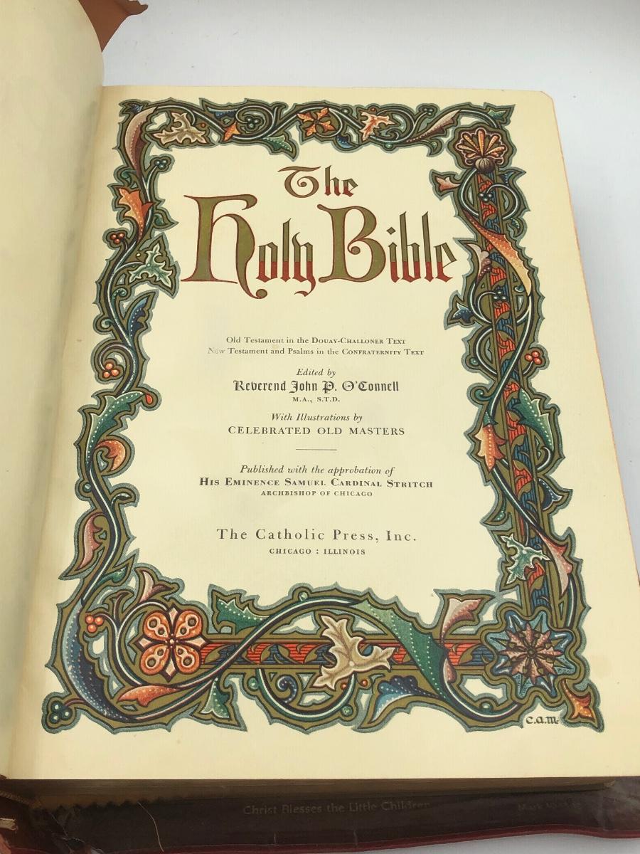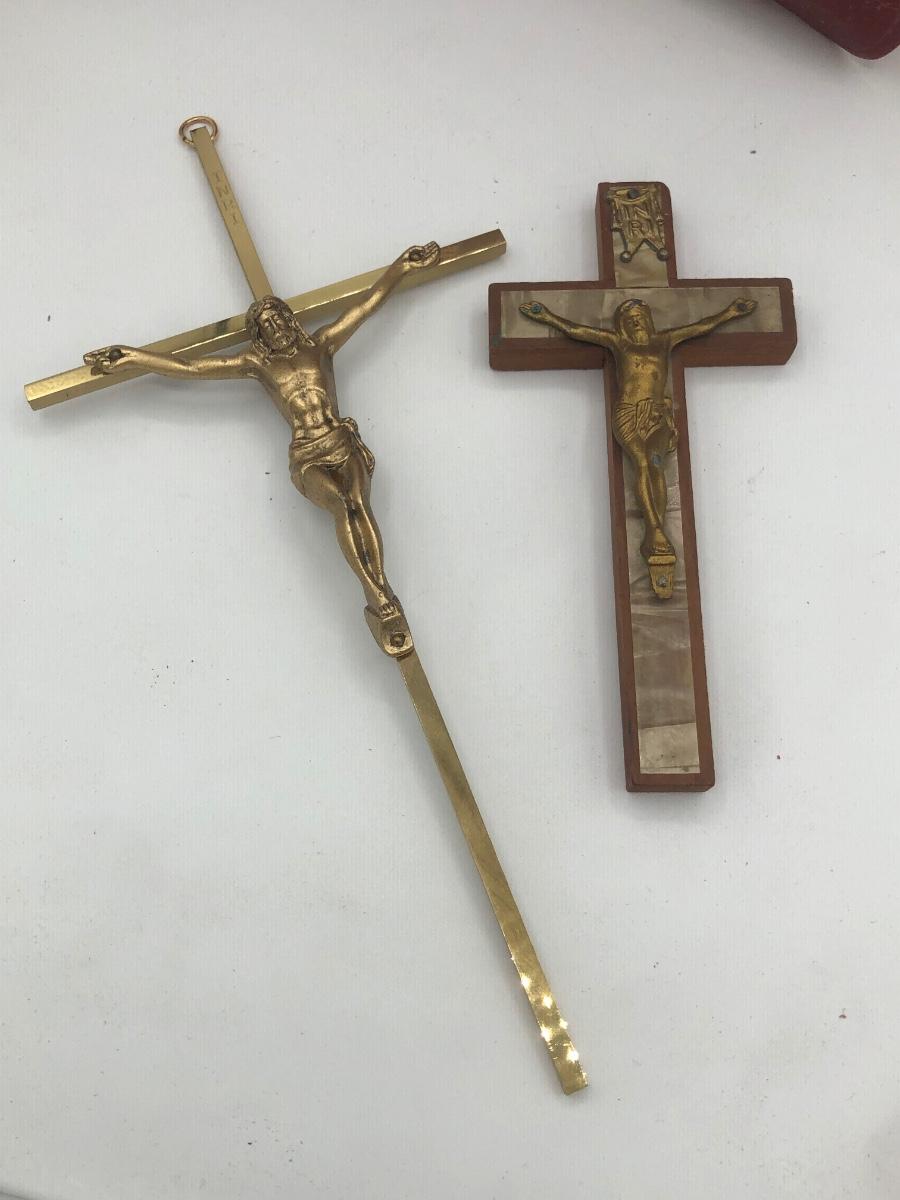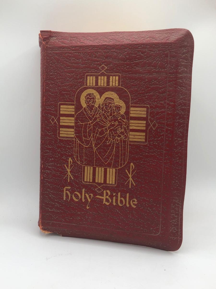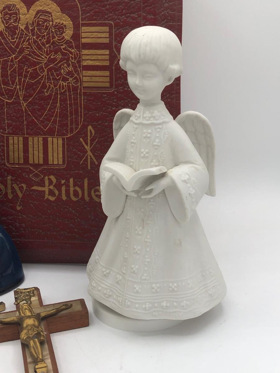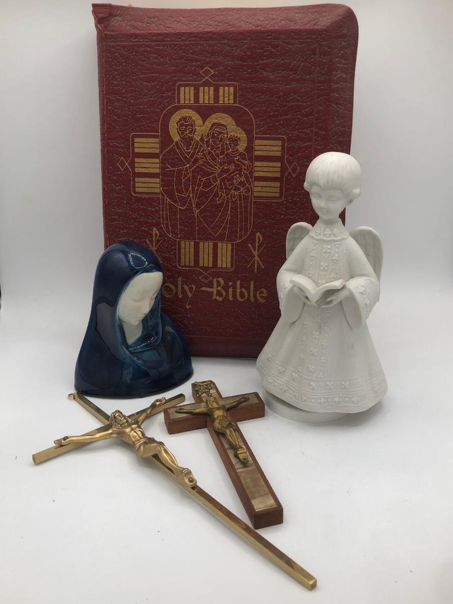 LOT 116K: Religious Collection - 1951 Holy Bible, Crucifixes, Mary Head Ceramic Figure & Musical Angel