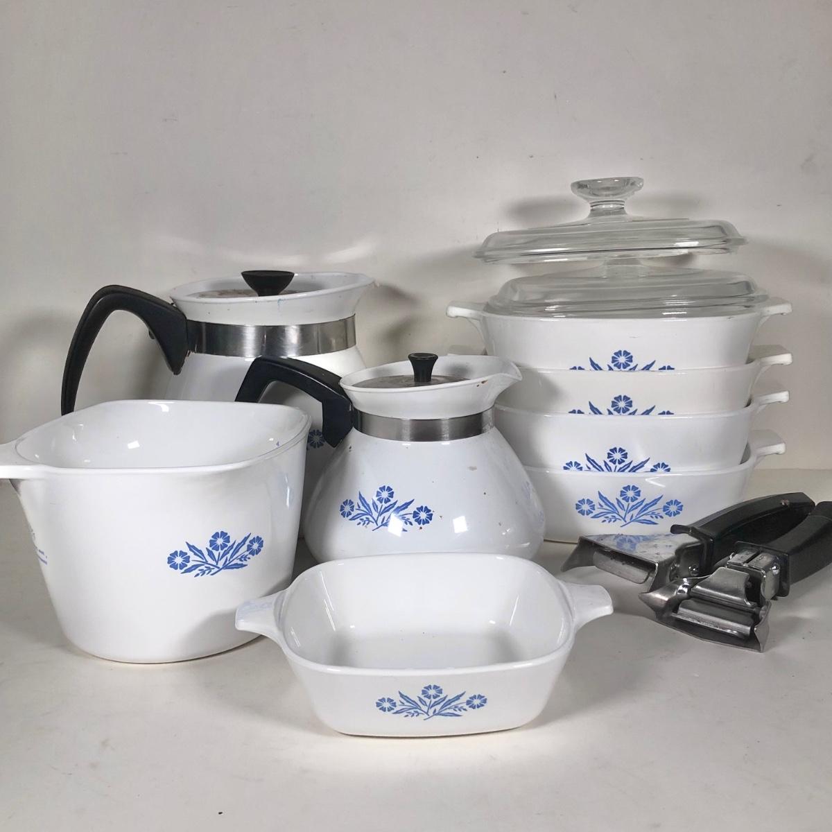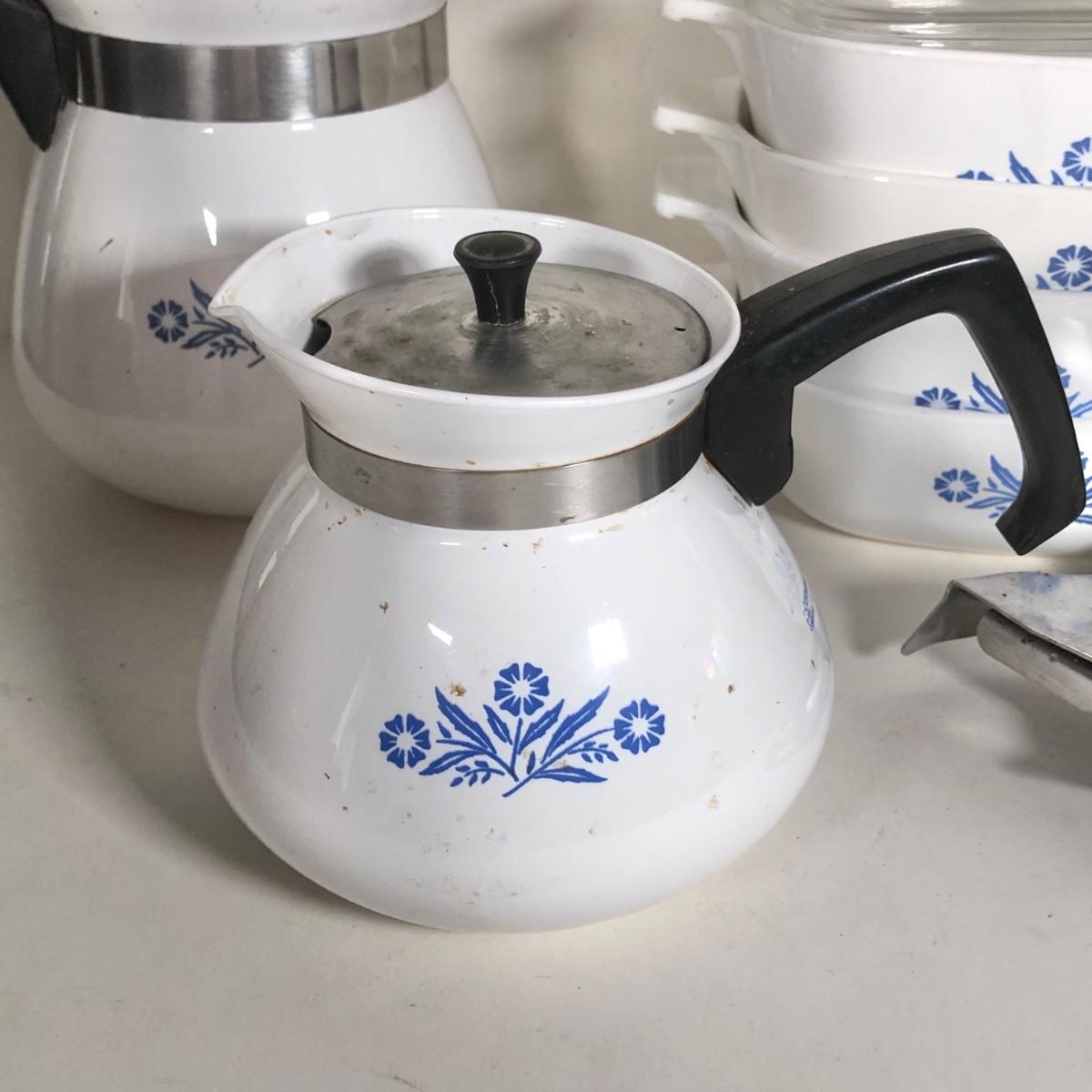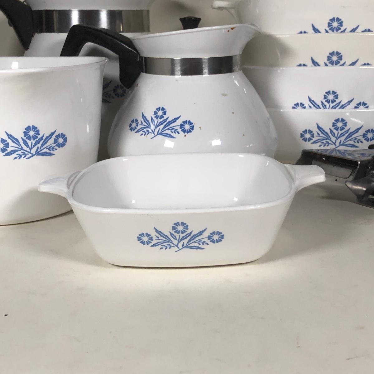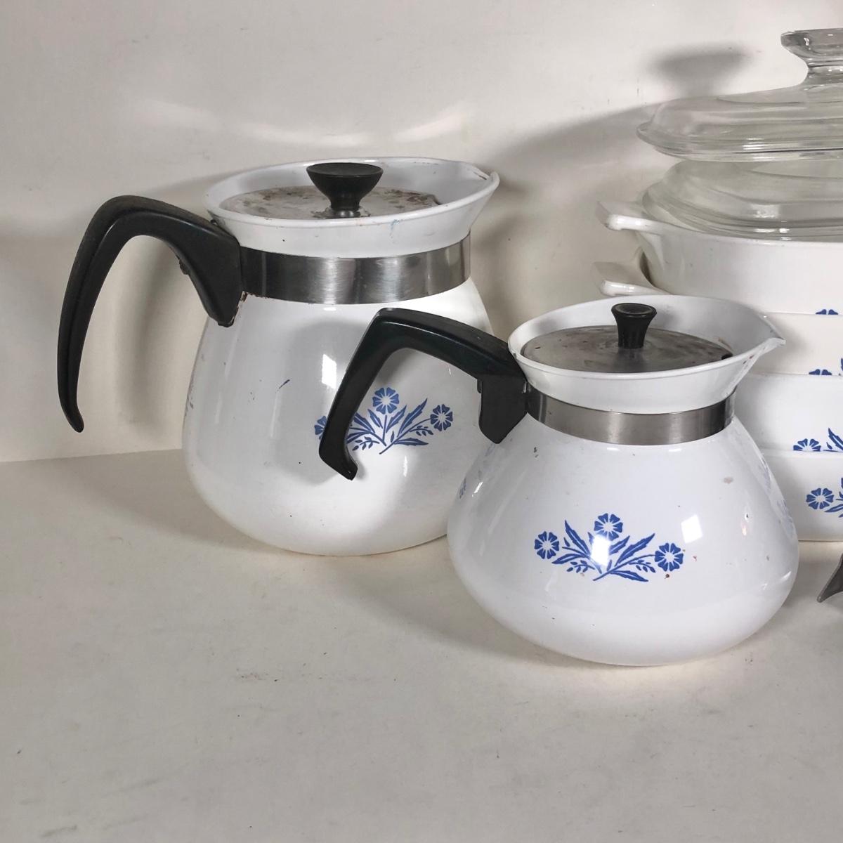 LOT 141K: Vintage Corningware Blur Cornflower Collection - Baking Dishes, Saucemaker & Coffee Pots