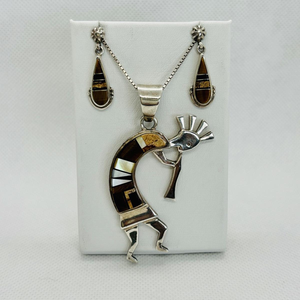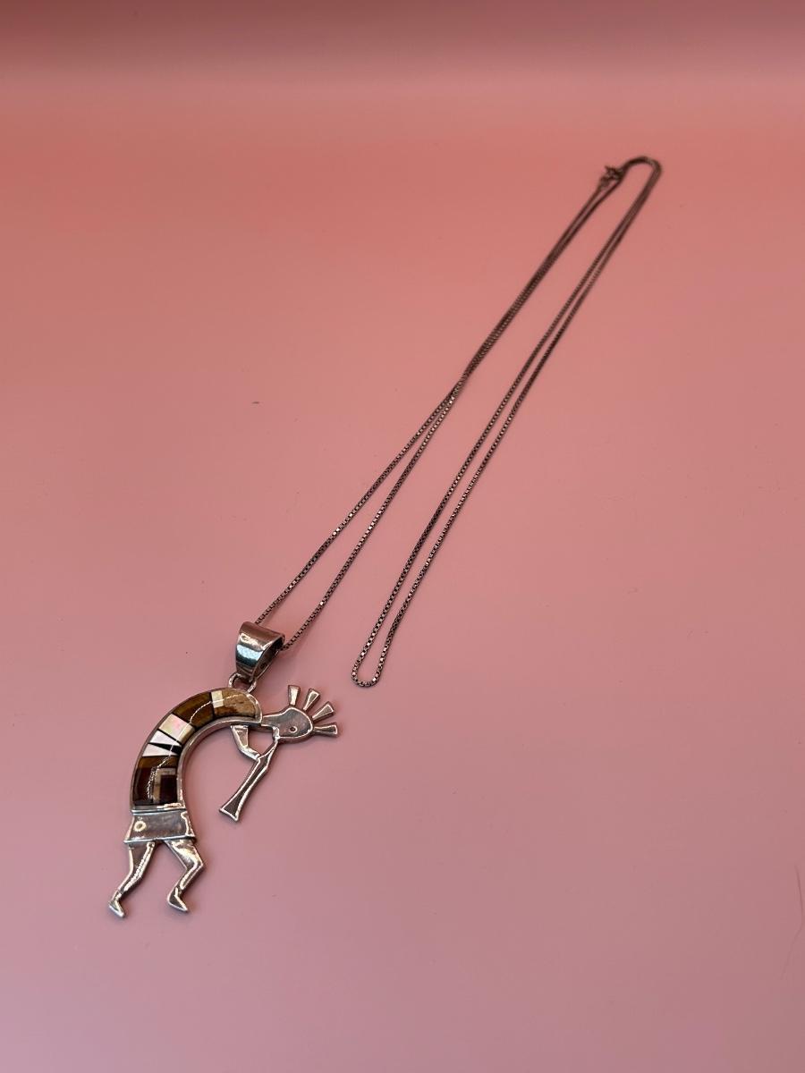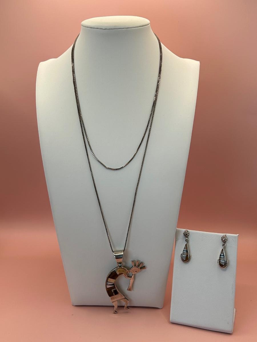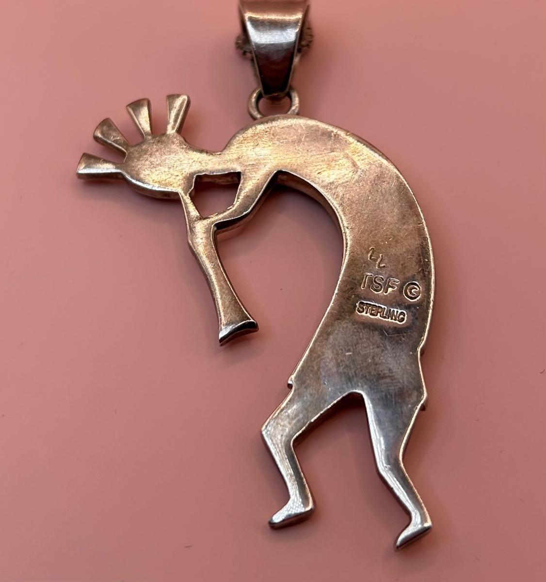 LOT 145J: Sterling Silver 30" Chain w/ Pendant Signed TSF Kokopelli + Earrings by Rick Tolino