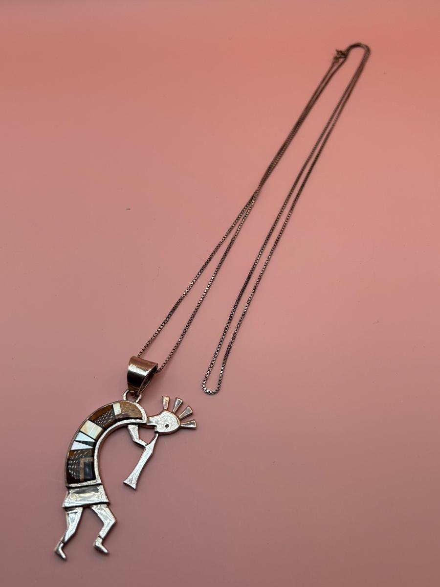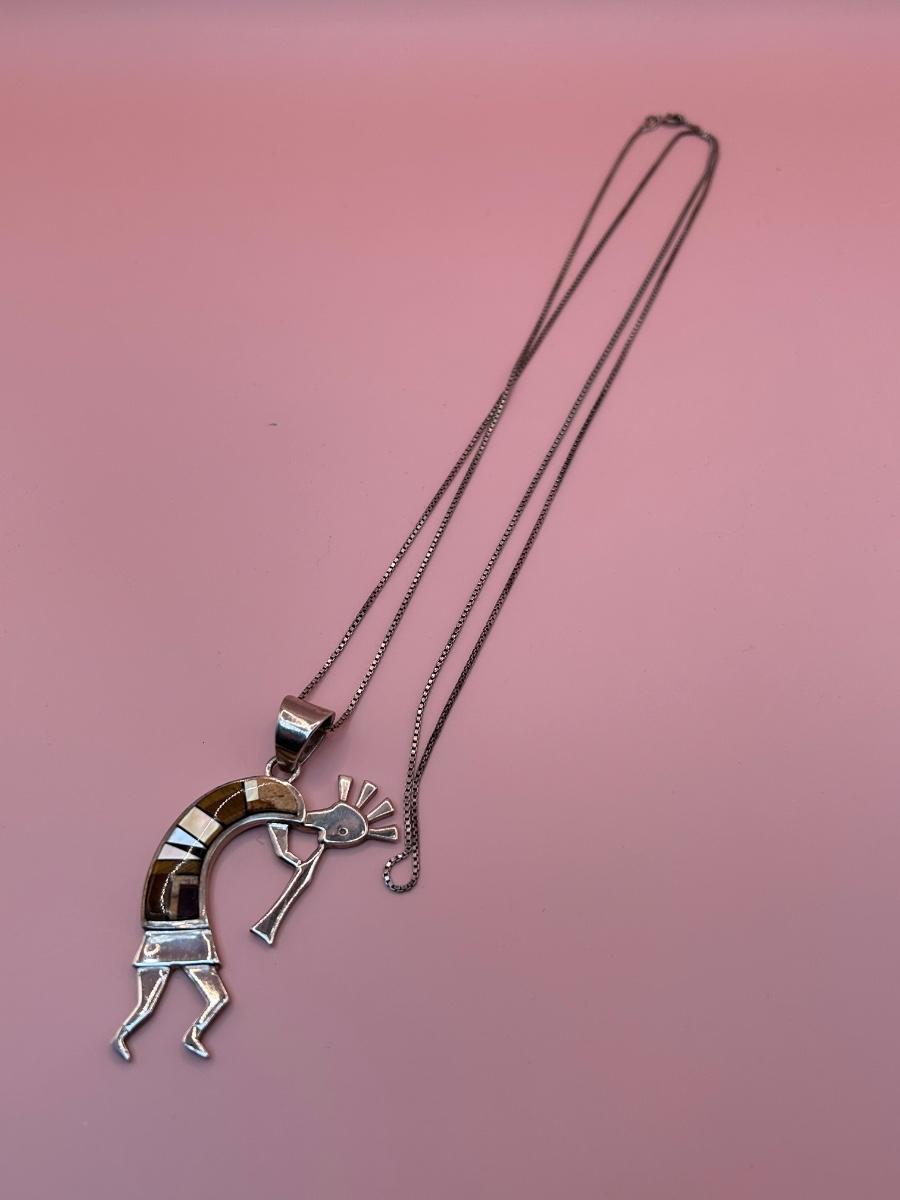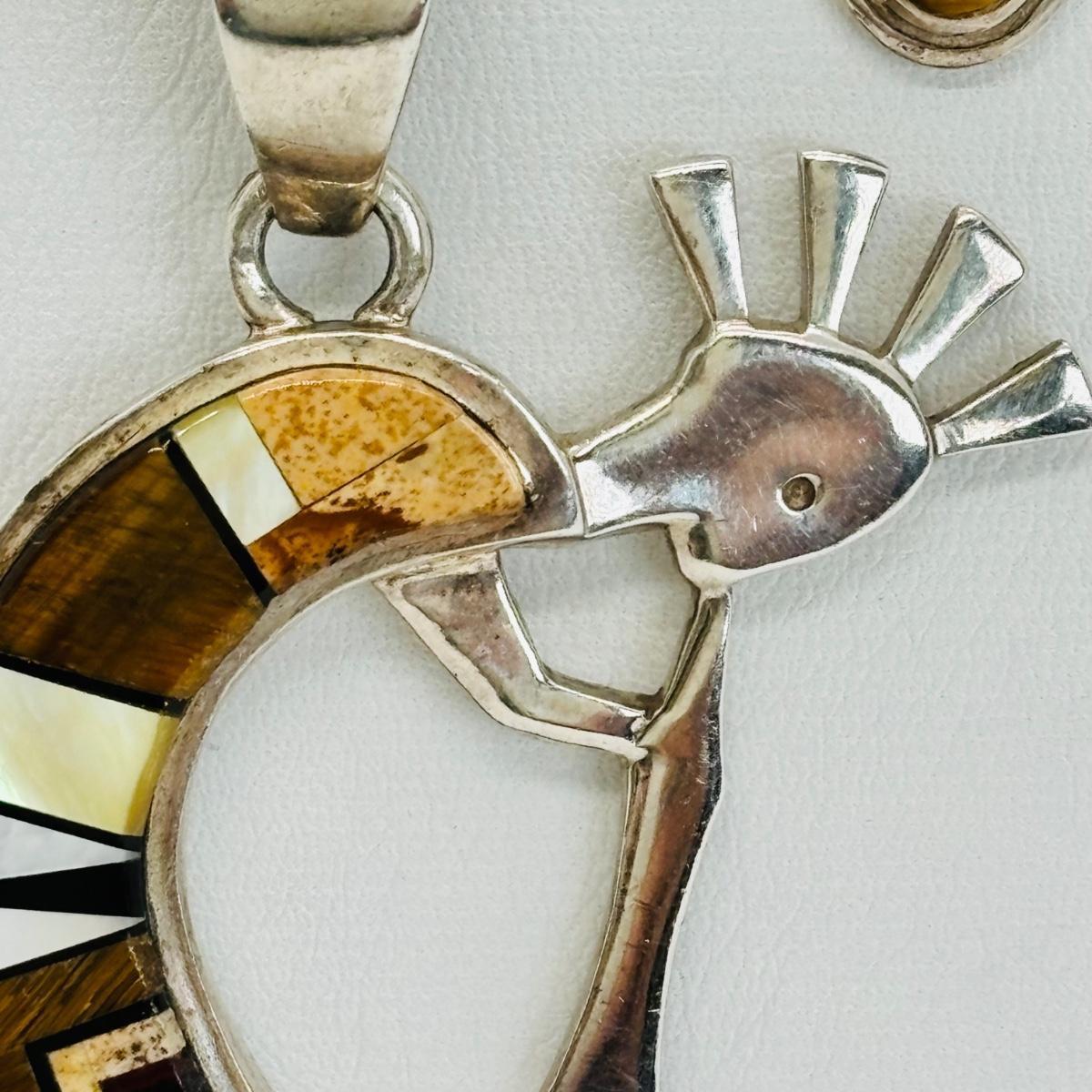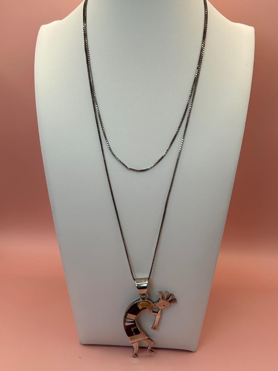LOT 145J: Sterling Silver 30" Chain w/ Pendant Signed TSF Kokopelli + Earrings by Rick Tolino