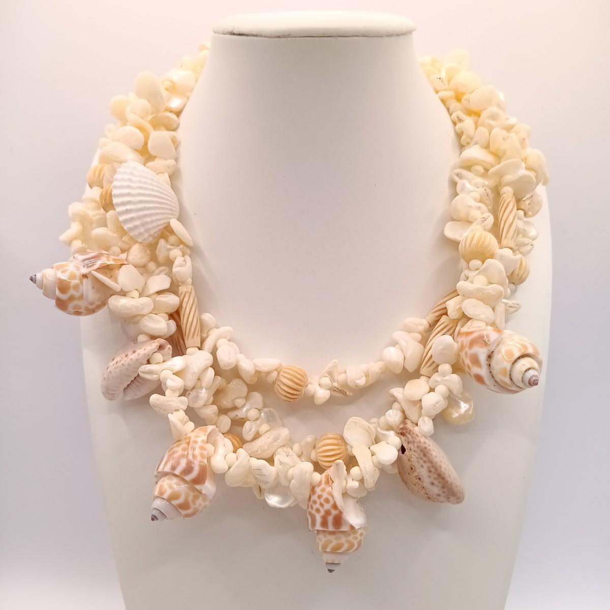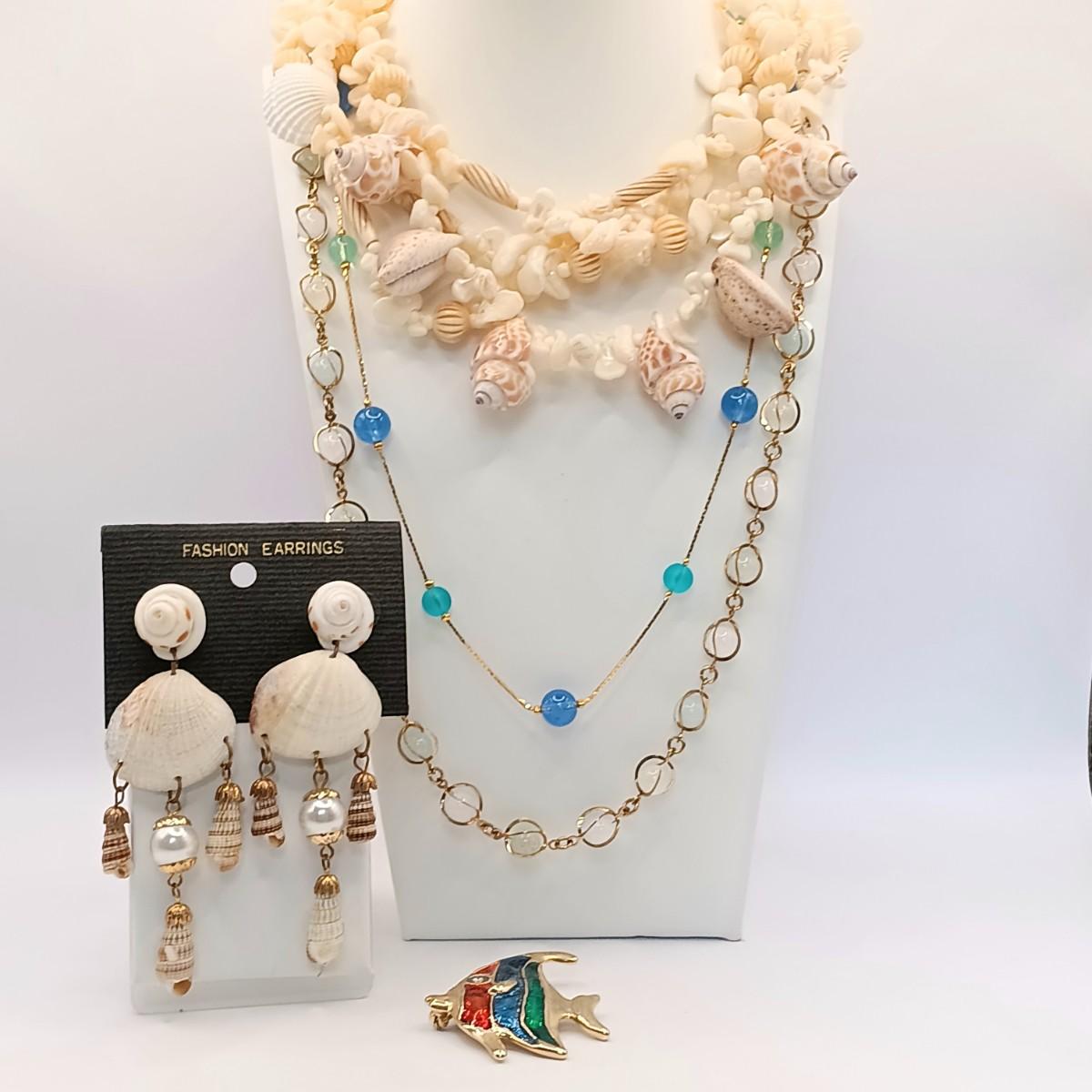 LOT 9: Trifari Gold-Tone Beaded Necklace, 'NLH' Enamel Fish Brooch, Shell Necklace & More
