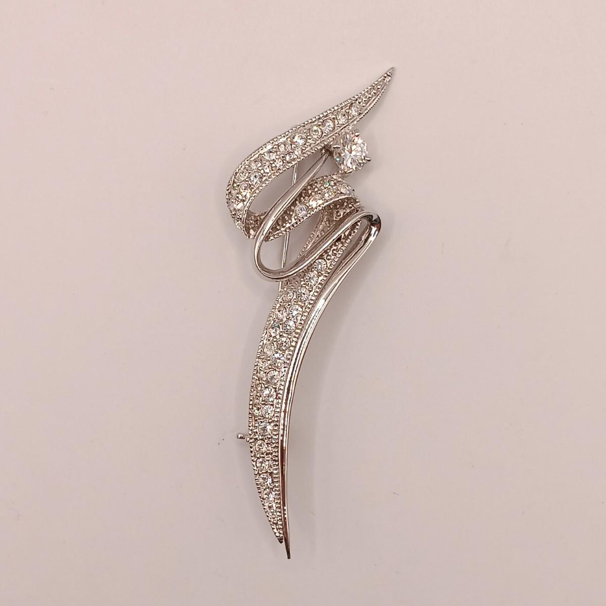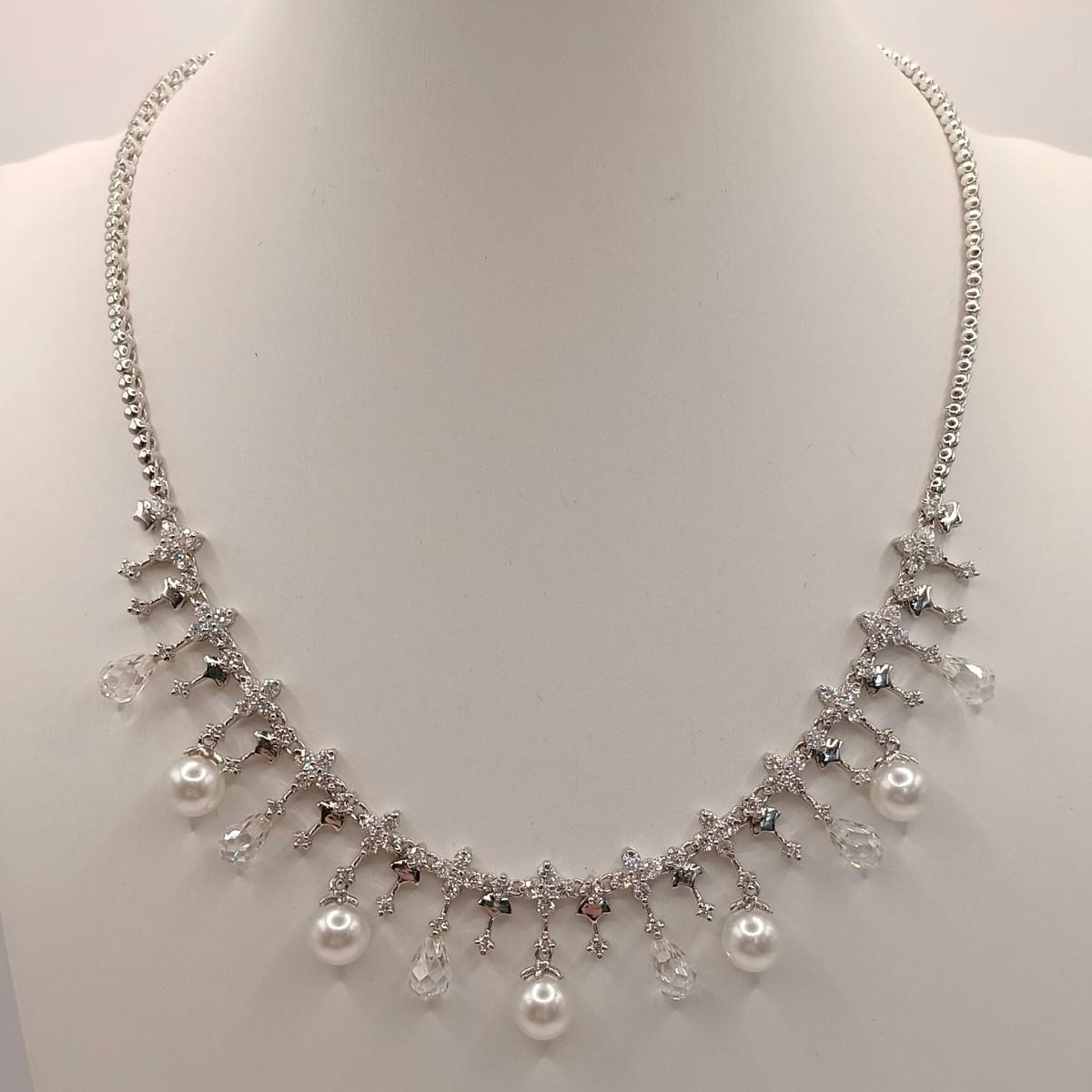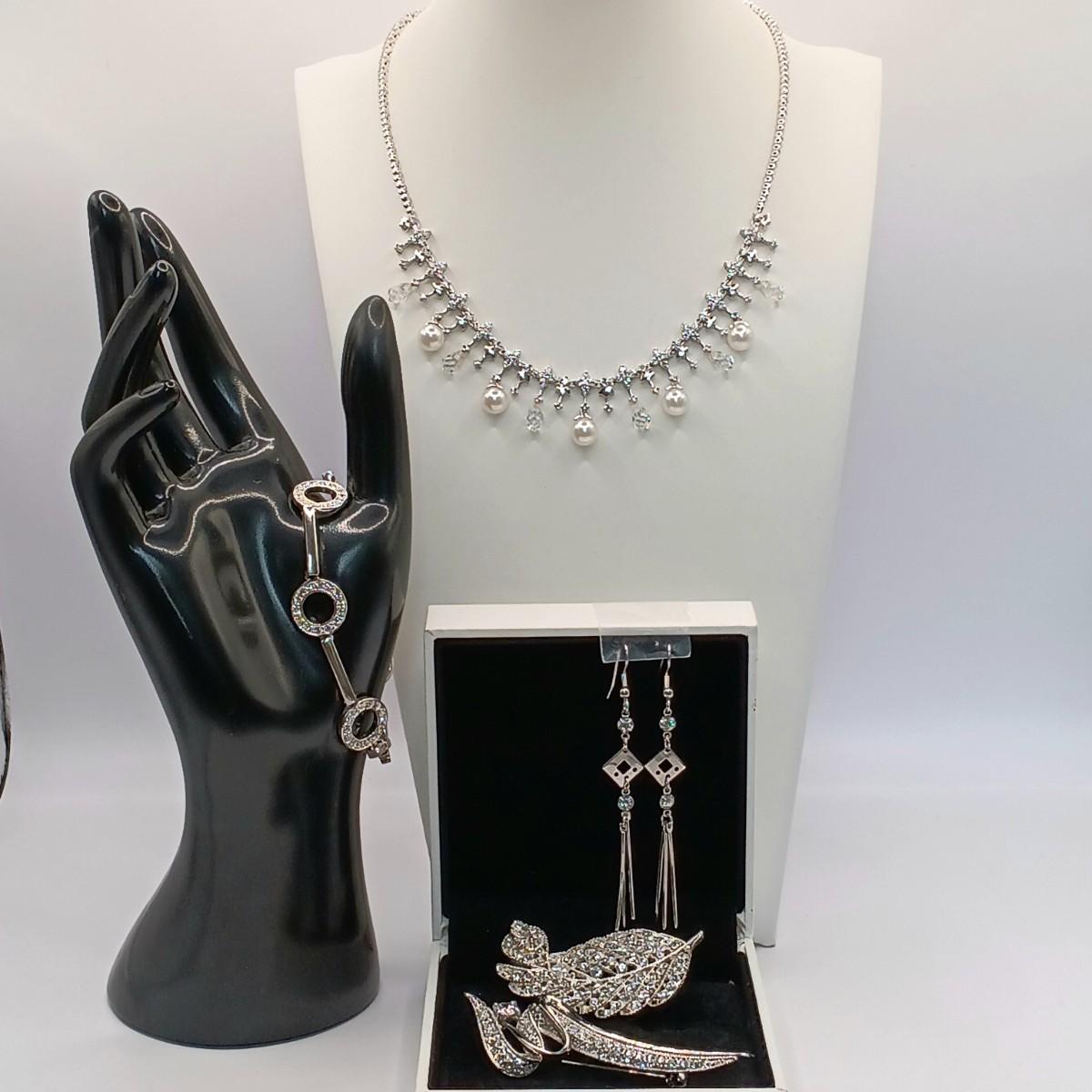 LOT 13: Vintage 925 Silver Pearl and Crystal Necklace with Silver-Tone Bracelet, Earrings and Broaches