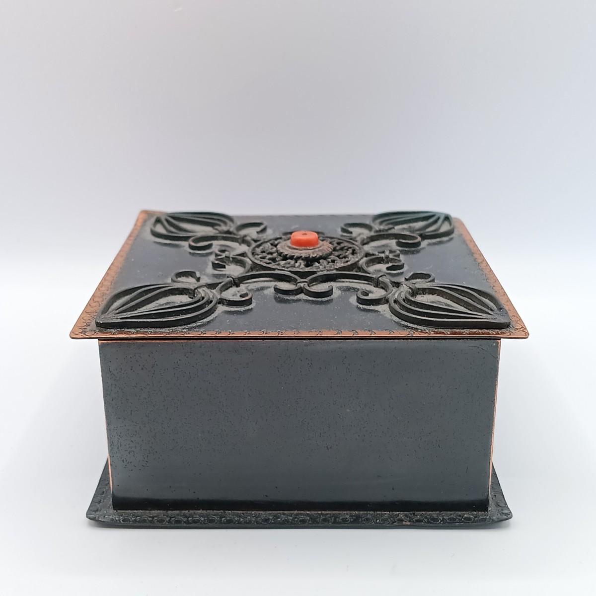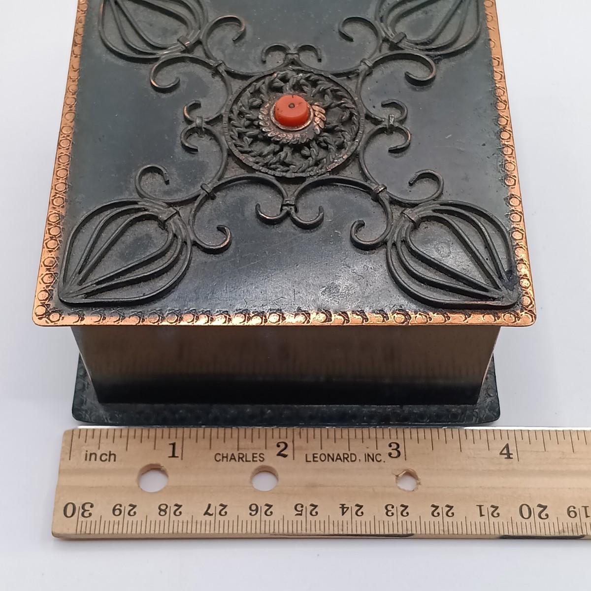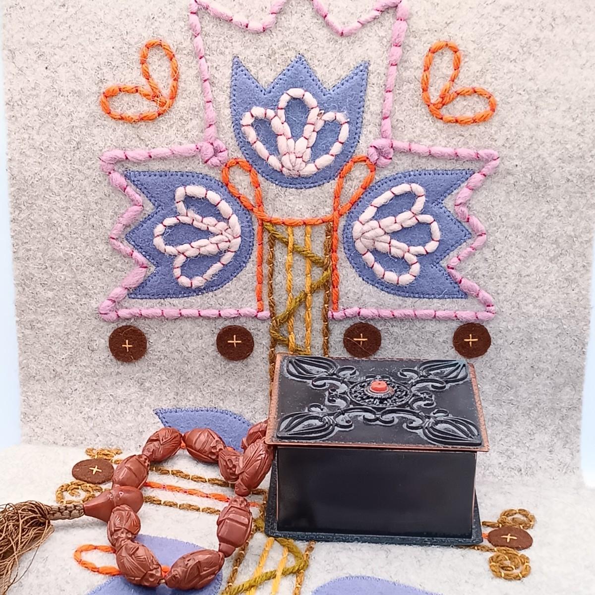 LOT 14: Wool Floral Tapestry, Metal Trinket Box and Carved Wood / Nut Prayer Beads