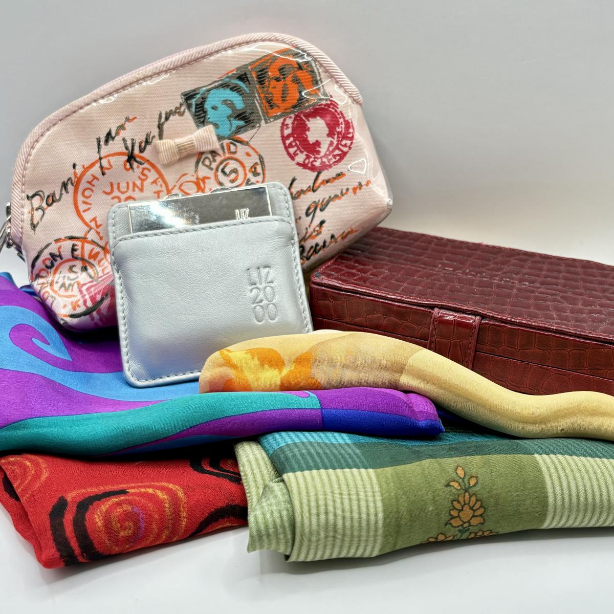 LOT 63: Liz Claiborne Collection: Scarves, Compact Mirror, Necklace/Earring Set & Accessory Pouch
