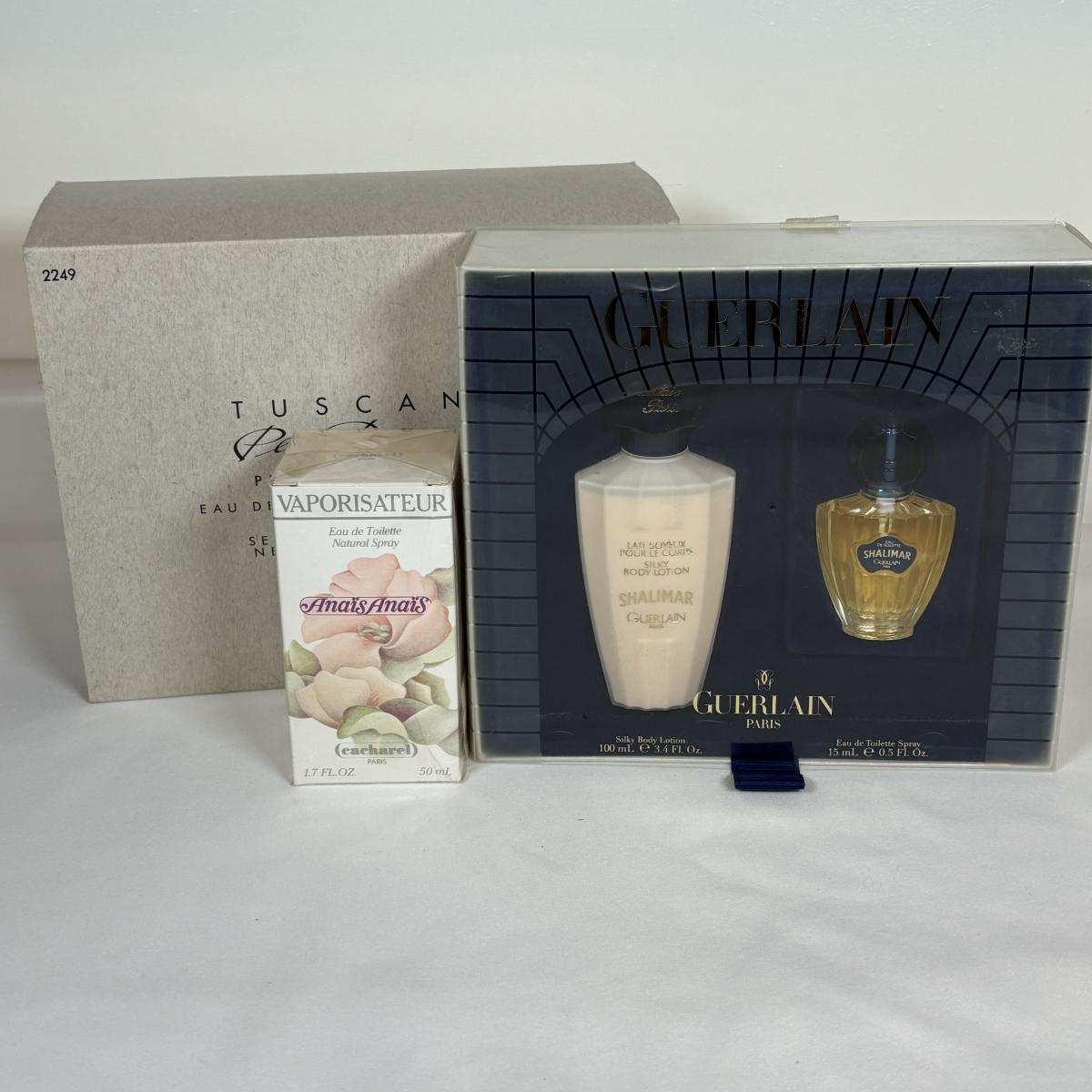 LOT 73: Guerlain Shalimar Box Set, Unopened Cacharel Anais Anais and Estee Lauder Tuscany Per Donna Collection
