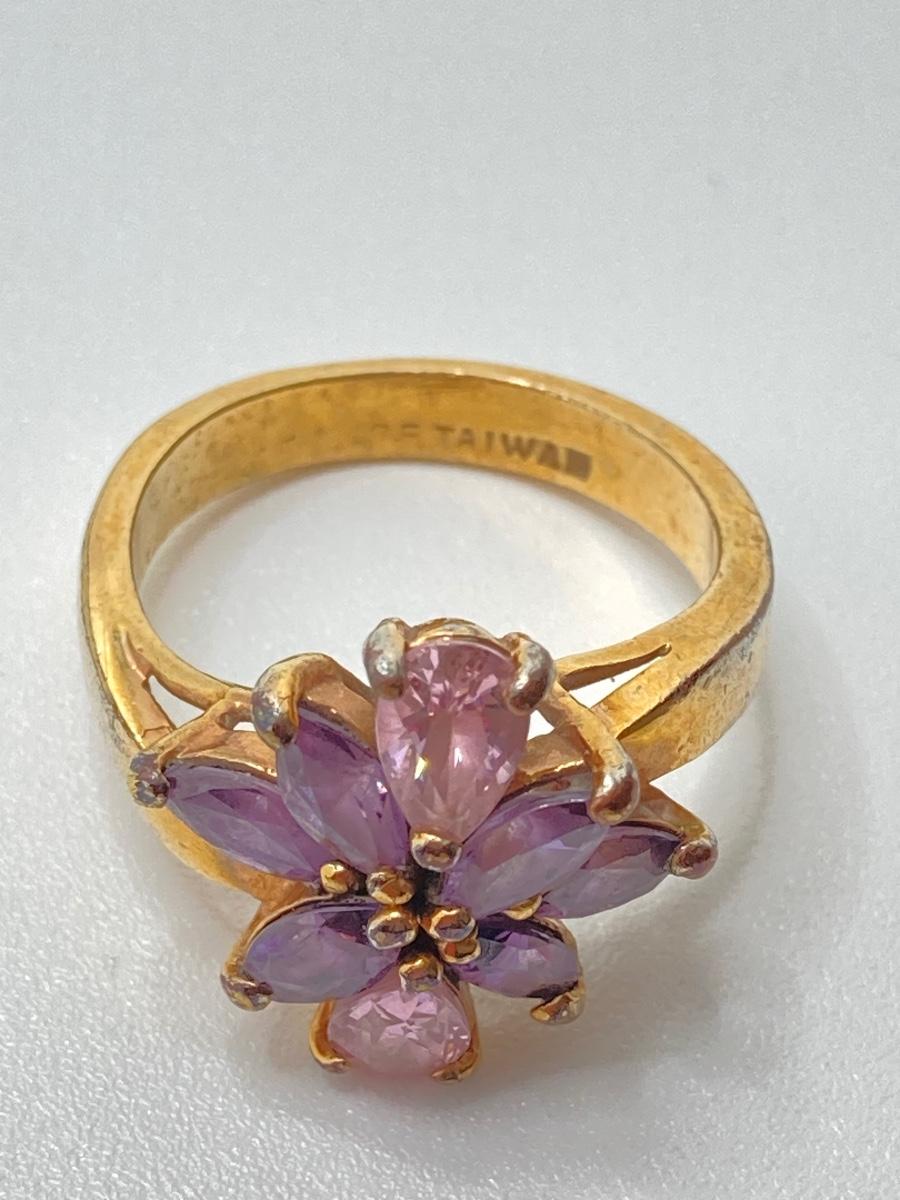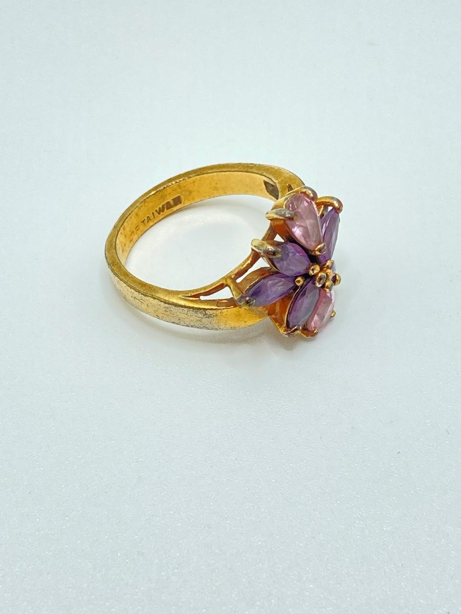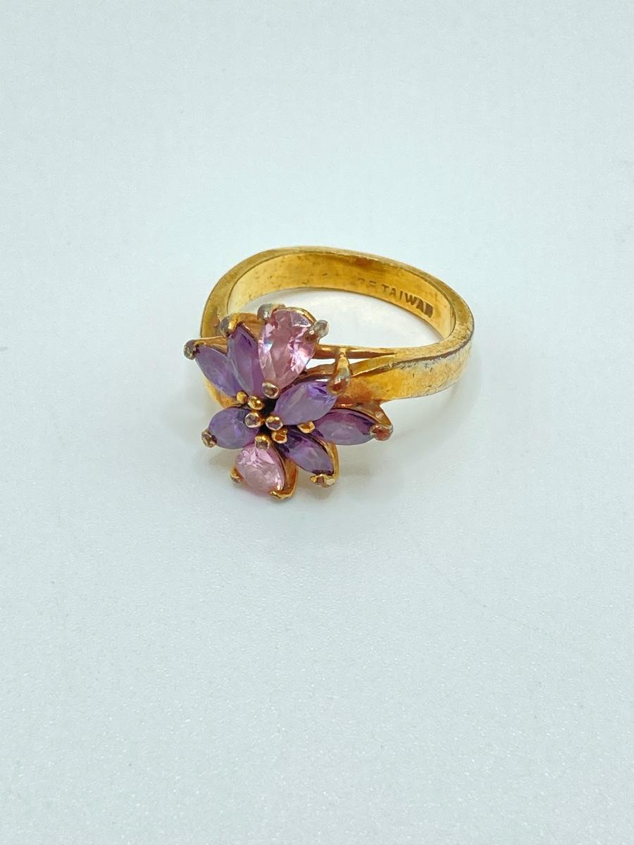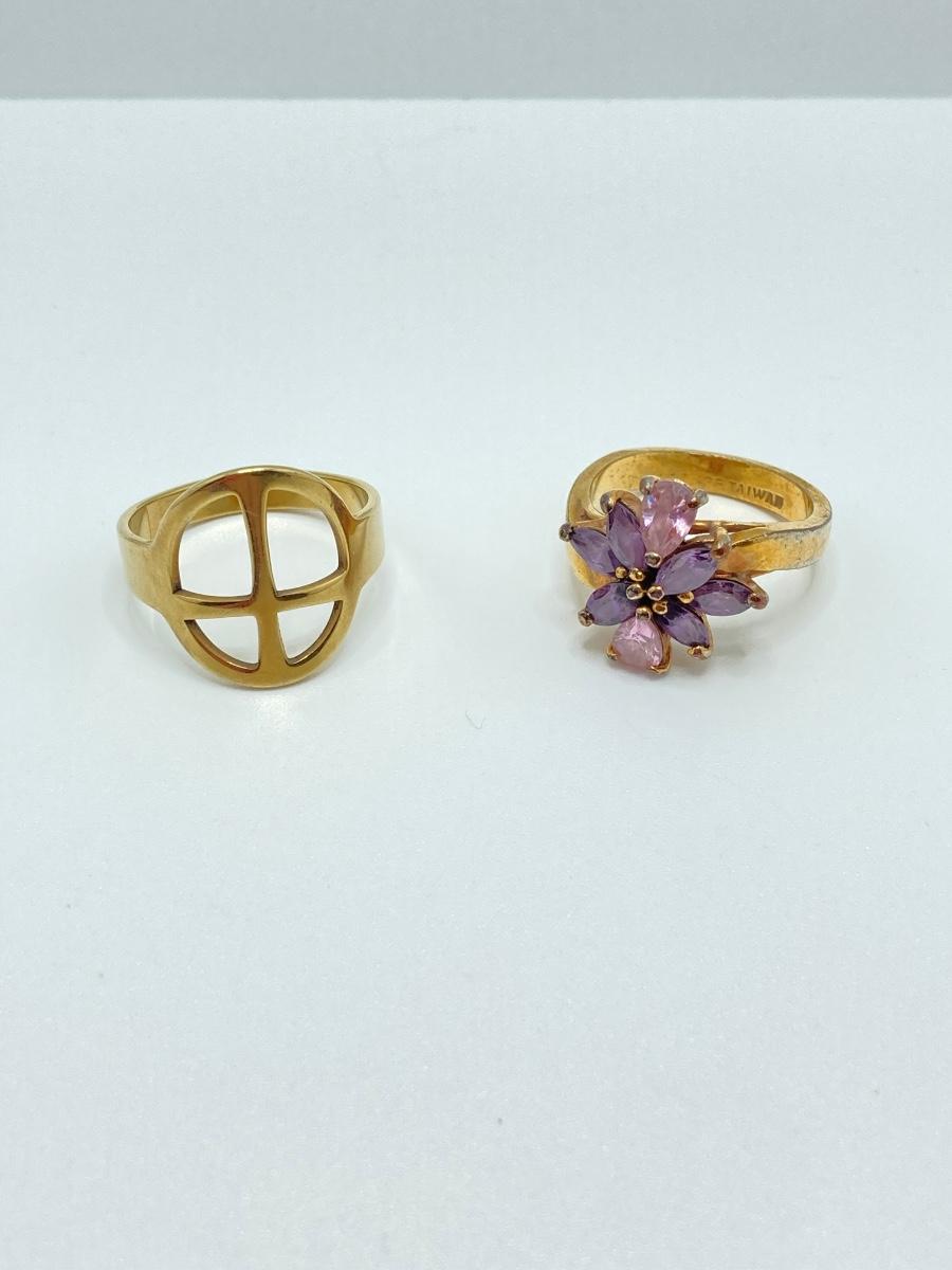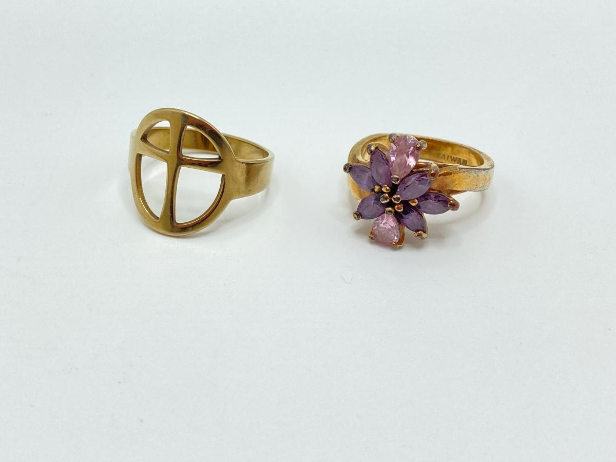 LOT 83: Pair of Gold Tone Fashion Rings - Taiwan Purple Flower Sz 7 and Cross Style Sz 8.5