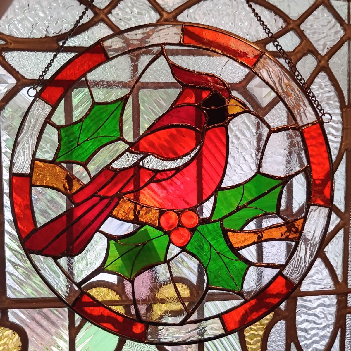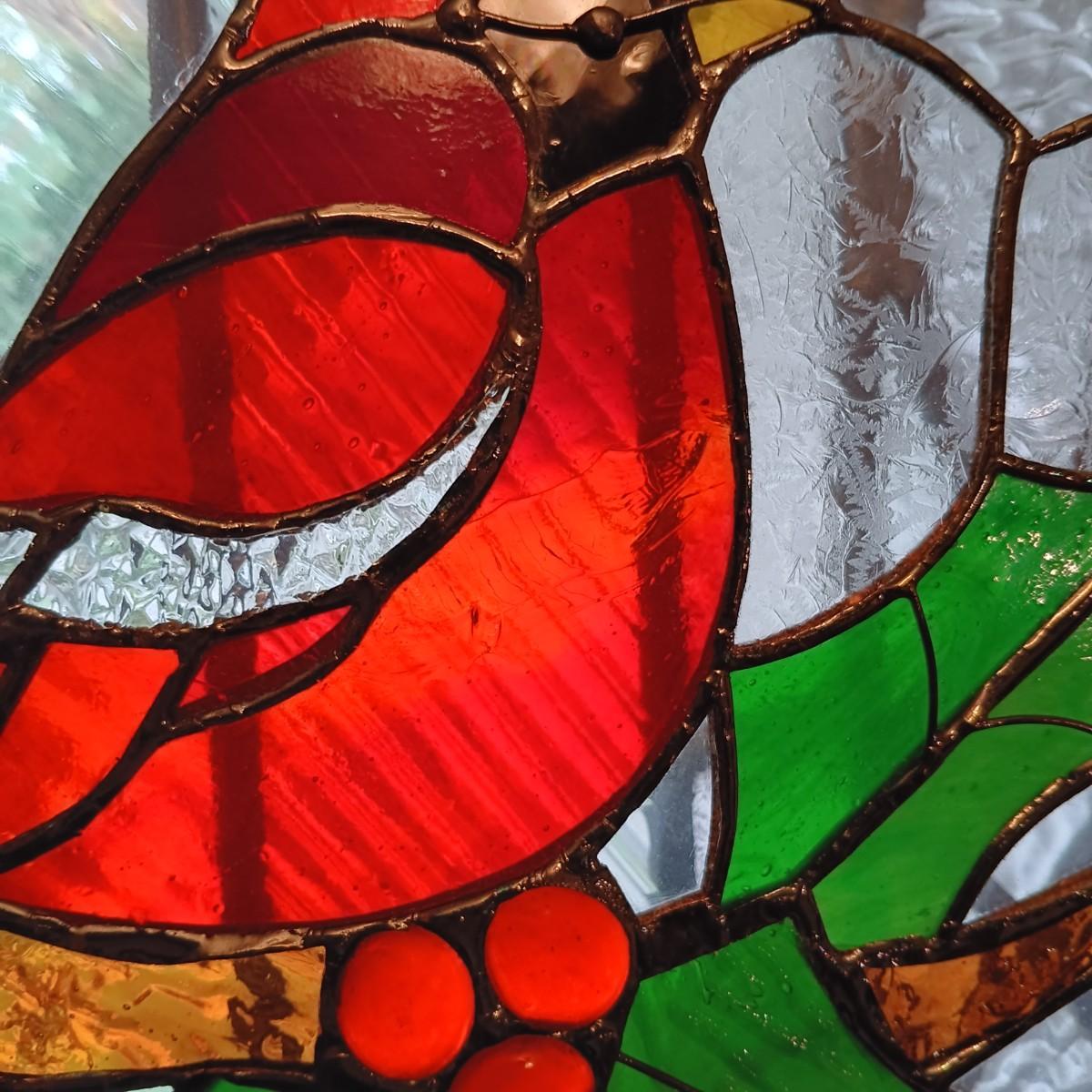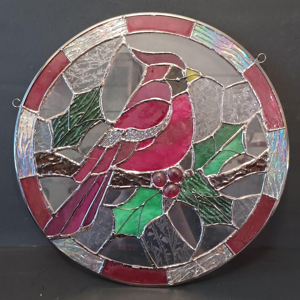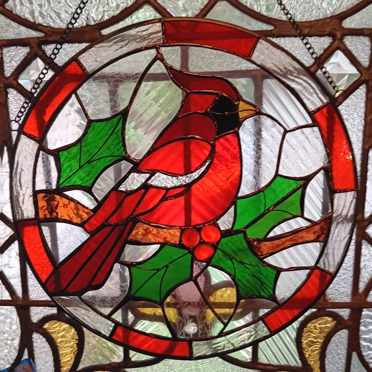 LOT 15: Cardinal and Holly Stained Glass Windows w/ Vintage Birds Planter & Gibson Elite Cardinal Holiday Plate