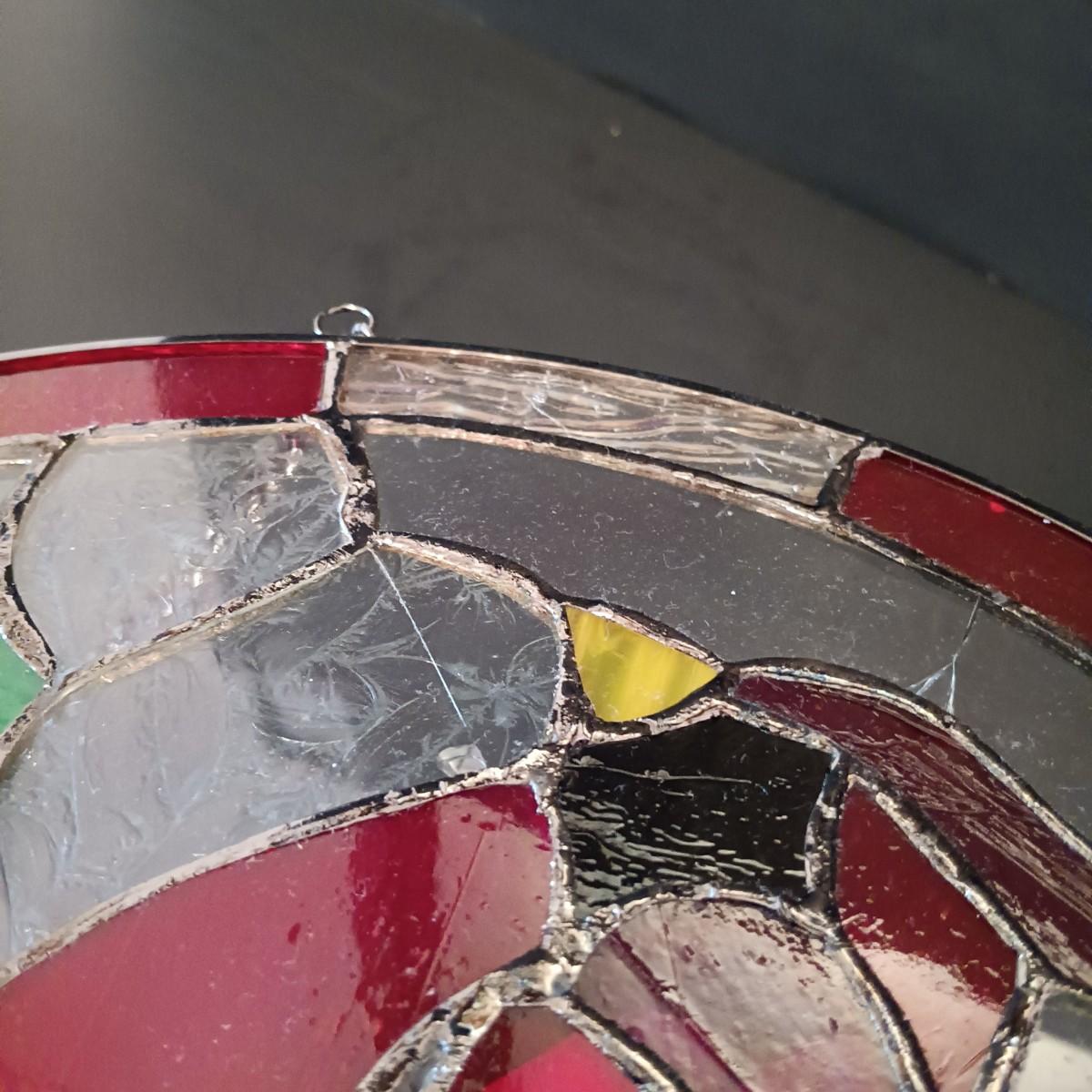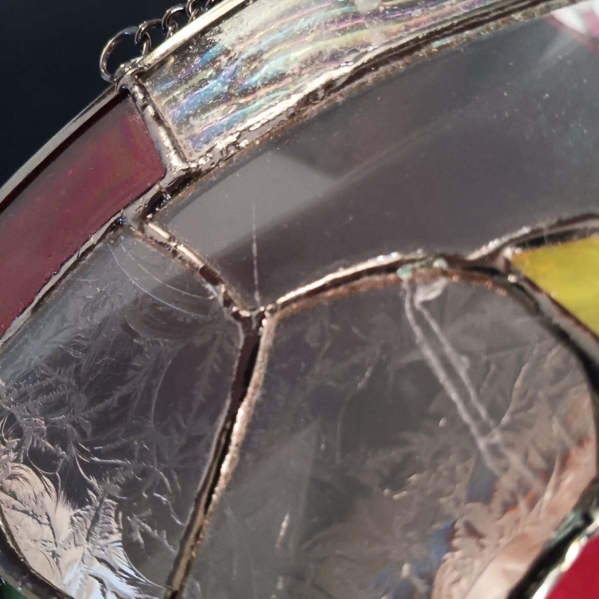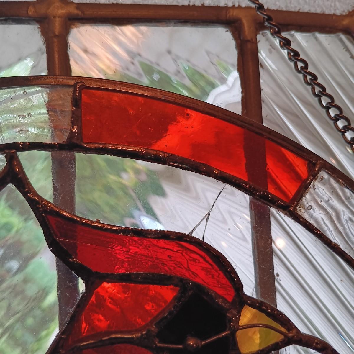 One of the Stained glass windows has a crack in it and the other has a scratch.