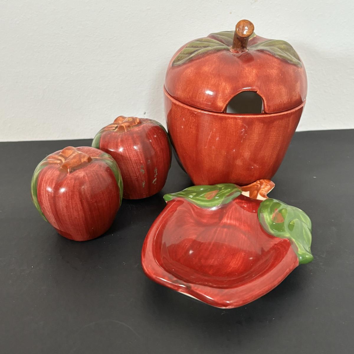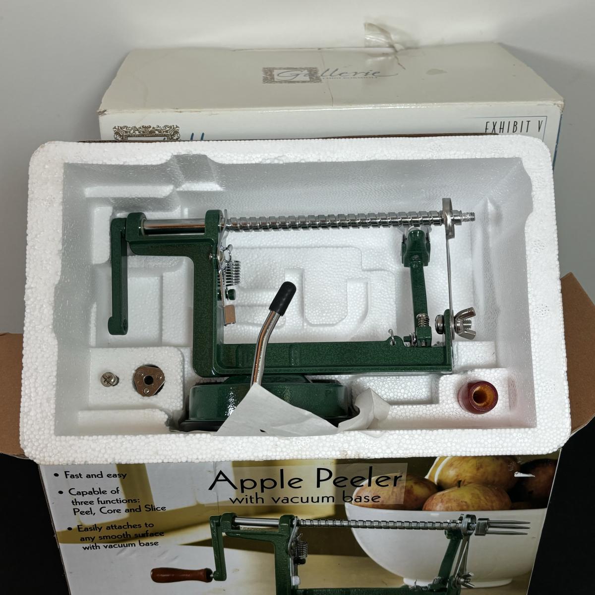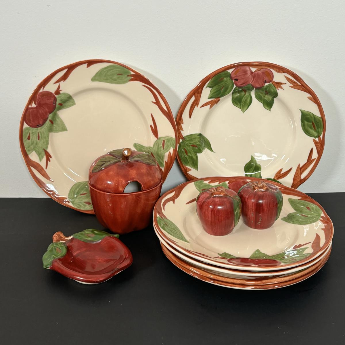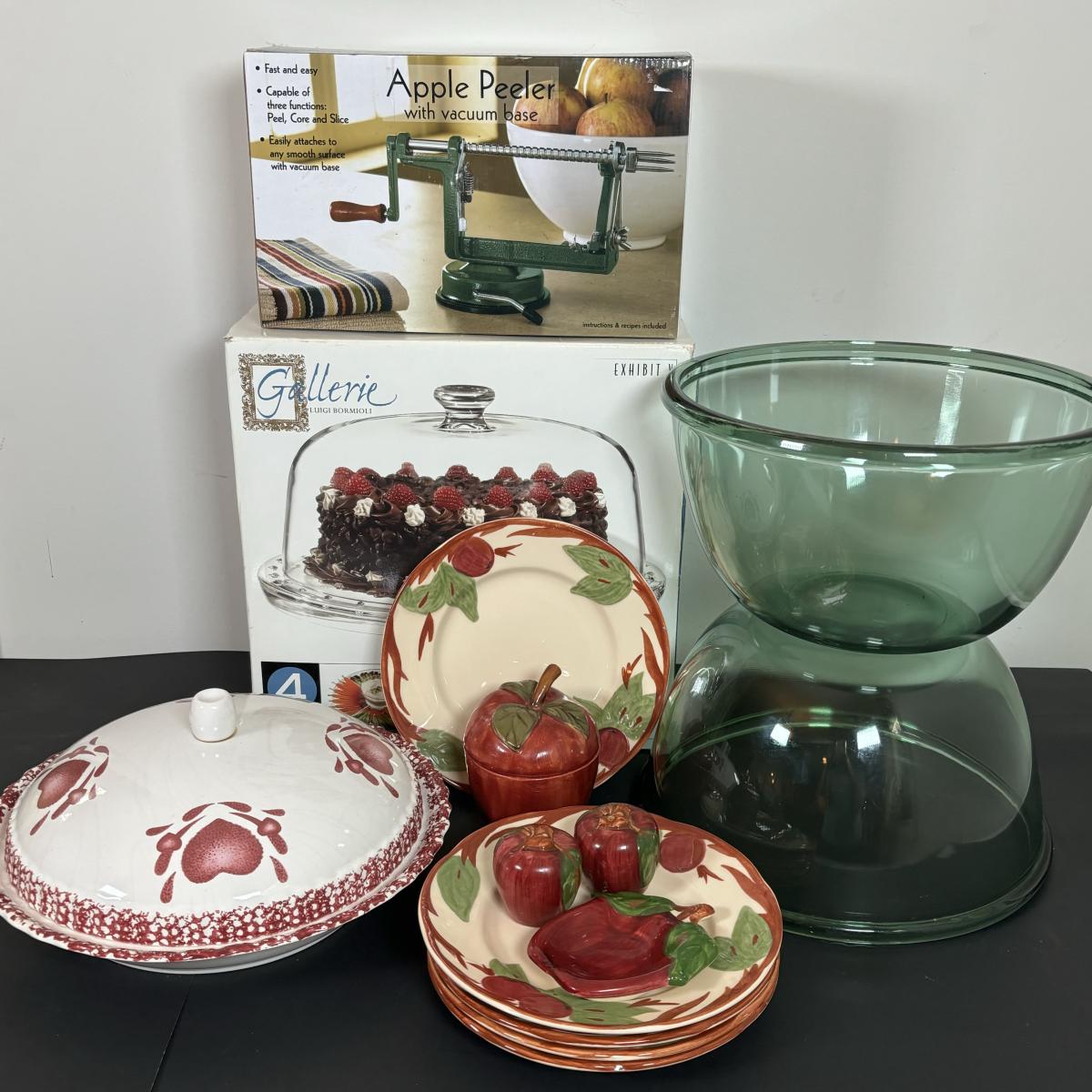 LOT 20: Apple Pie Time: Franciscan Apple Dessert Plates, Apple Peeler, Cover Pie Dish, NIB Galleri (4 use) Cake Dish & More