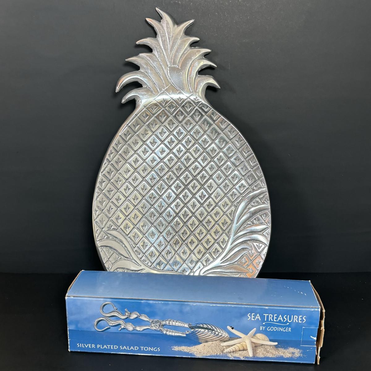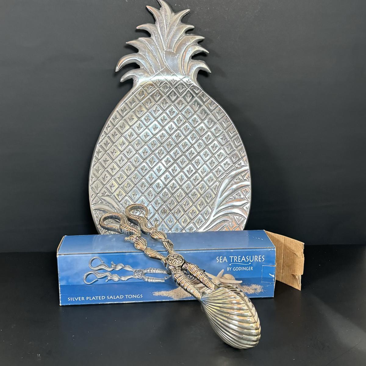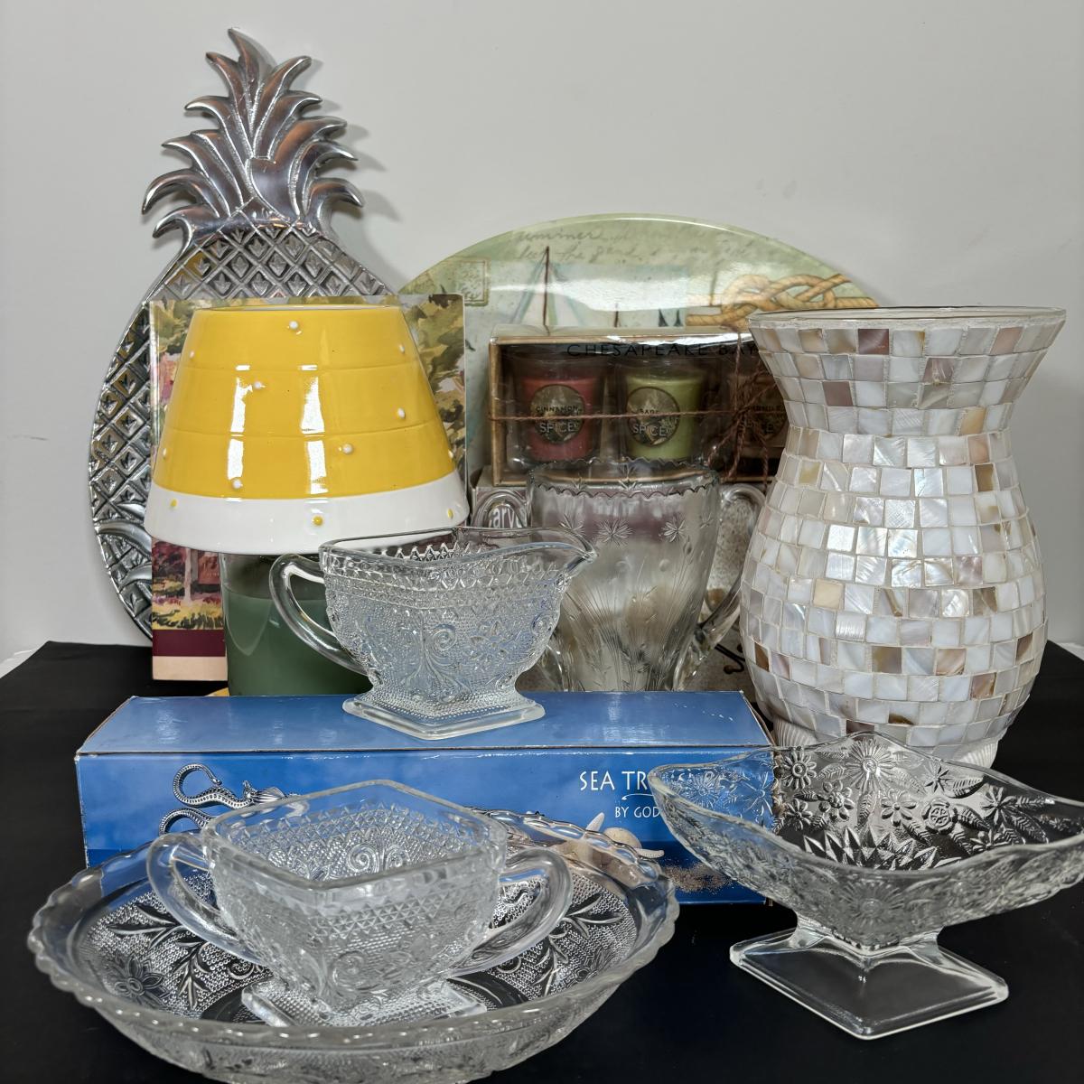 LOT 21: Home Decor/Serving Collection NIB Godinger Sea Treasures Serving/Salad Tongs, Pineapple Serving Platter, Mosaic Vase, NIB Nautical Hooks, Pressed Glass & More