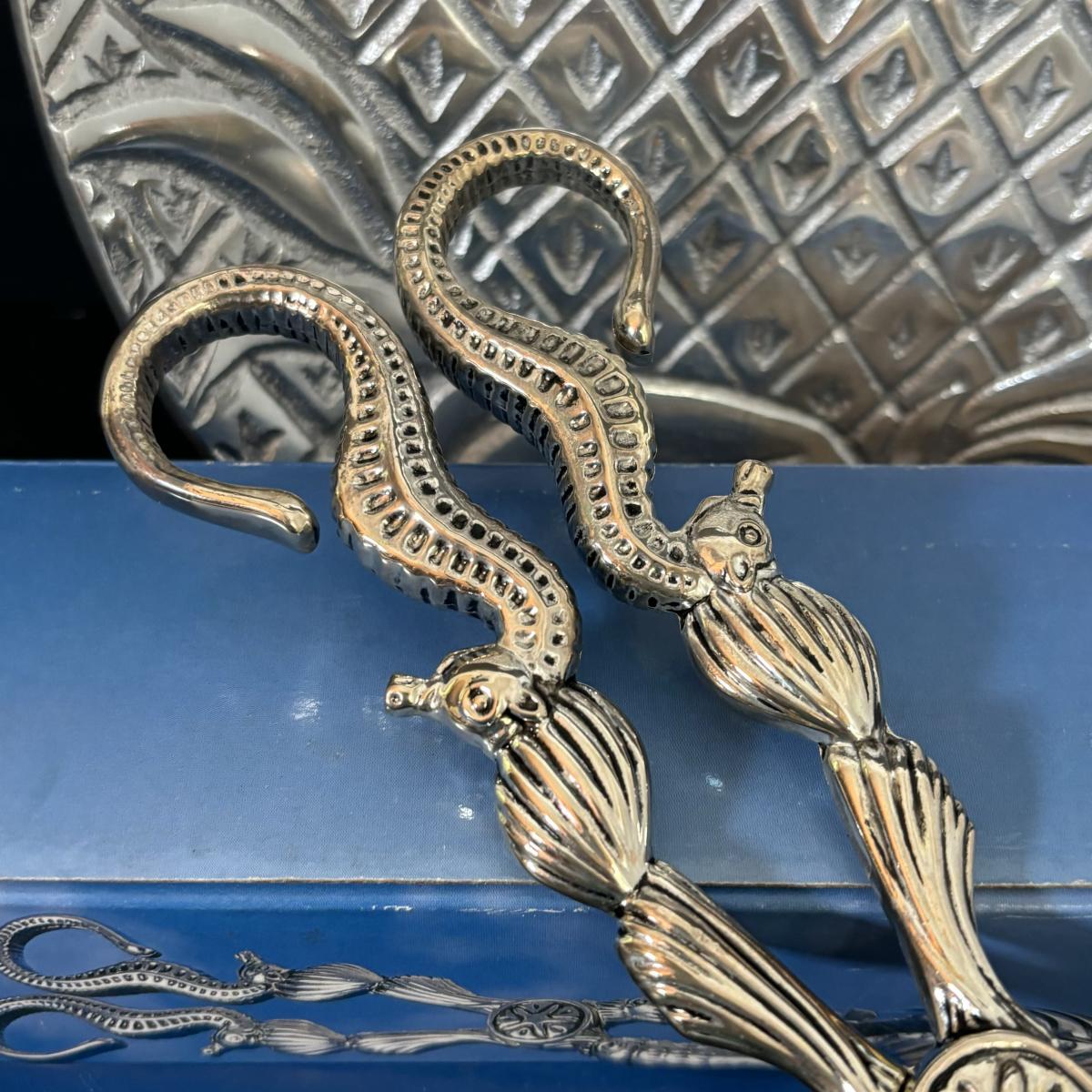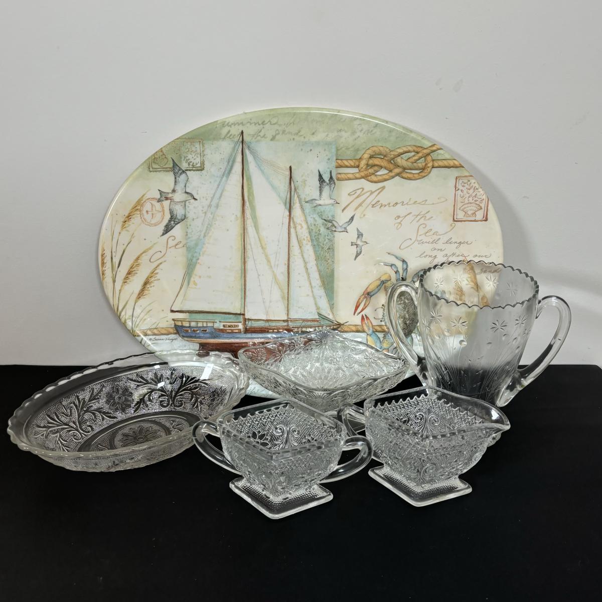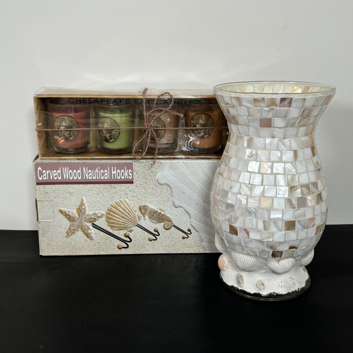 LOT 21: Home Decor/Serving Collection NIB Godinger Sea Treasures Serving/Salad Tongs, Pineapple Serving Platter, Mosaic Vase, NIB Nautical Hooks, Pressed Glass & More