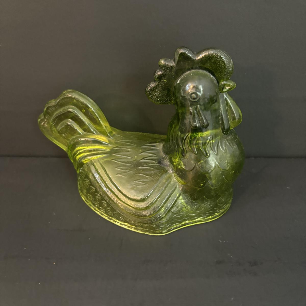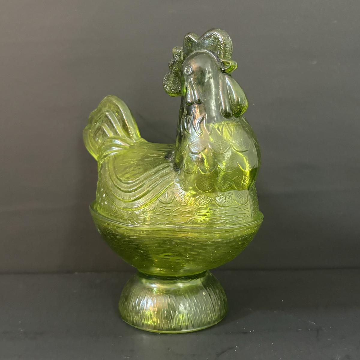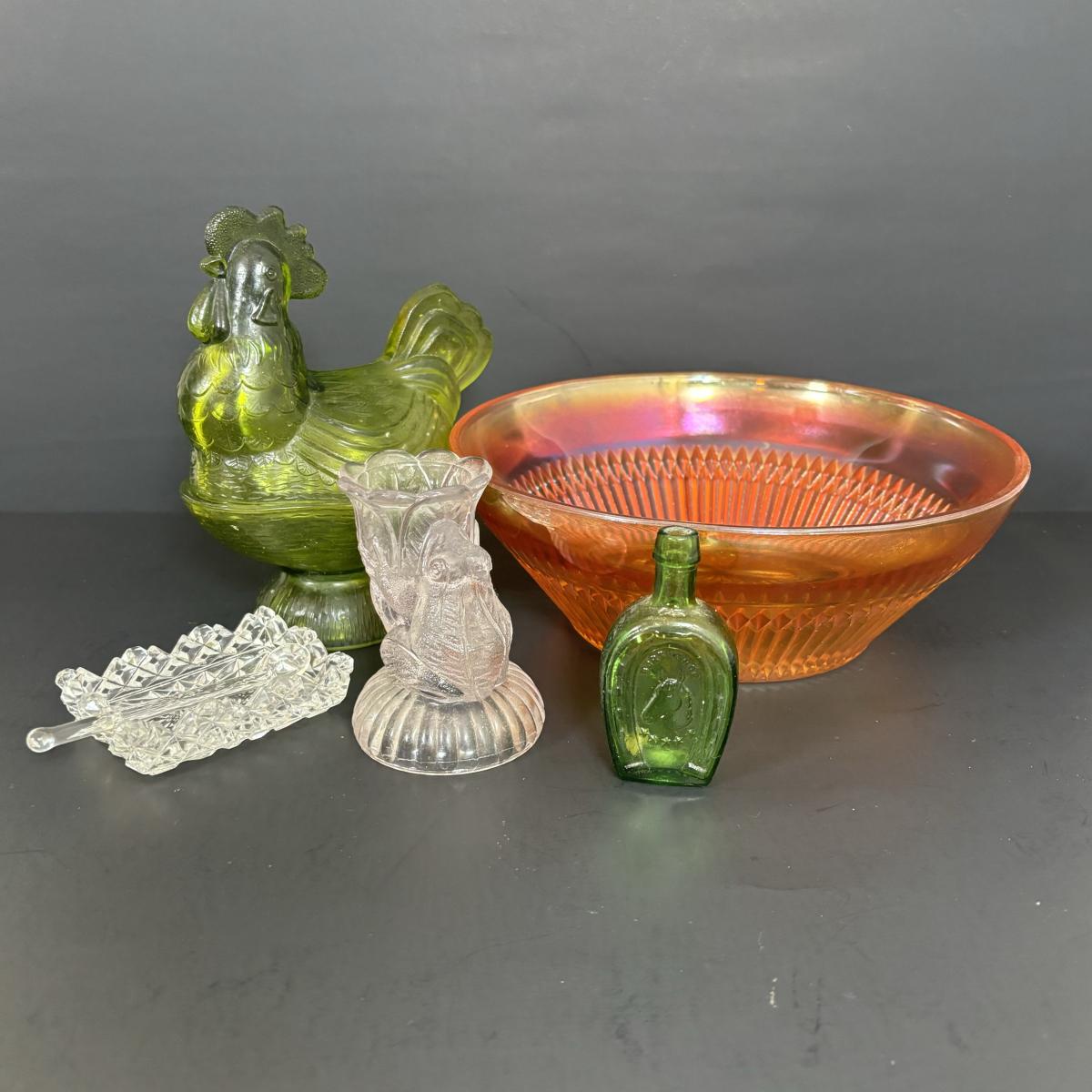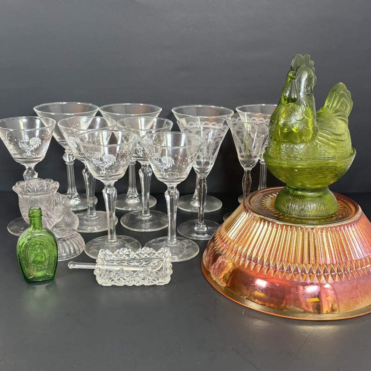 LOT 22: Vintage Olive Green Glass Rooster on Nest Dish, Vintage Libbey Rooster Chanticleer Glasses (5), Pressed Glass Frog on Lilypad Toothpick Holder, Carnival Glass & More