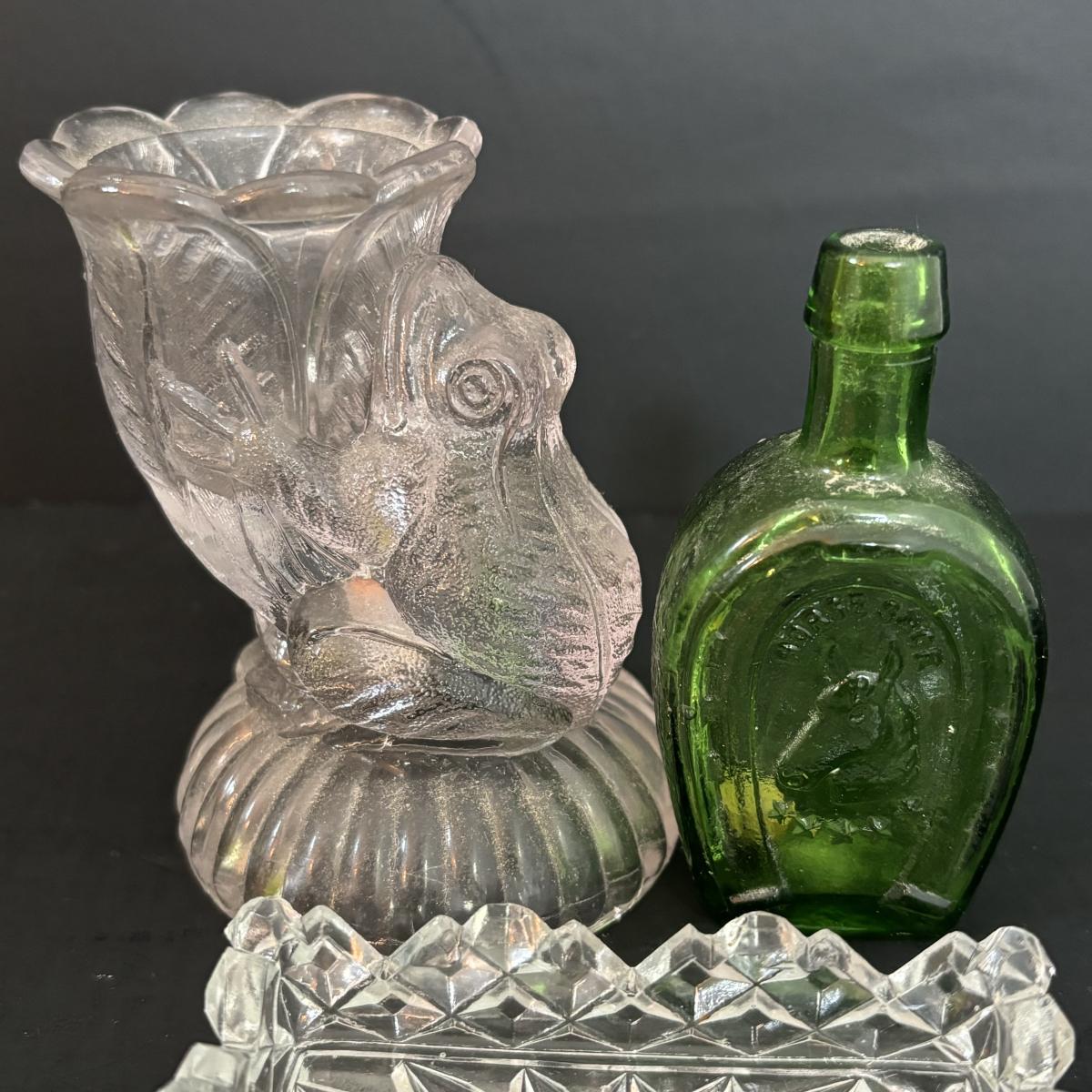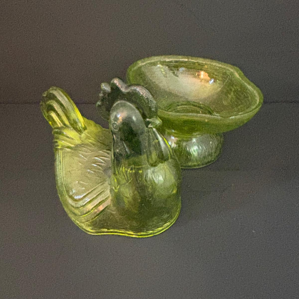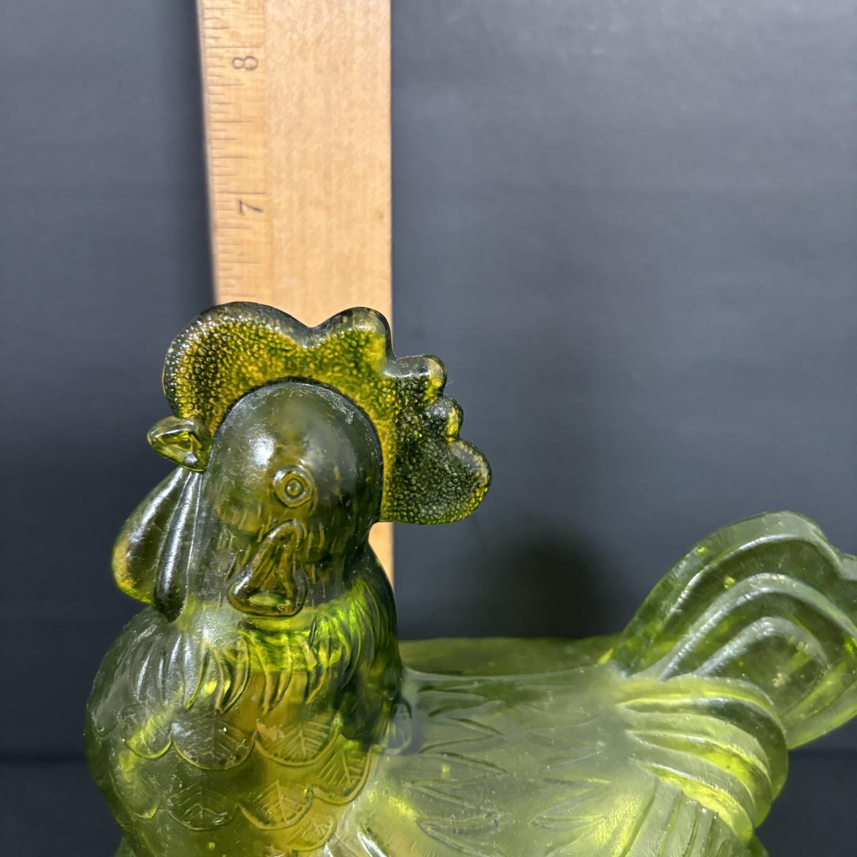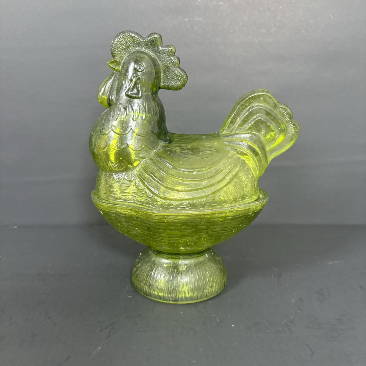 LOT 22: Vintage Olive Green Glass Rooster on Nest Dish, Vintage Libbey Rooster Chanticleer Glasses (5), Pressed Glass Frog on Lilypad Toothpick Holder, Carnival Glass & More