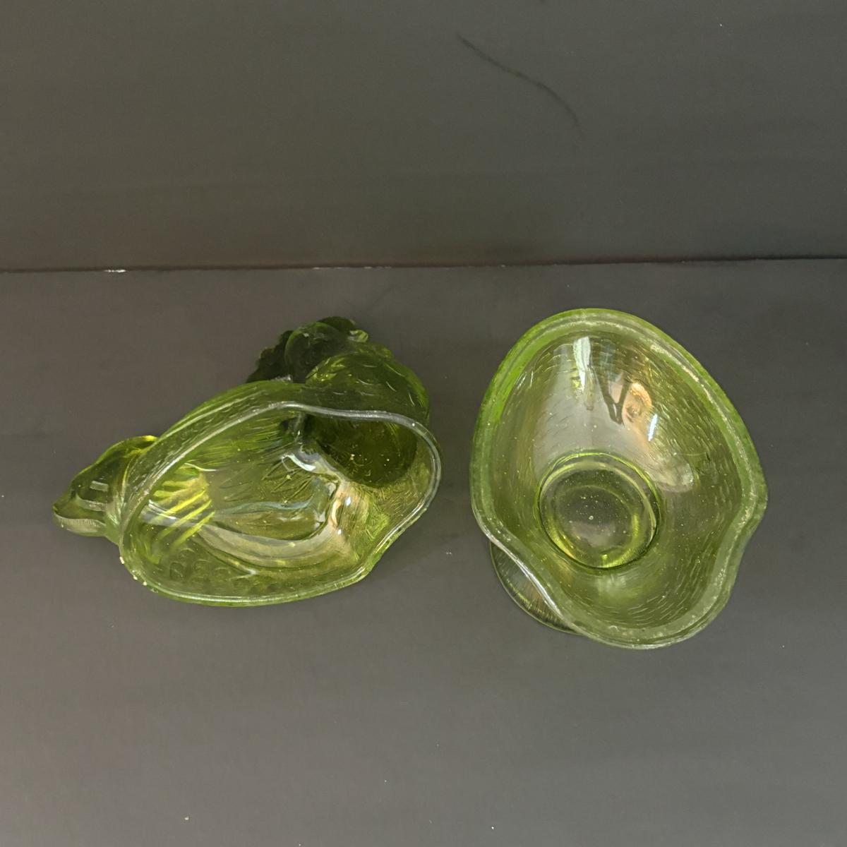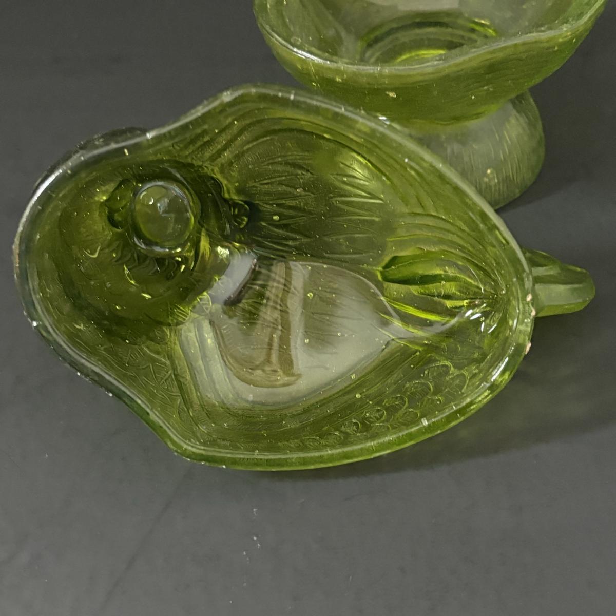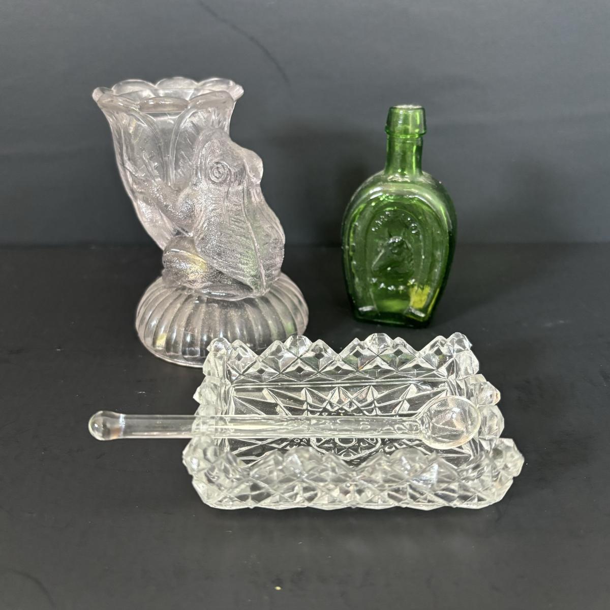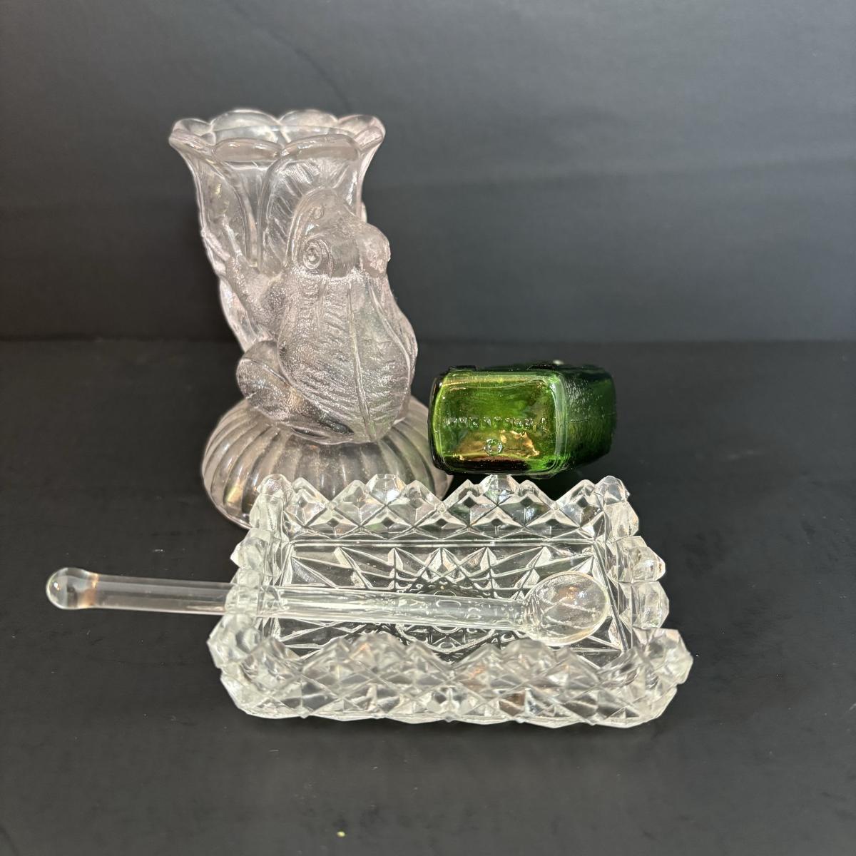 LOT 22: Vintage Olive Green Glass Rooster on Nest Dish, Vintage Libbey Rooster Chanticleer Glasses (5), Pressed Glass Frog on Lilypad Toothpick Holder, Carnival Glass & More