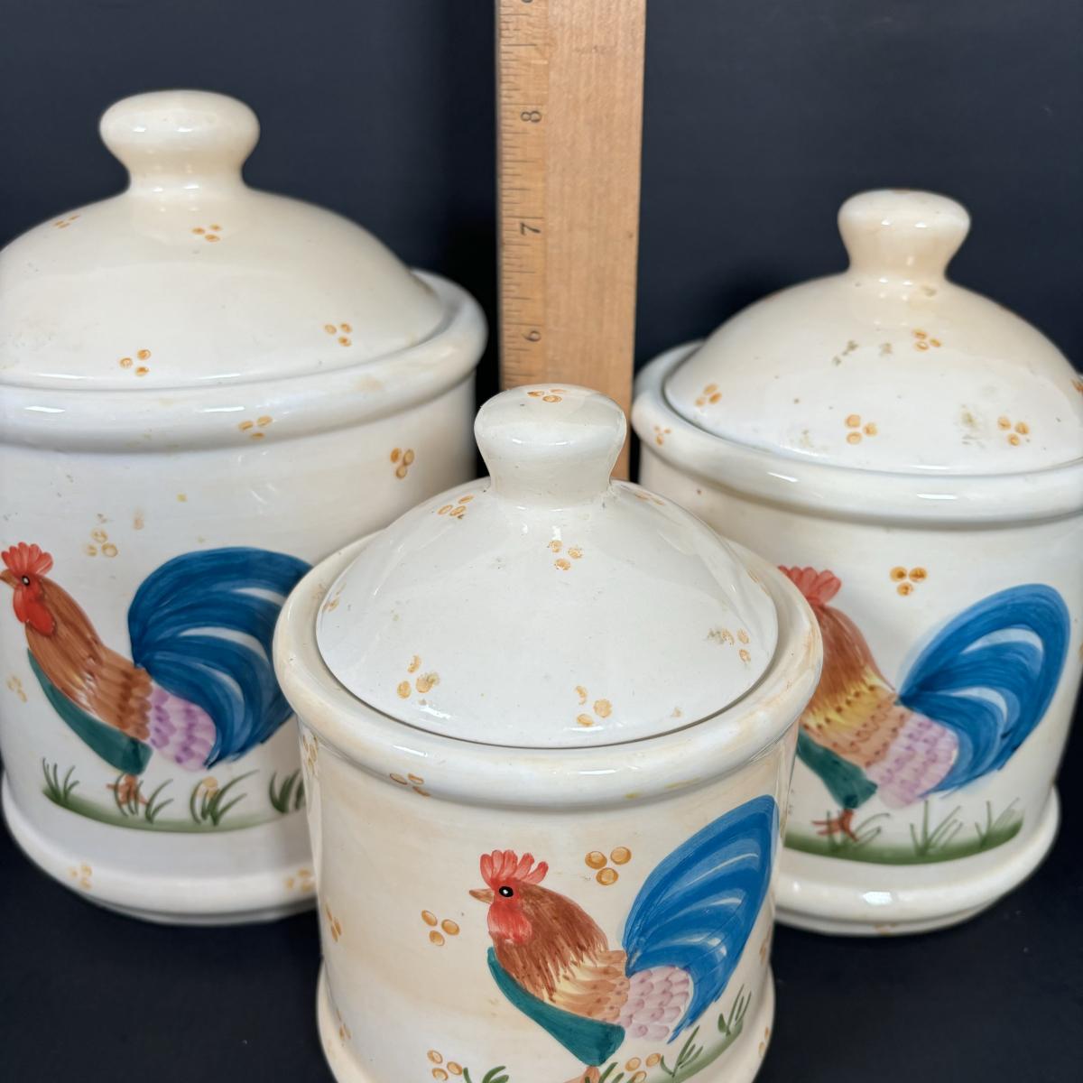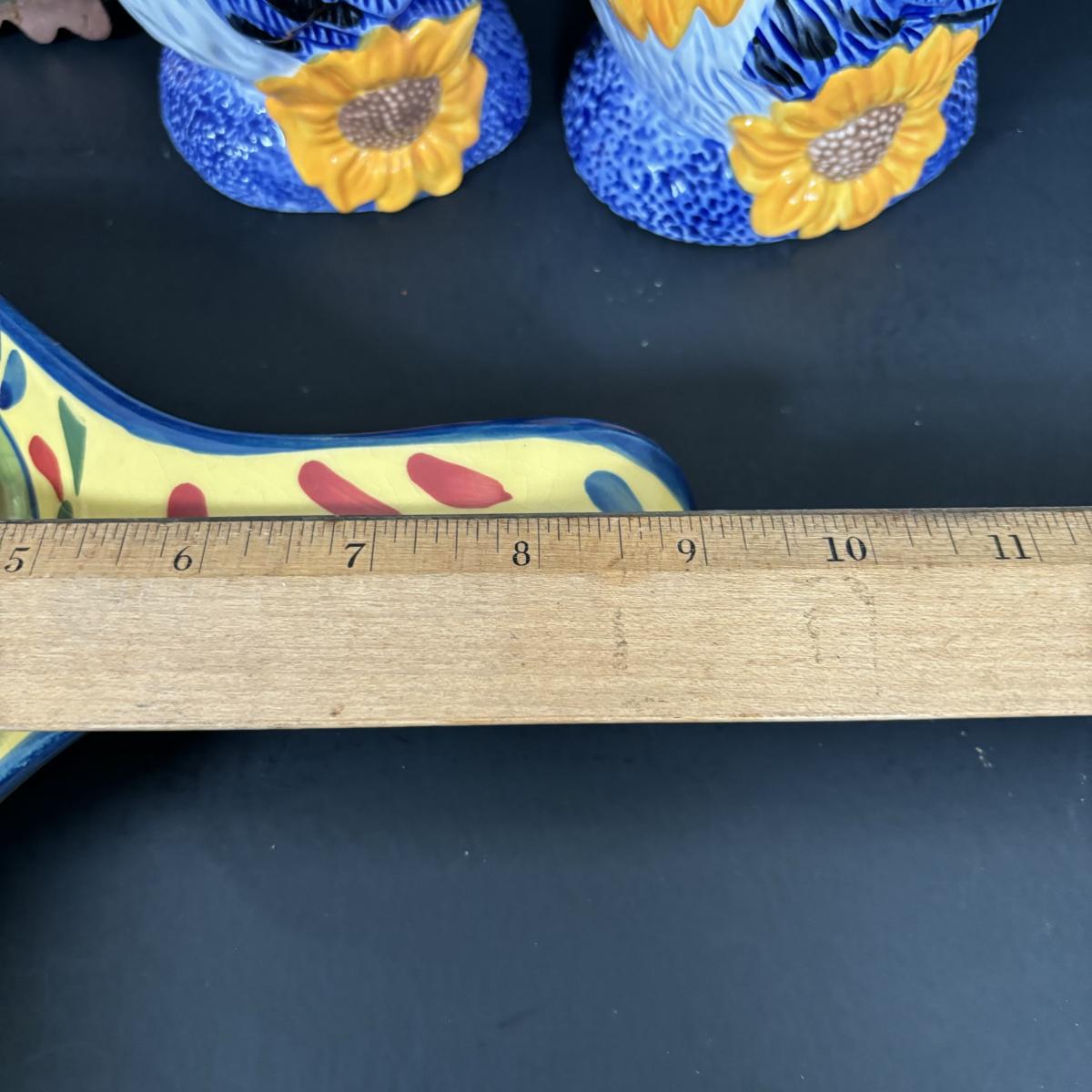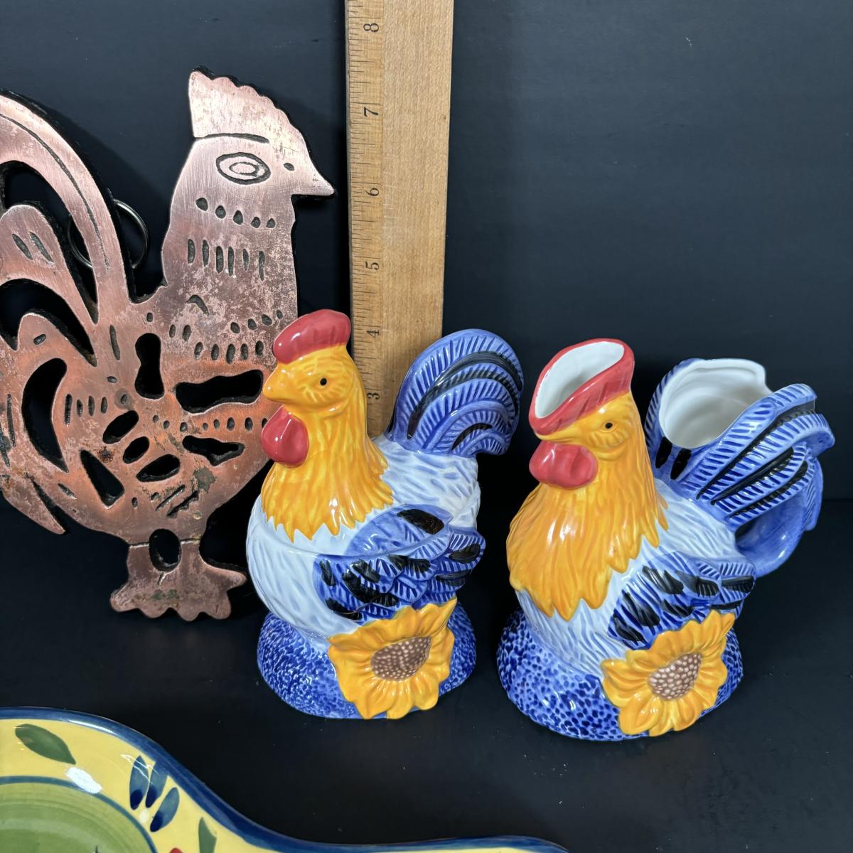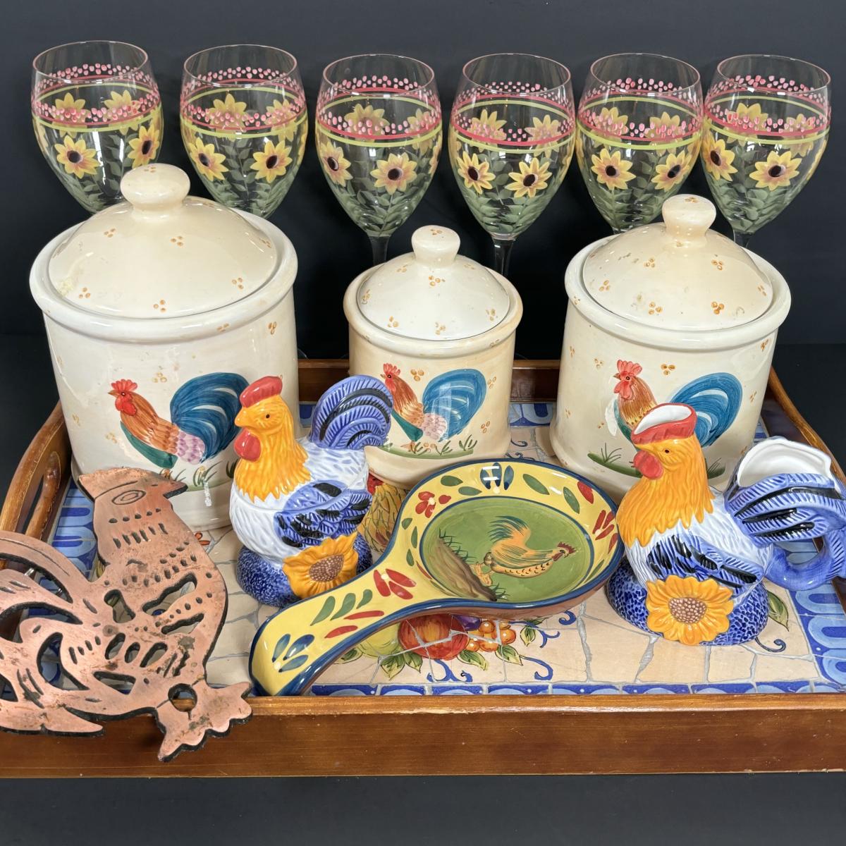 LOT 25: Roosters & Sunflower Collection: Mosaic Tray, Canisters, Salt/Pepper, Trivet, The Secrets of Pistoulet by Pfaltzgraff Hand Painted Water/Wine Glasses (6)