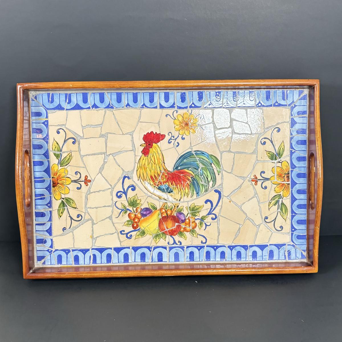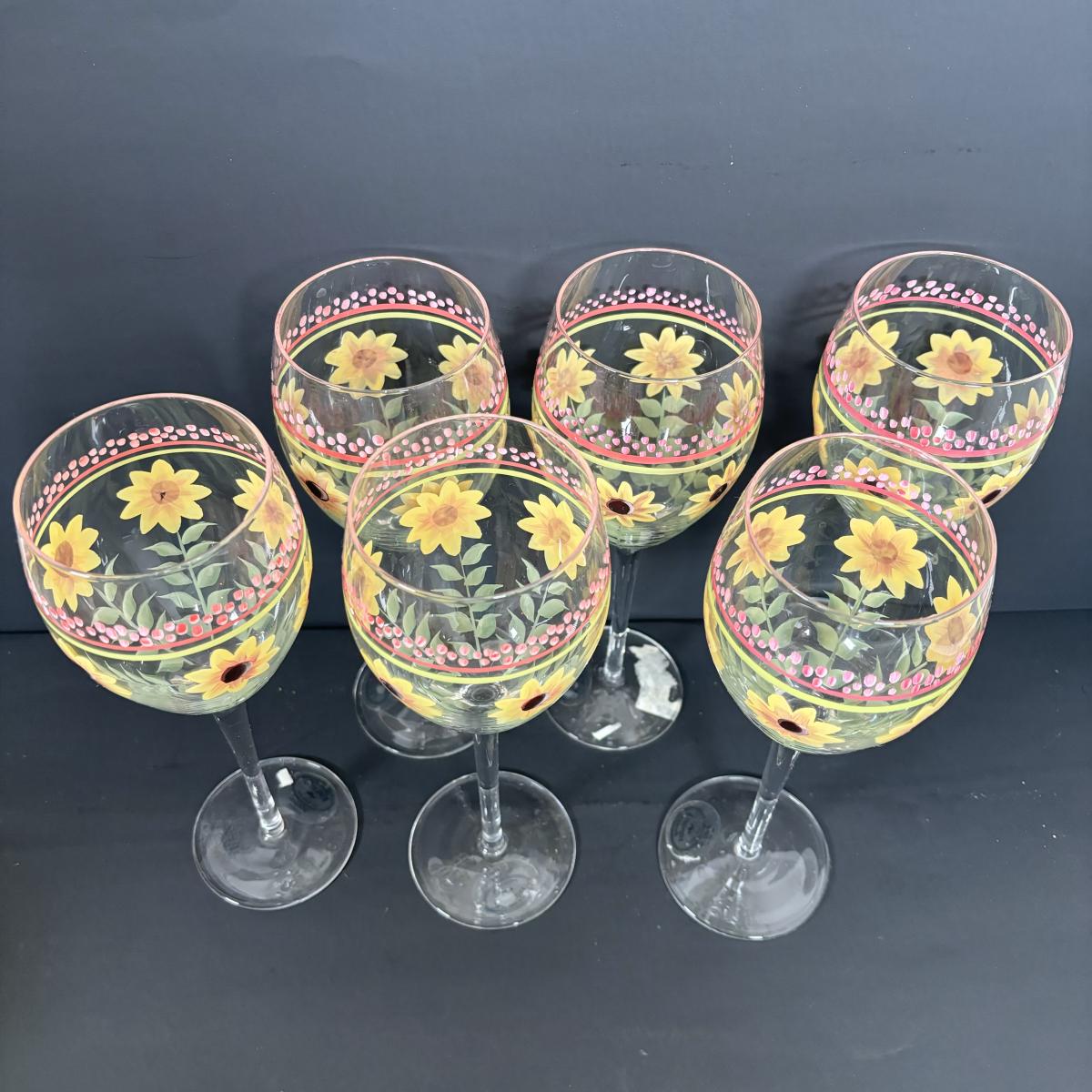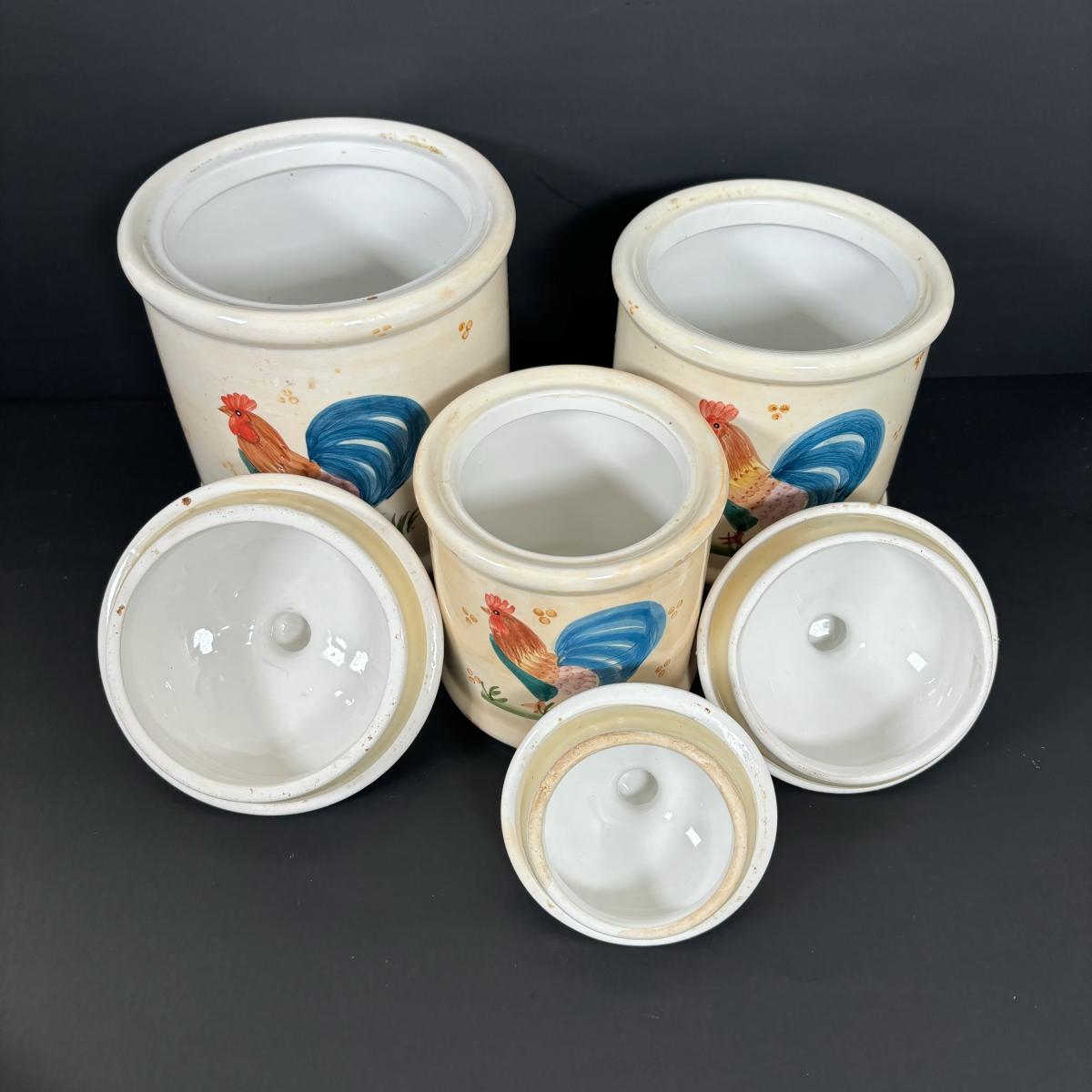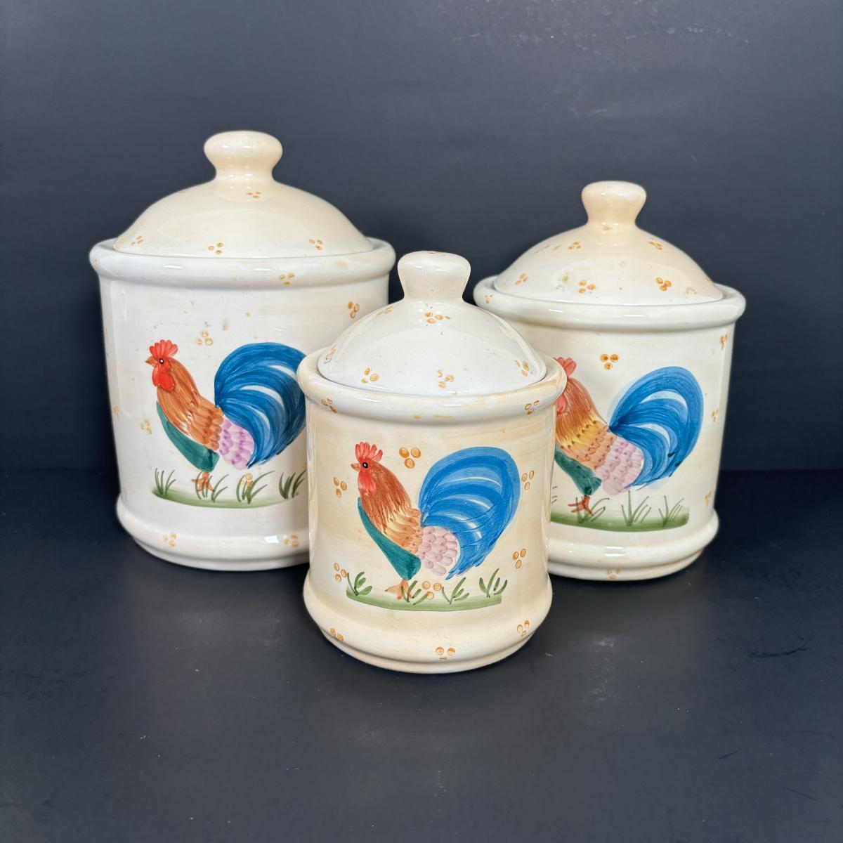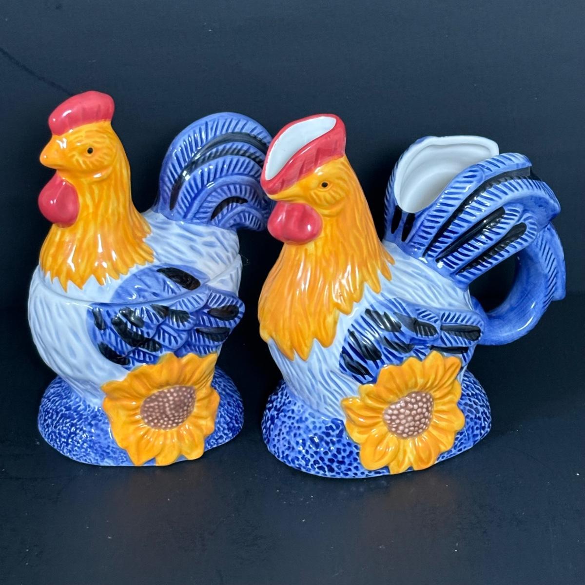 LOT 25: Roosters & Sunflower Collection: Mosaic Tray, Canisters, Salt/Pepper, Trivet, The Secrets of Pistoulet by Pfaltzgraff Hand Painted Water/Wine Glasses (6)
