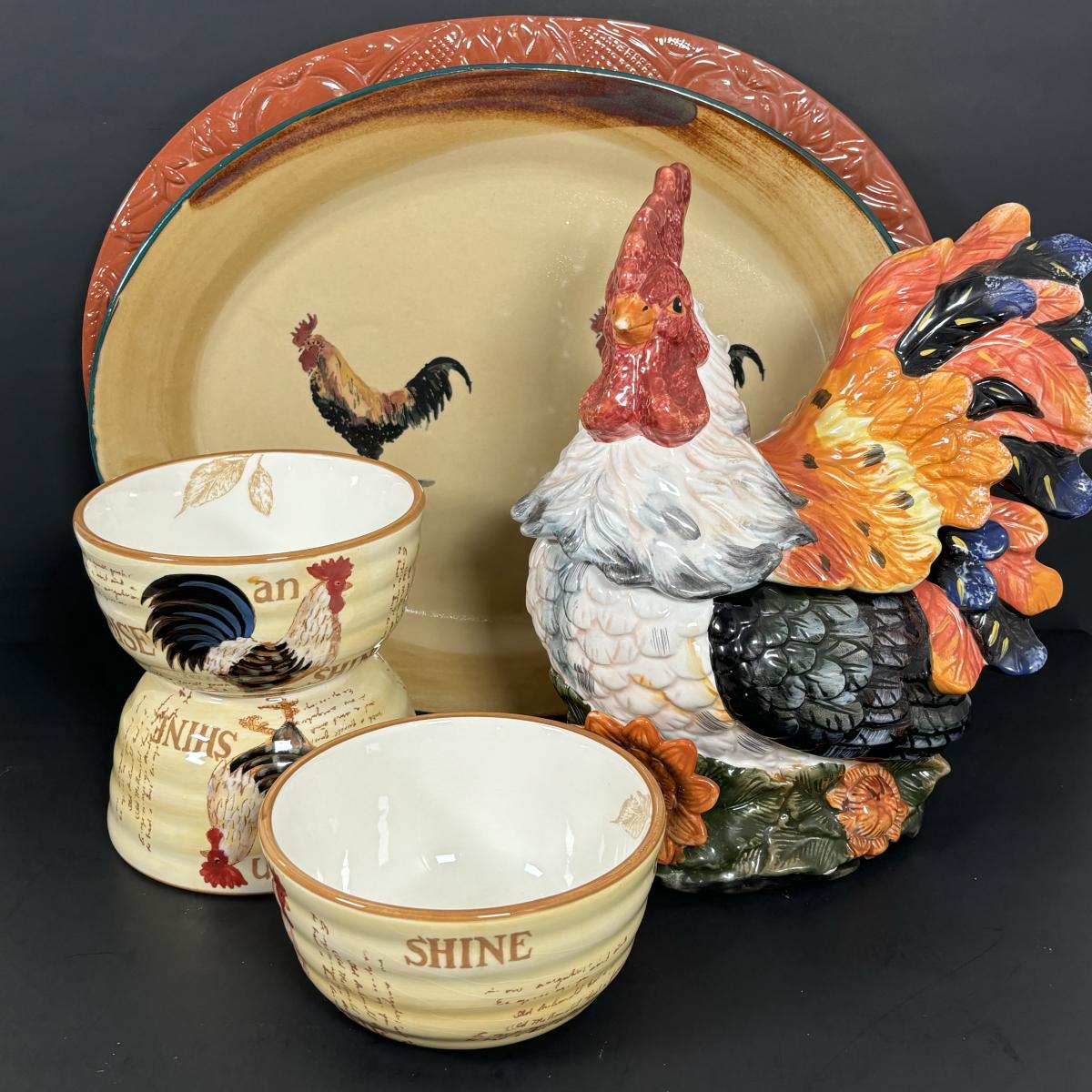 LOT 26: Rooster Cookie Jar, Boston Warehouse Serving Platter, Robert Gordon Rooster Serving Platter & More