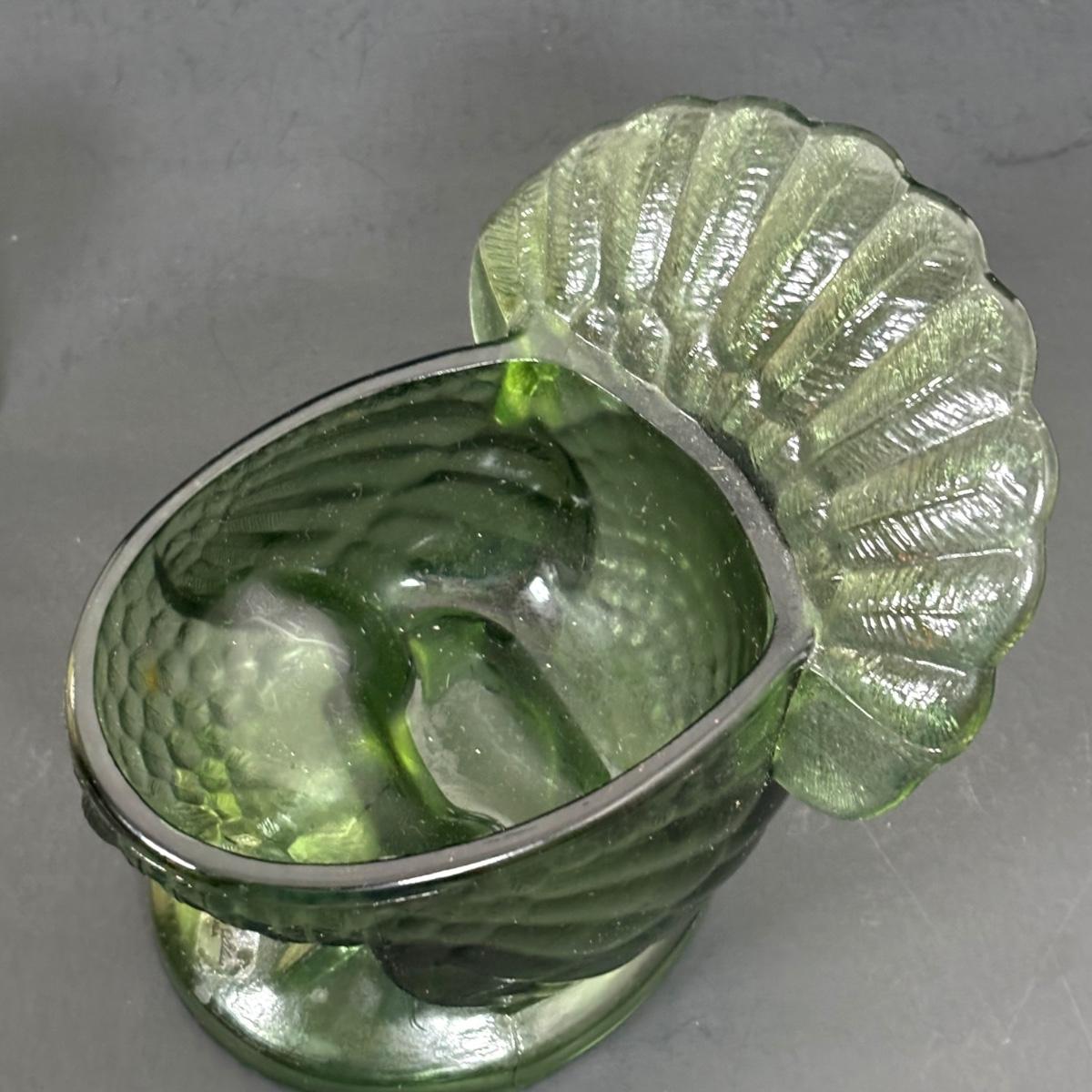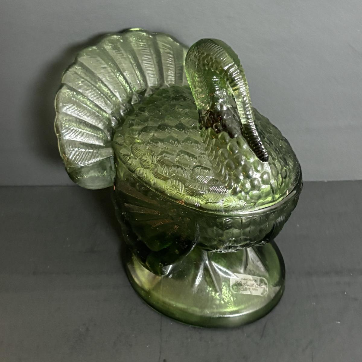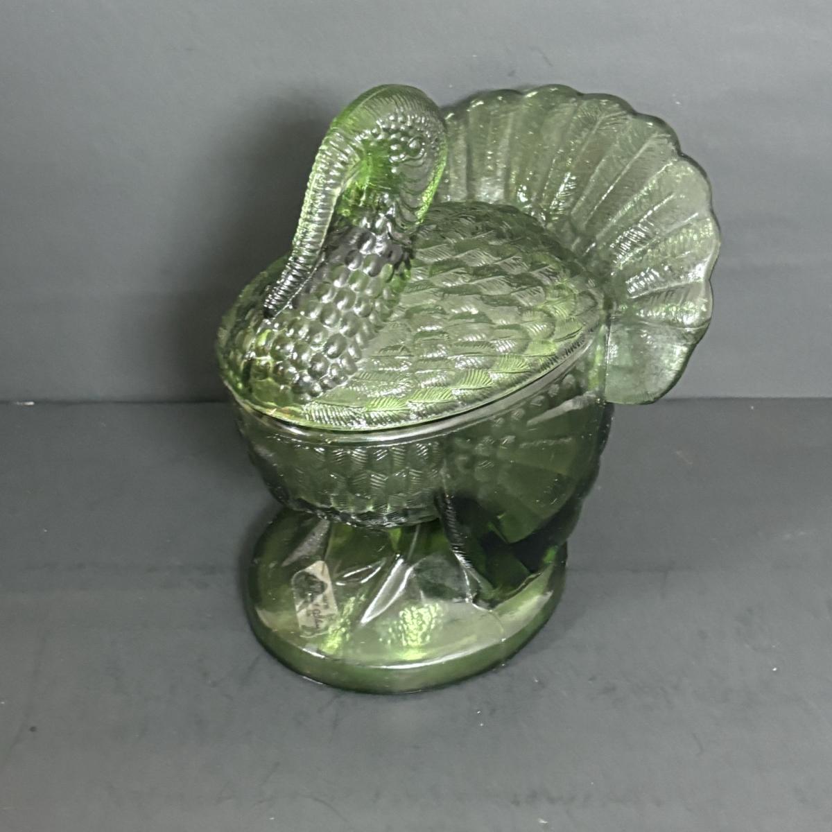 LOT 27: Vintage L.E. Smith Green Glass Turkey Shaped Lidded 7.25 in Candy Dish & More
