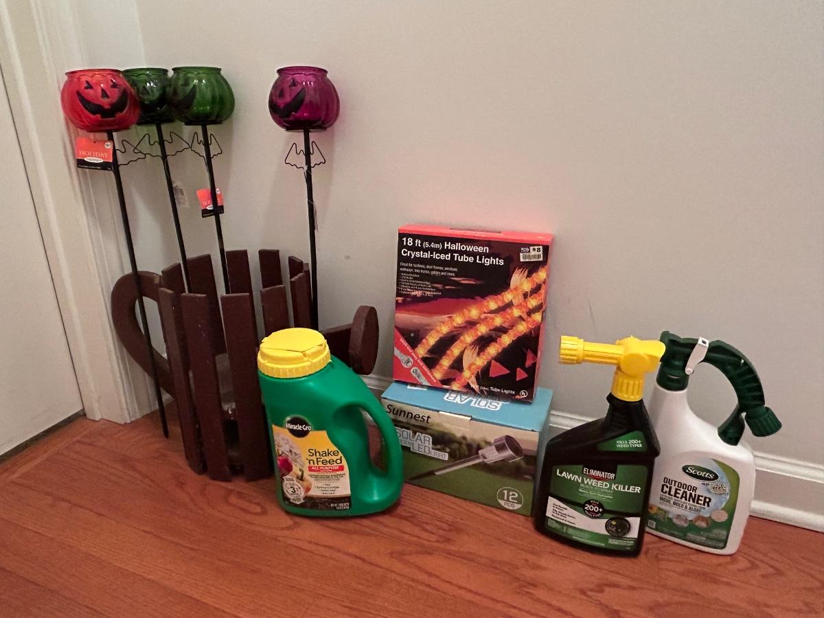 LOT 49MB: Outdoor/Garden Home Essentials - Outdoor Lights, Garden Stakes, Miracle Grow, Weed Killer & Outdoor Cleaner