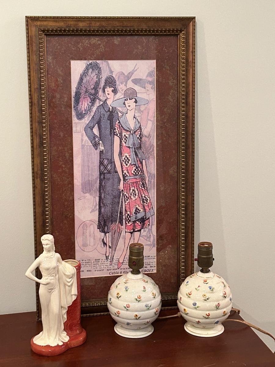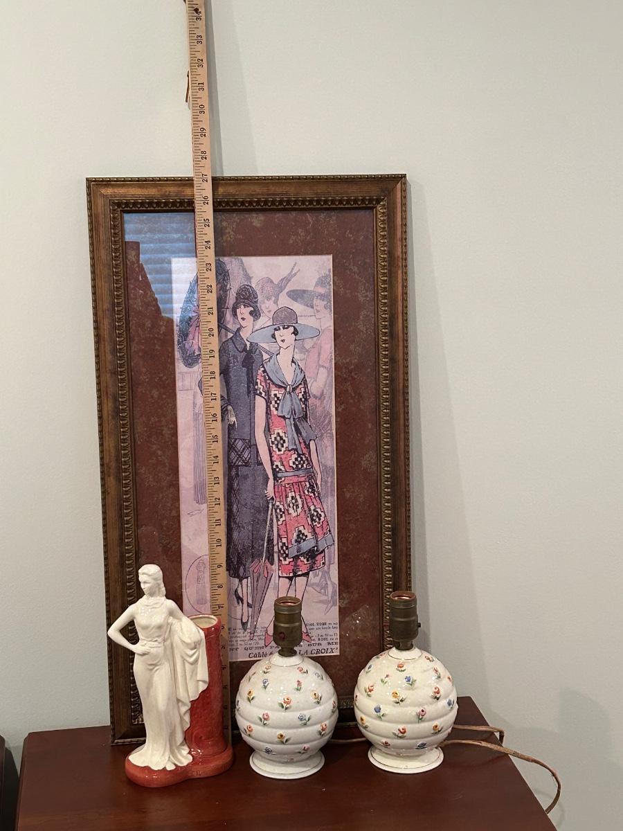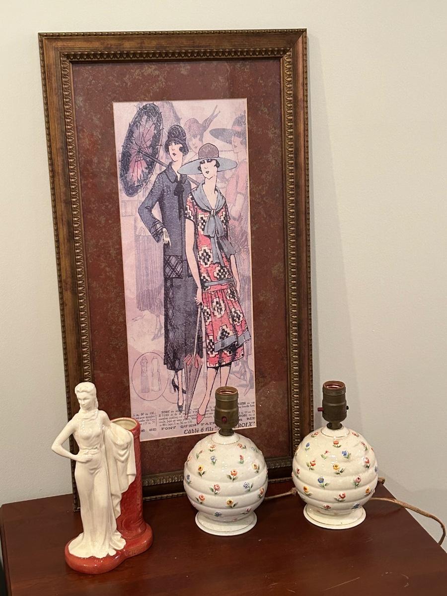 LOT 52MB: Framed Fashion Print, Vase and Matching Lamps