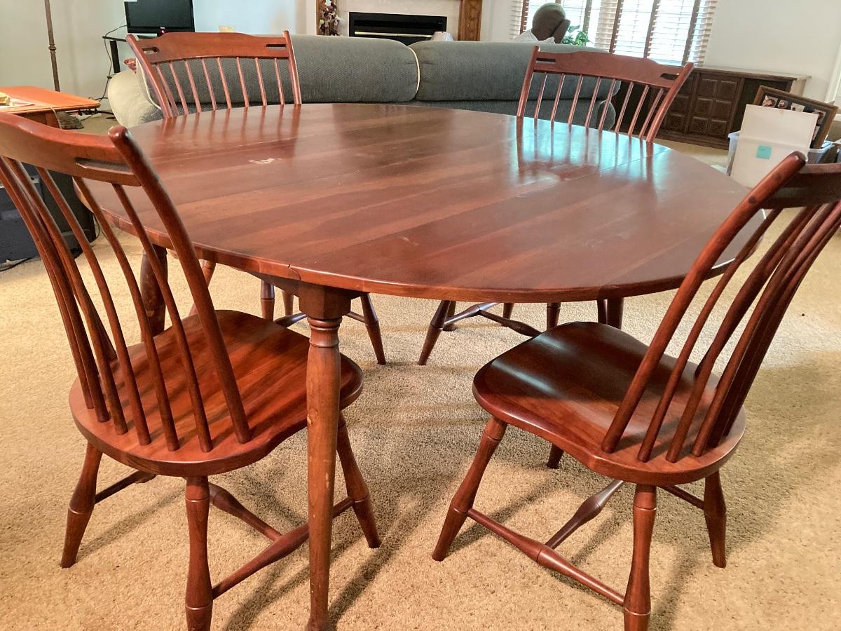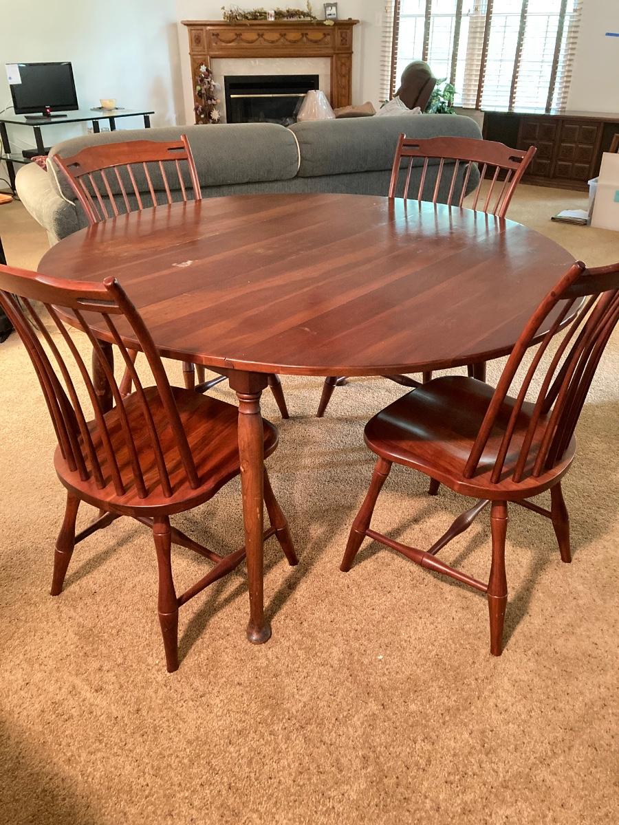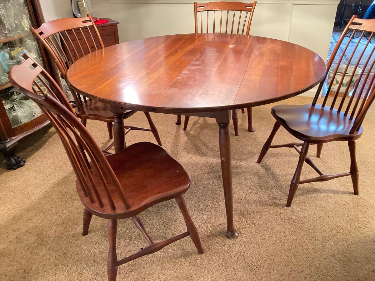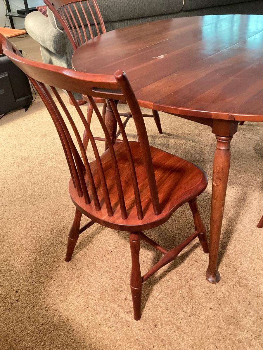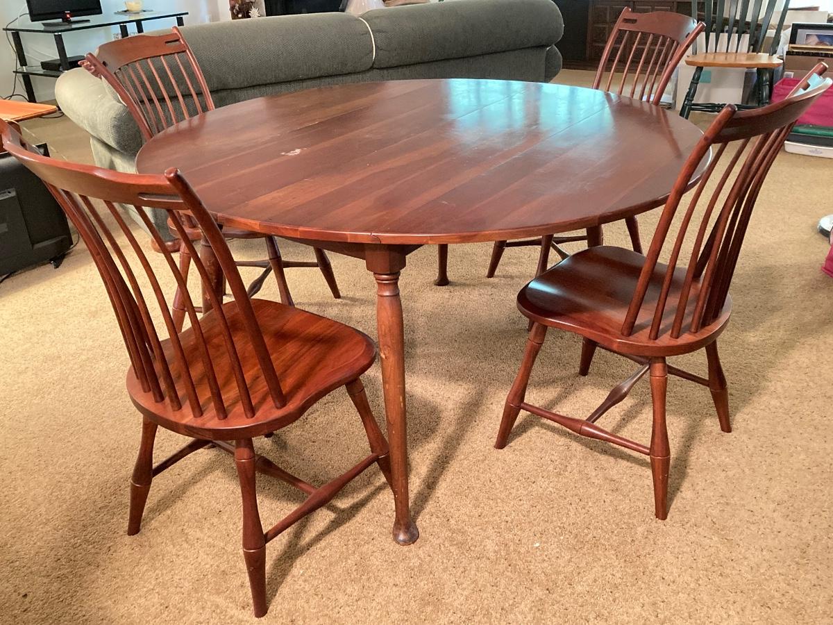 LOT 55D: Pennsylvania House Round Drop Leaf Wood Table and Four Tom Seely Furniture Rod Back Seasoned Cherry Chairs