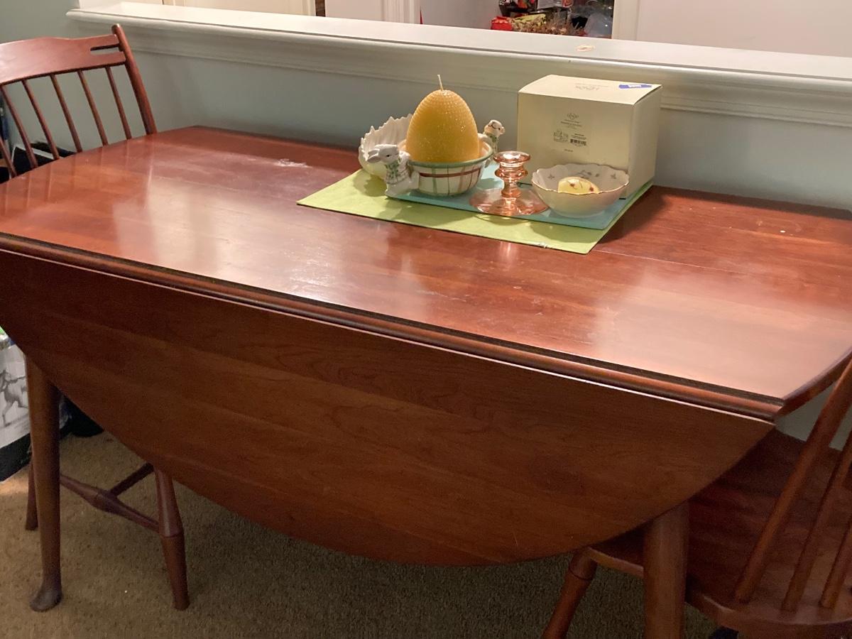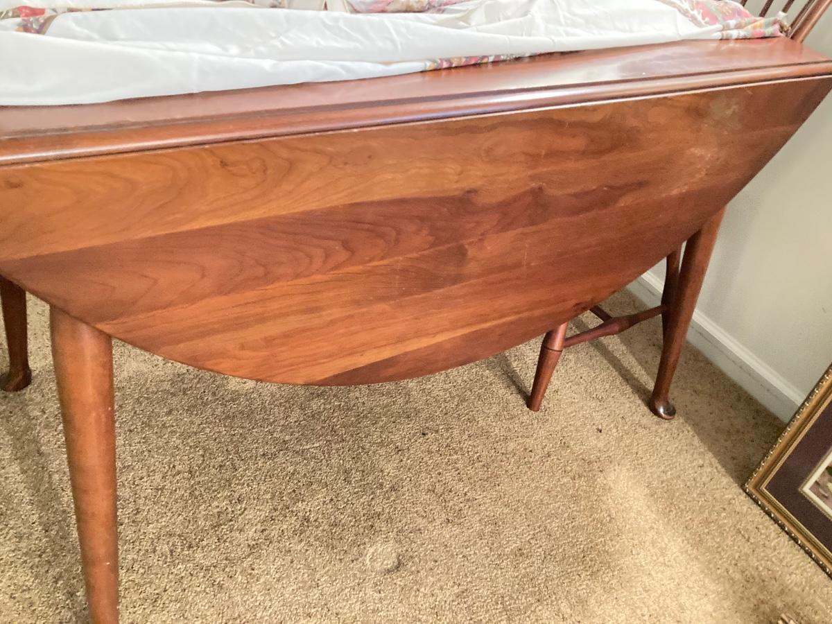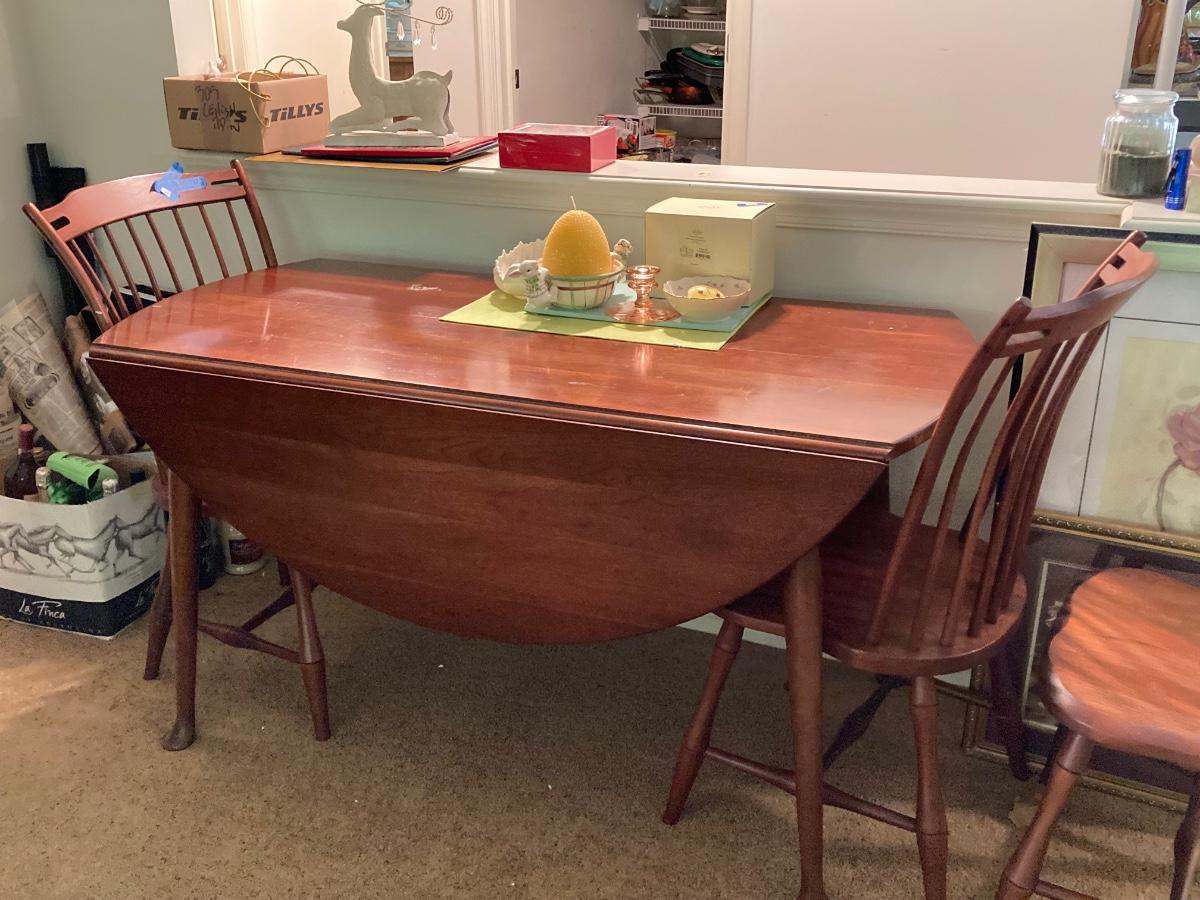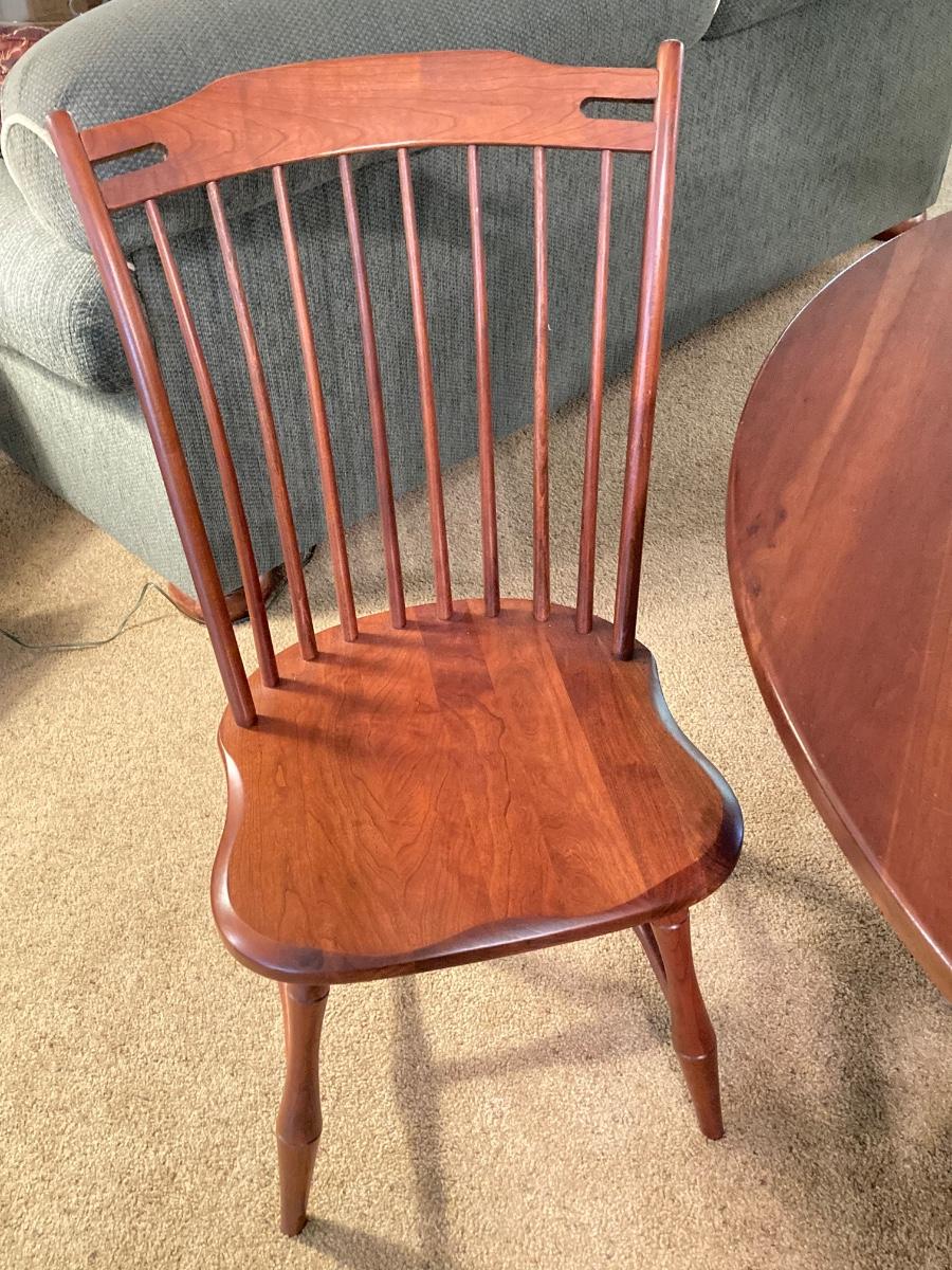 LOT 55D: Pennsylvania House Round Drop Leaf Wood Table and Four Tom Seely Furniture Rod Back Seasoned Cherry Chairs