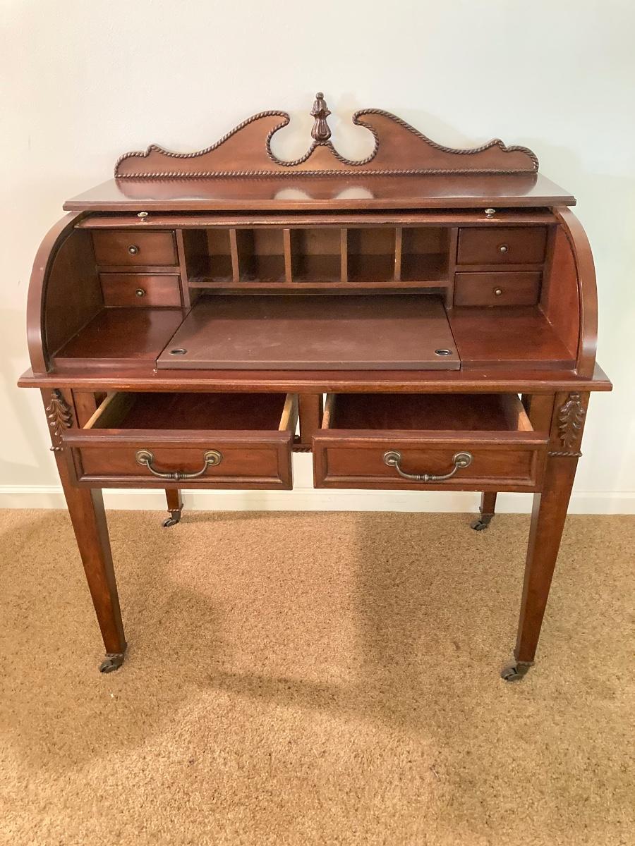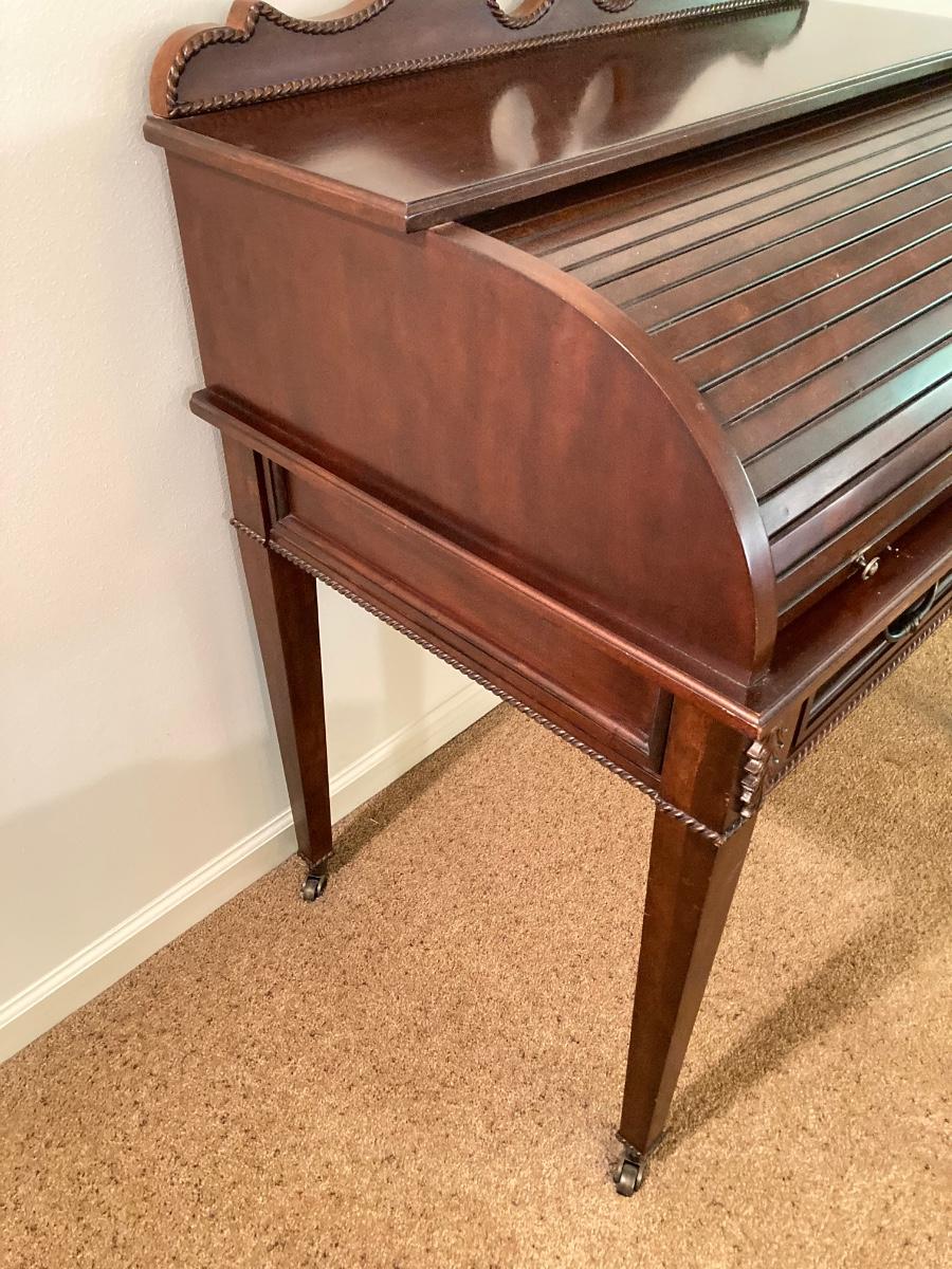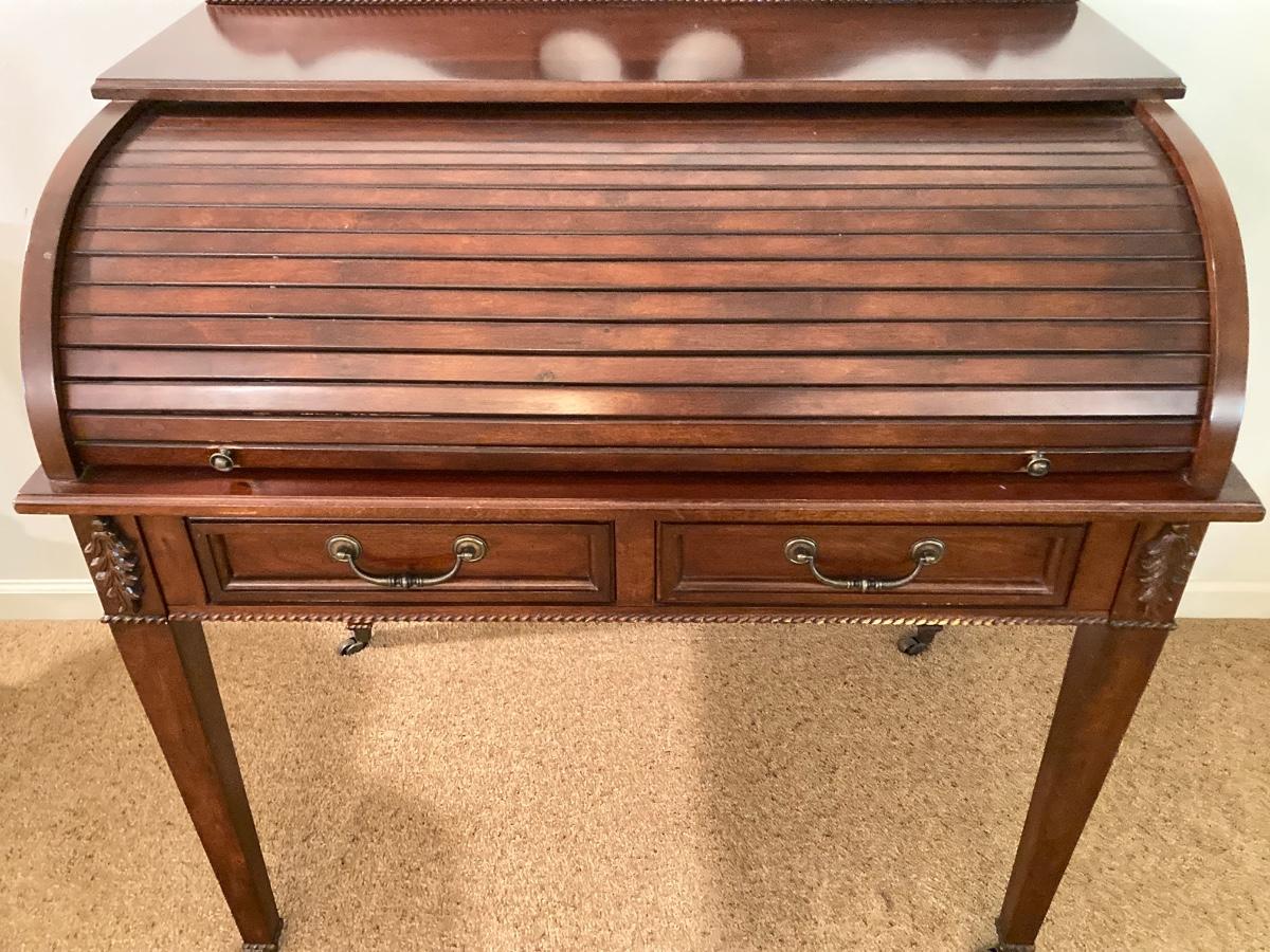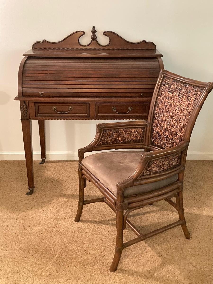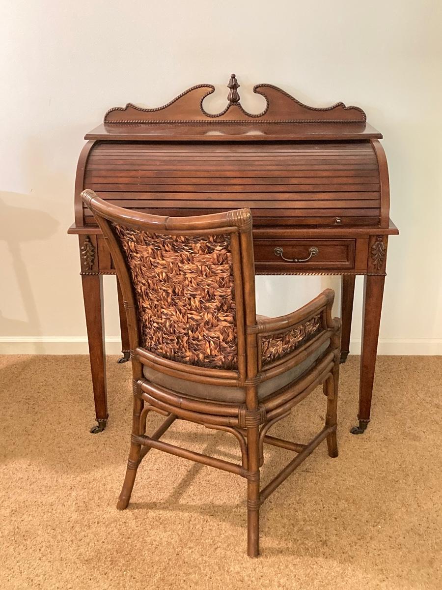 LOT 58L: Rolling Wood Roll Top Secretary Desk and Bassett Furniture Rattan Chair