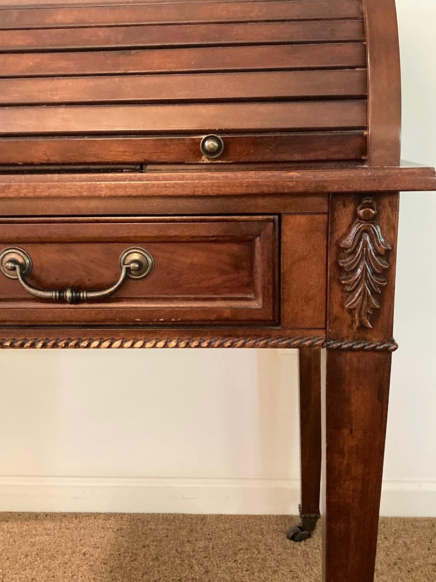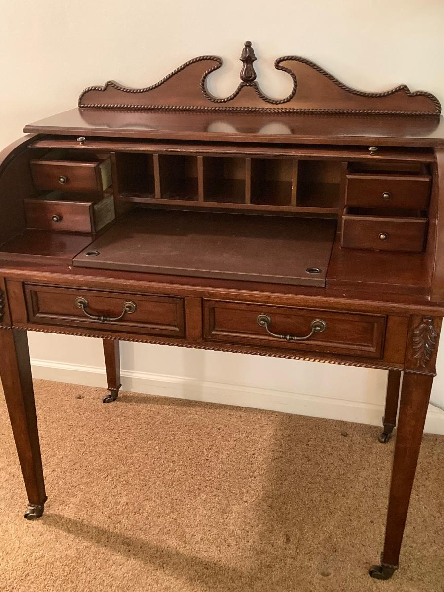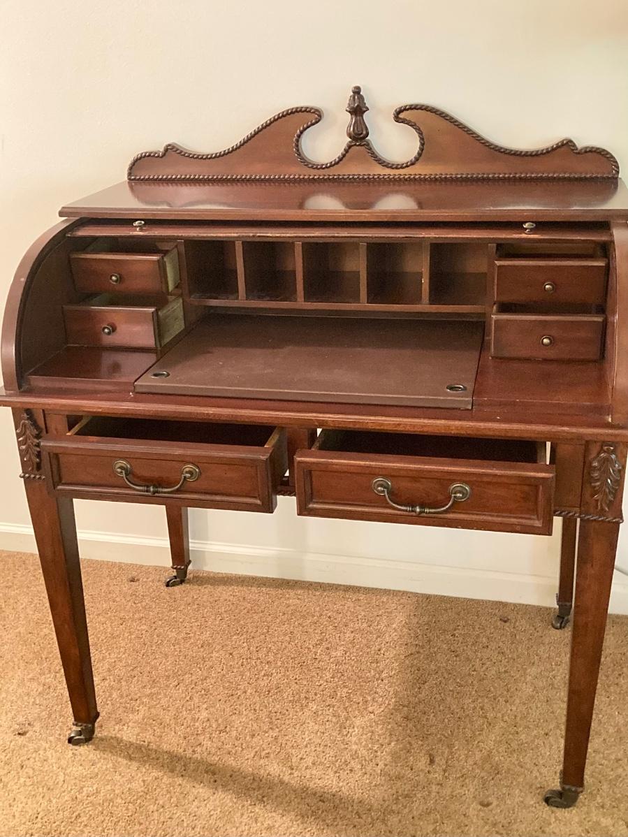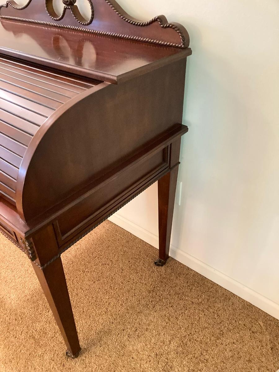 LOT 58L: Rolling Wood Roll Top Secretary Desk and Bassett Furniture Rattan Chair