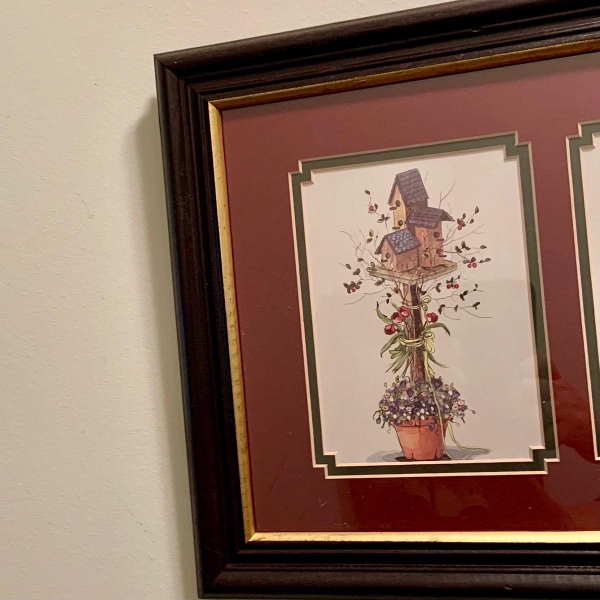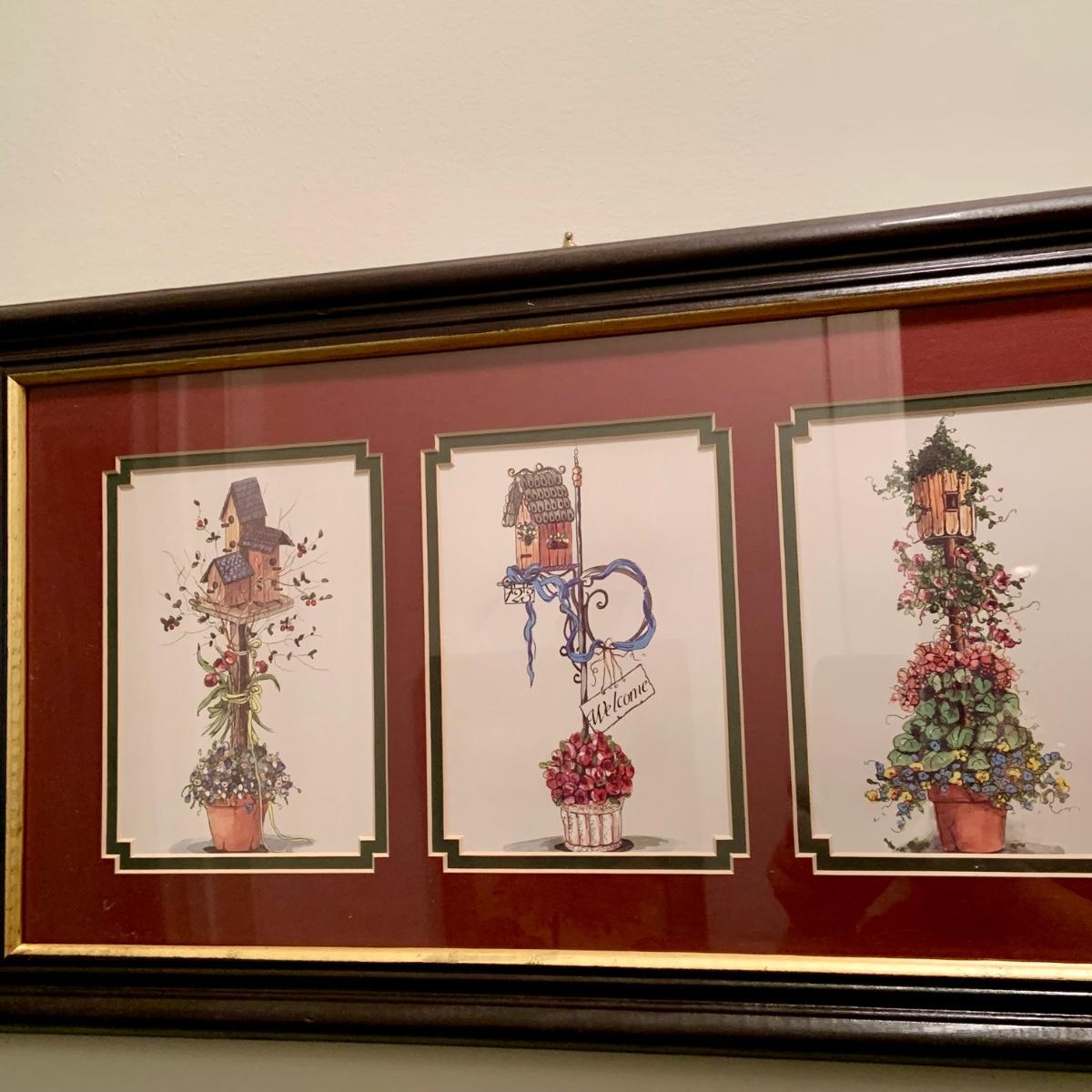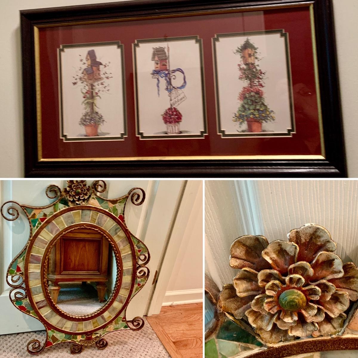 LOT:84: Beautiful Metal and Mosaic Style Mirror with Metal Flower & Framed and Matted Birdhouse Wall Art
