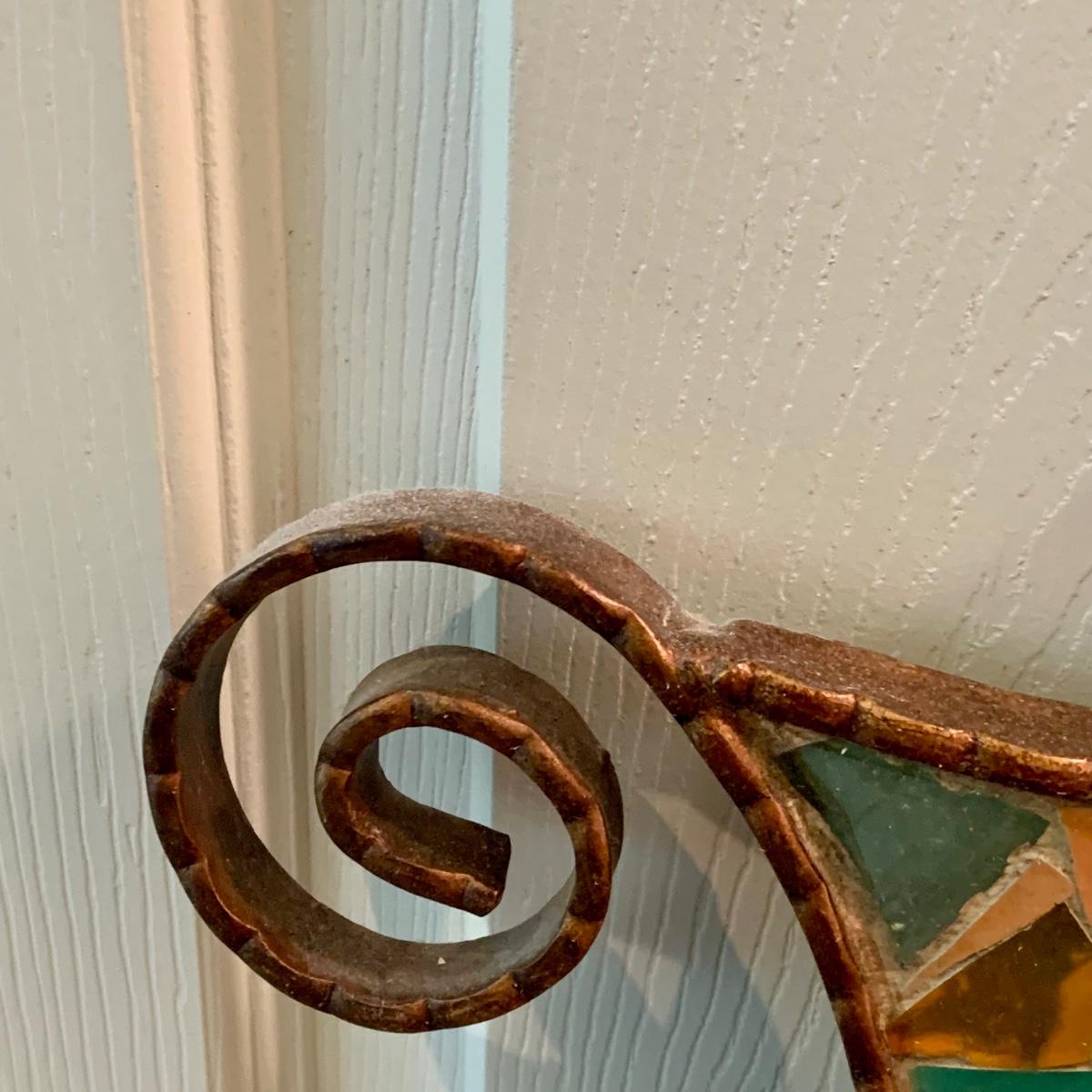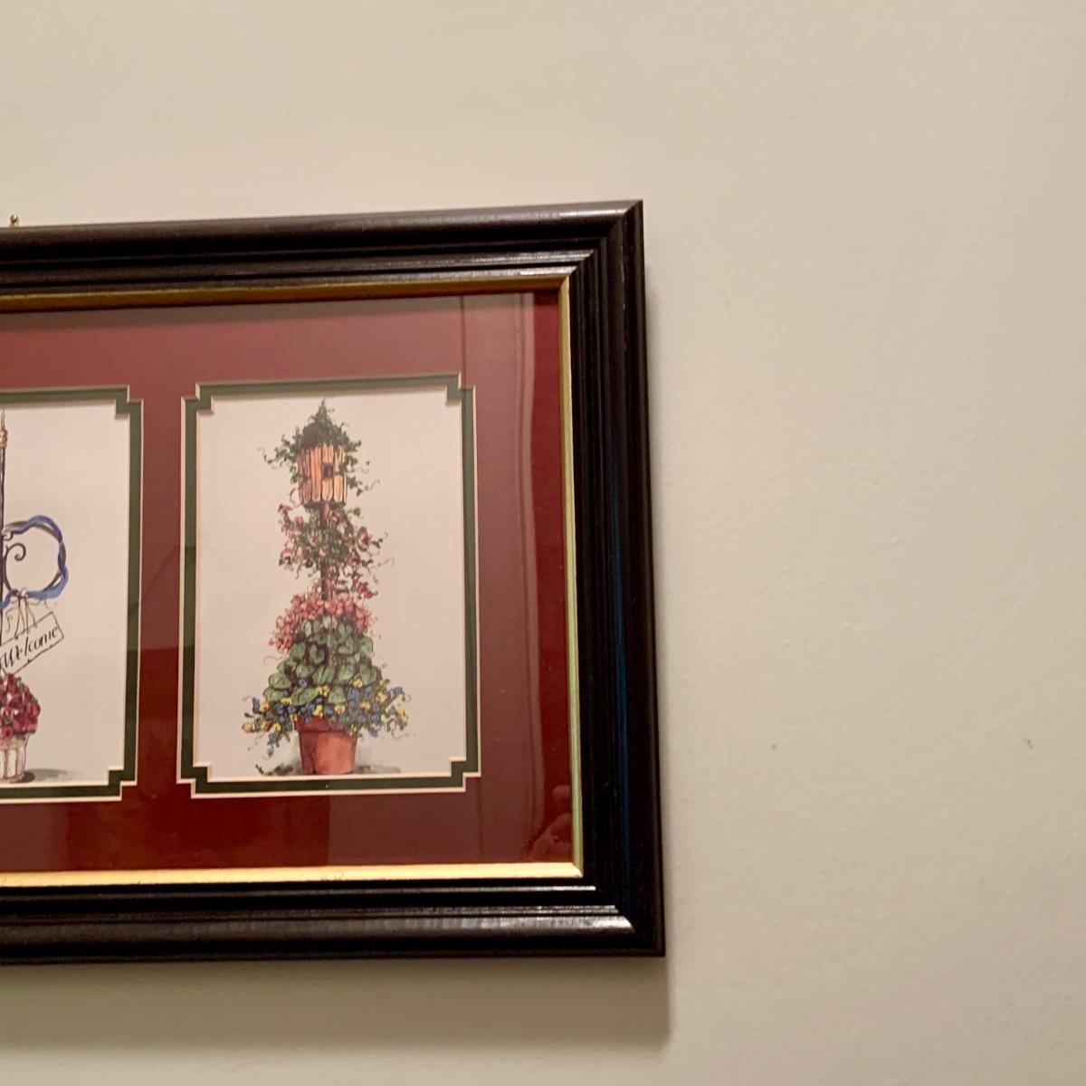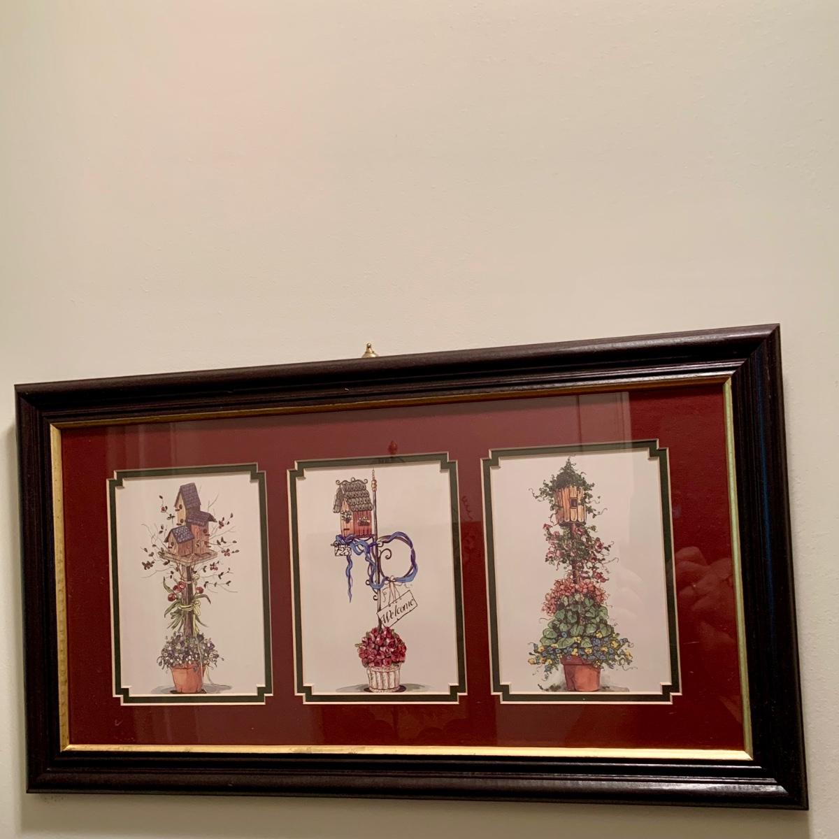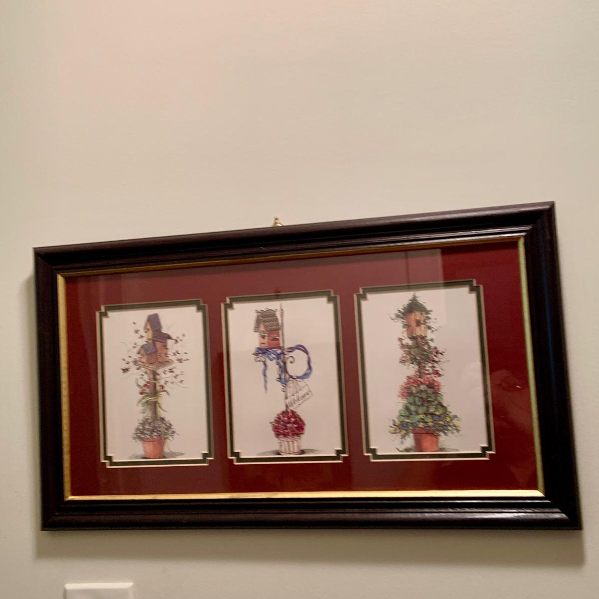 LOT:84: Beautiful Metal and Mosaic Style Mirror with Metal Flower & Framed and Matted Birdhouse Wall Art