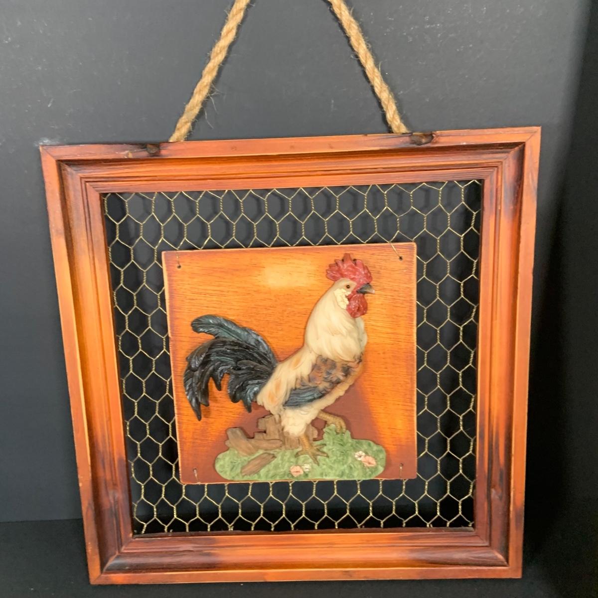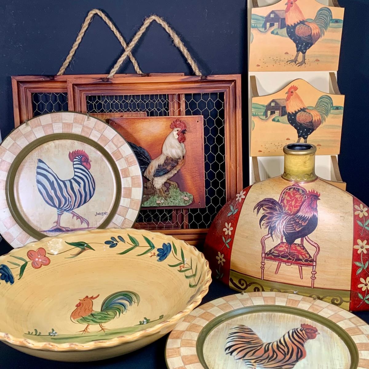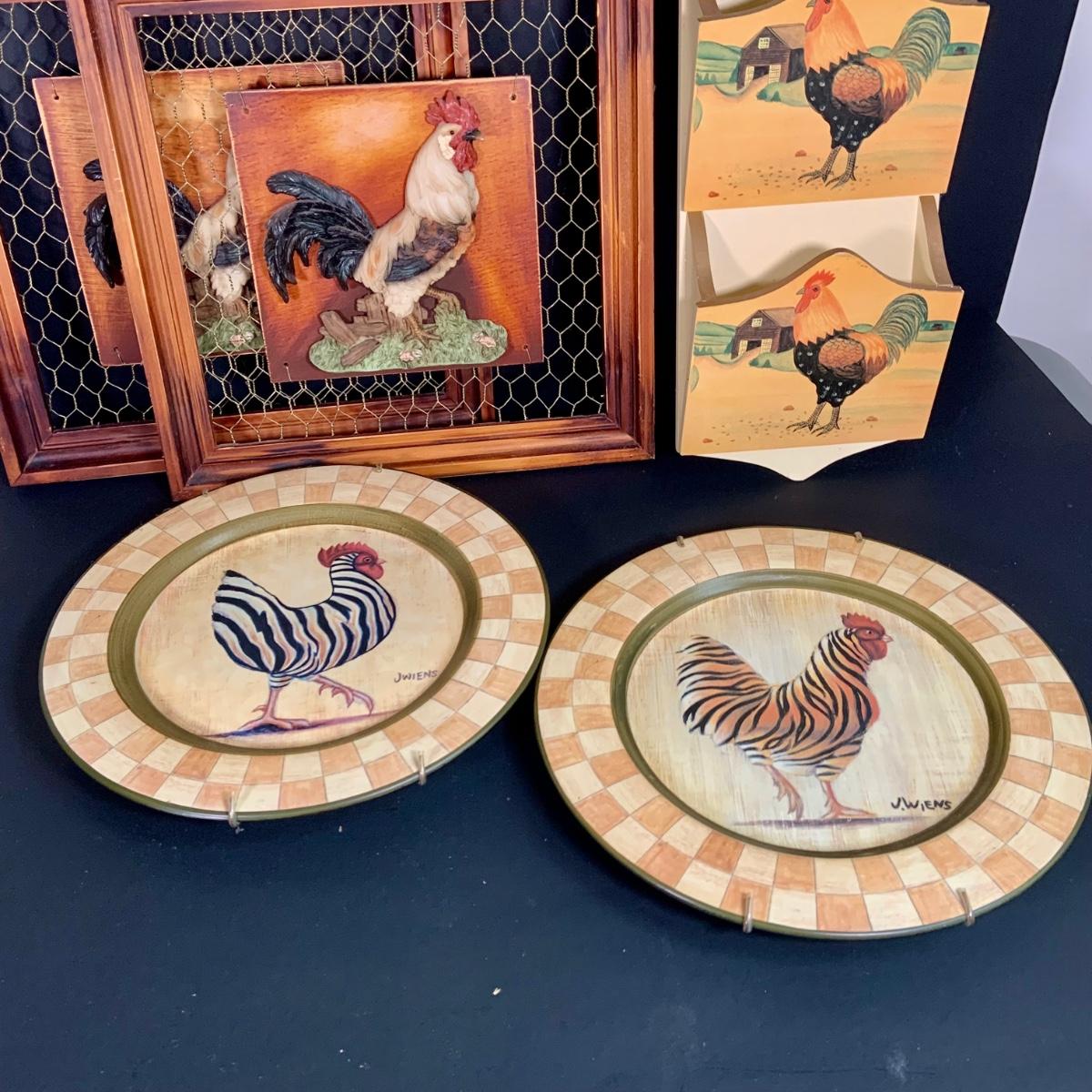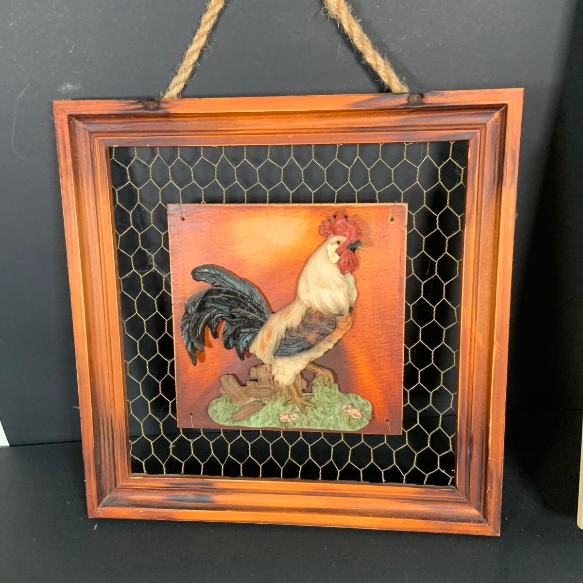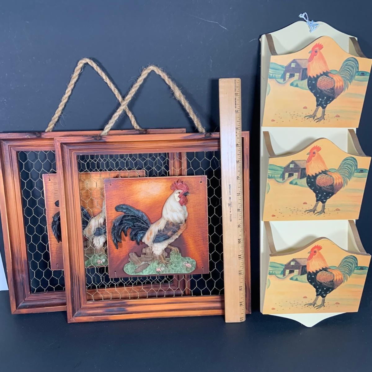 LOT:87: Collection of Rooster Themed Home Decor Including Plates, Bowl, Bottle, Letter Holder and Wall Art Framed with Chicken Wire Matting