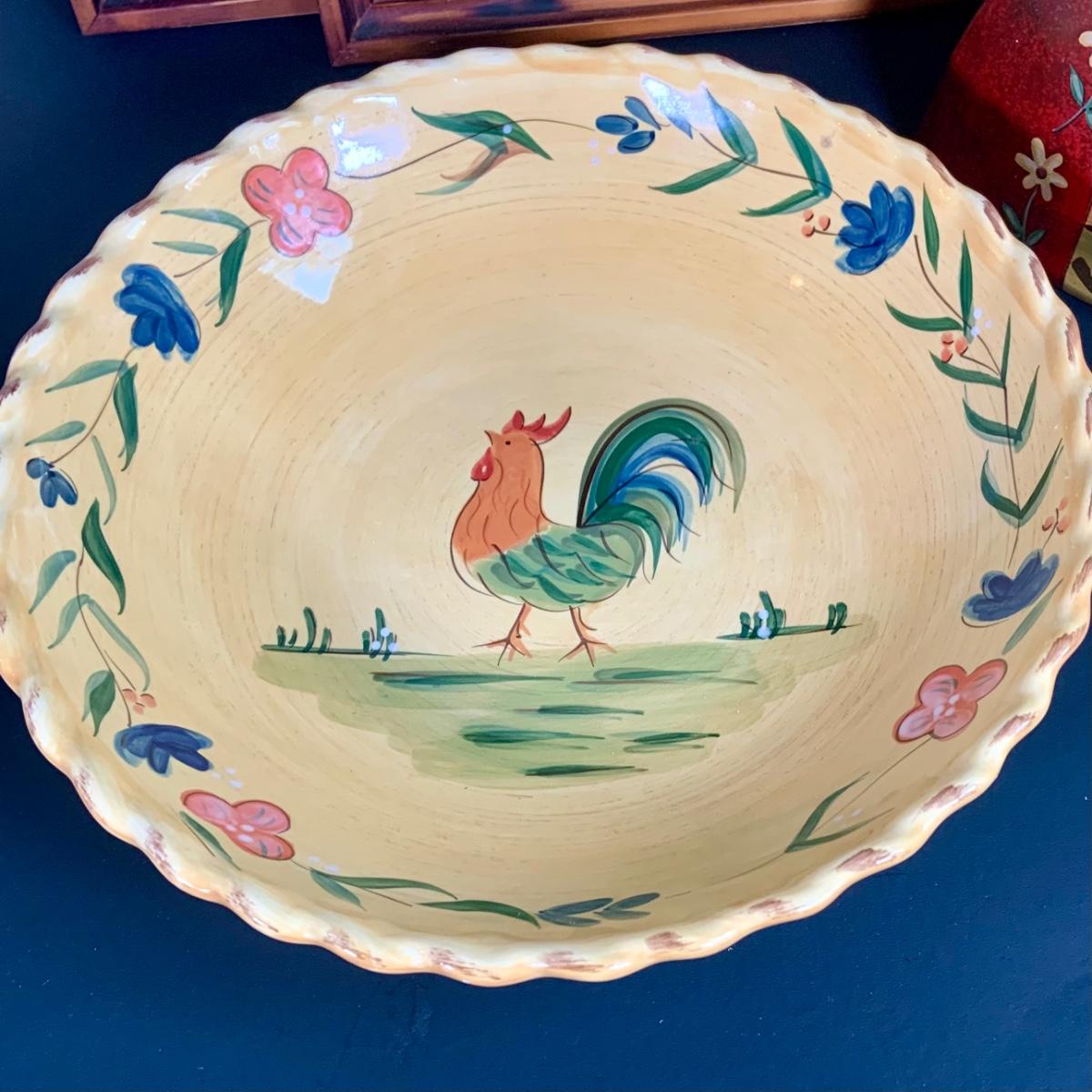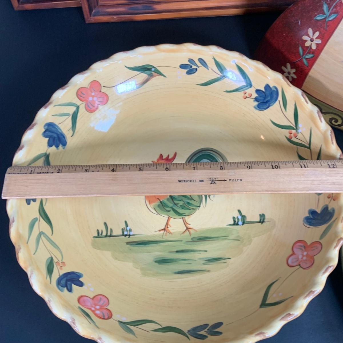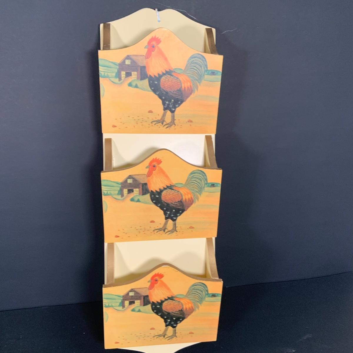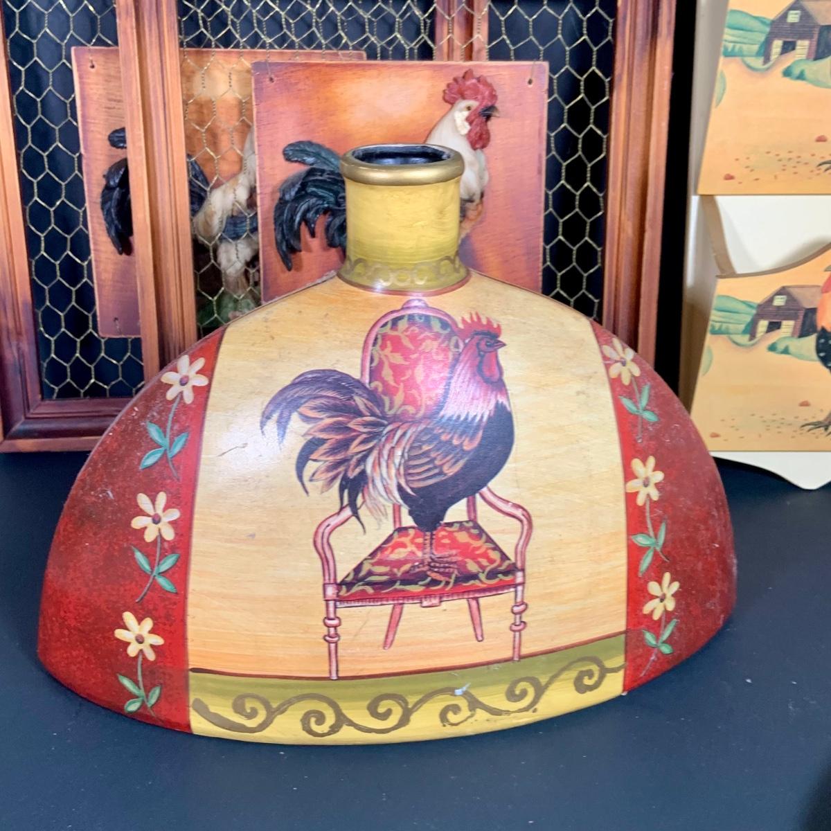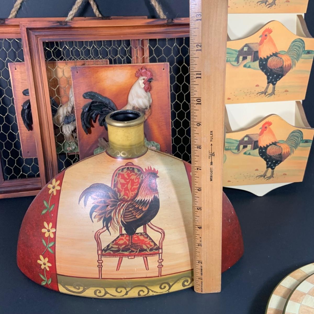LOT:87: Collection of Rooster Themed Home Decor Including Plates, Bowl, Bottle, Letter Holder and Wall Art Framed with Chicken Wire Matting