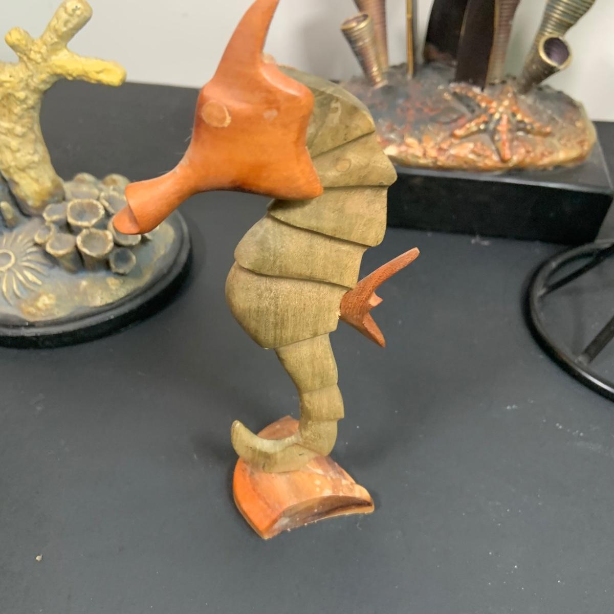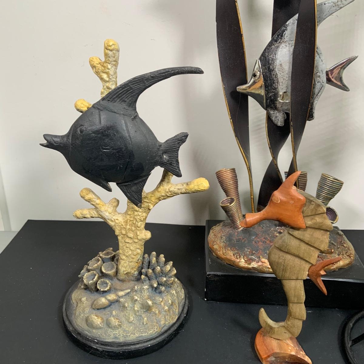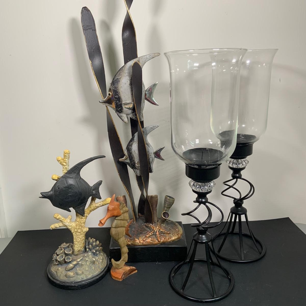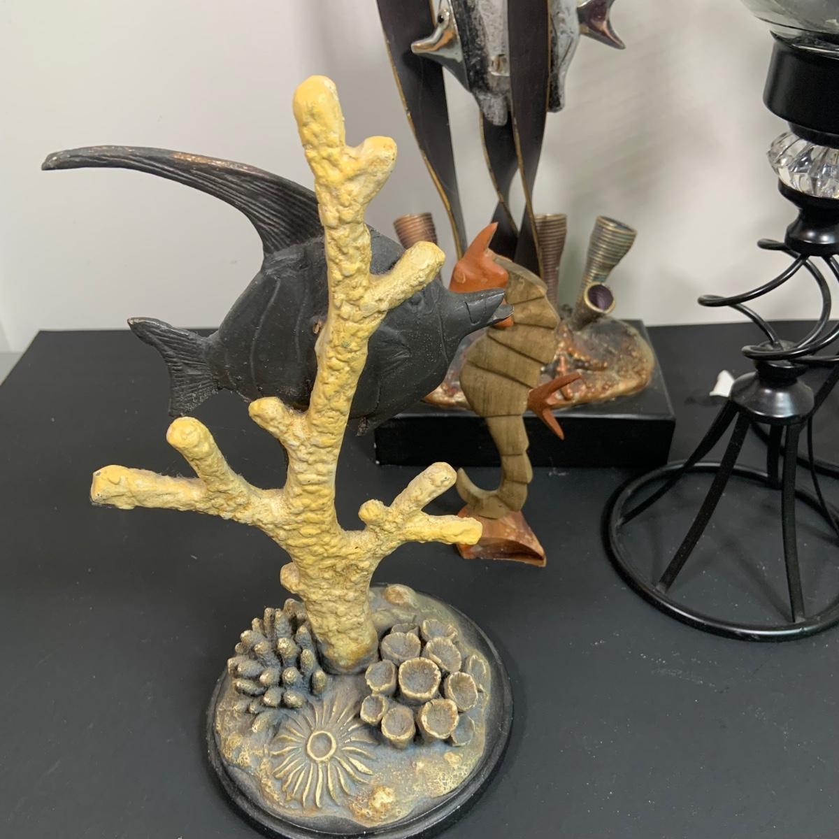 LOT:91: Under the Sea Home Decor Including 2 Angel Fish Statues, a Wood Seahorse and 2 Black Metal Candleholders