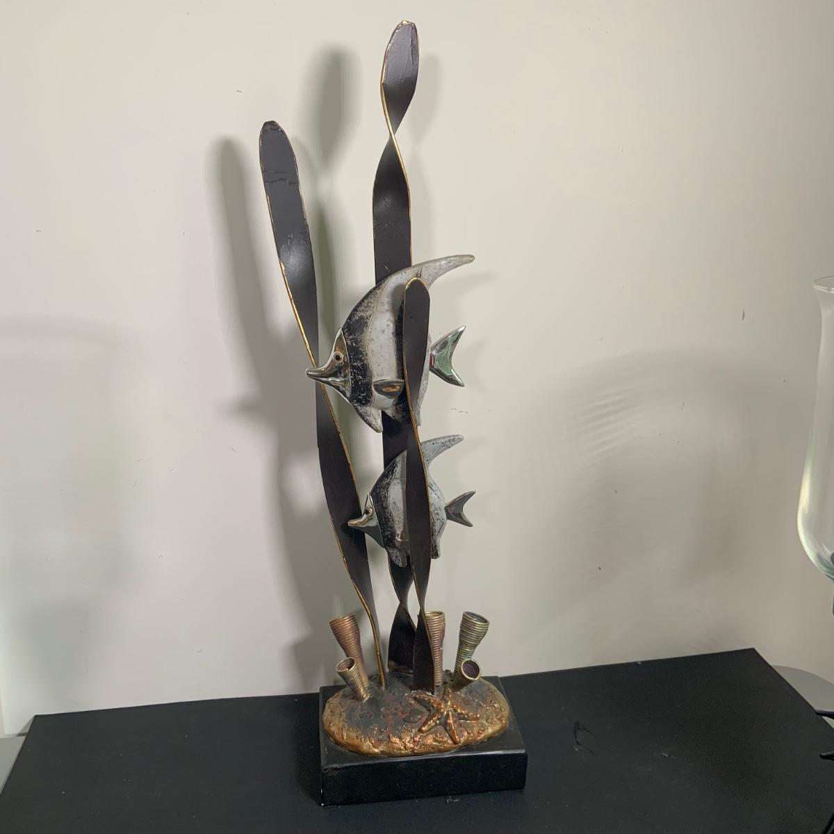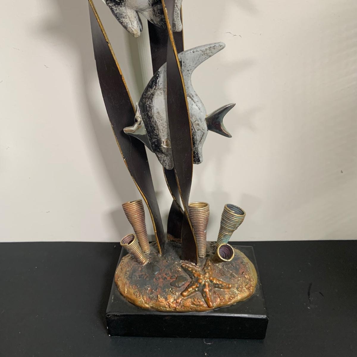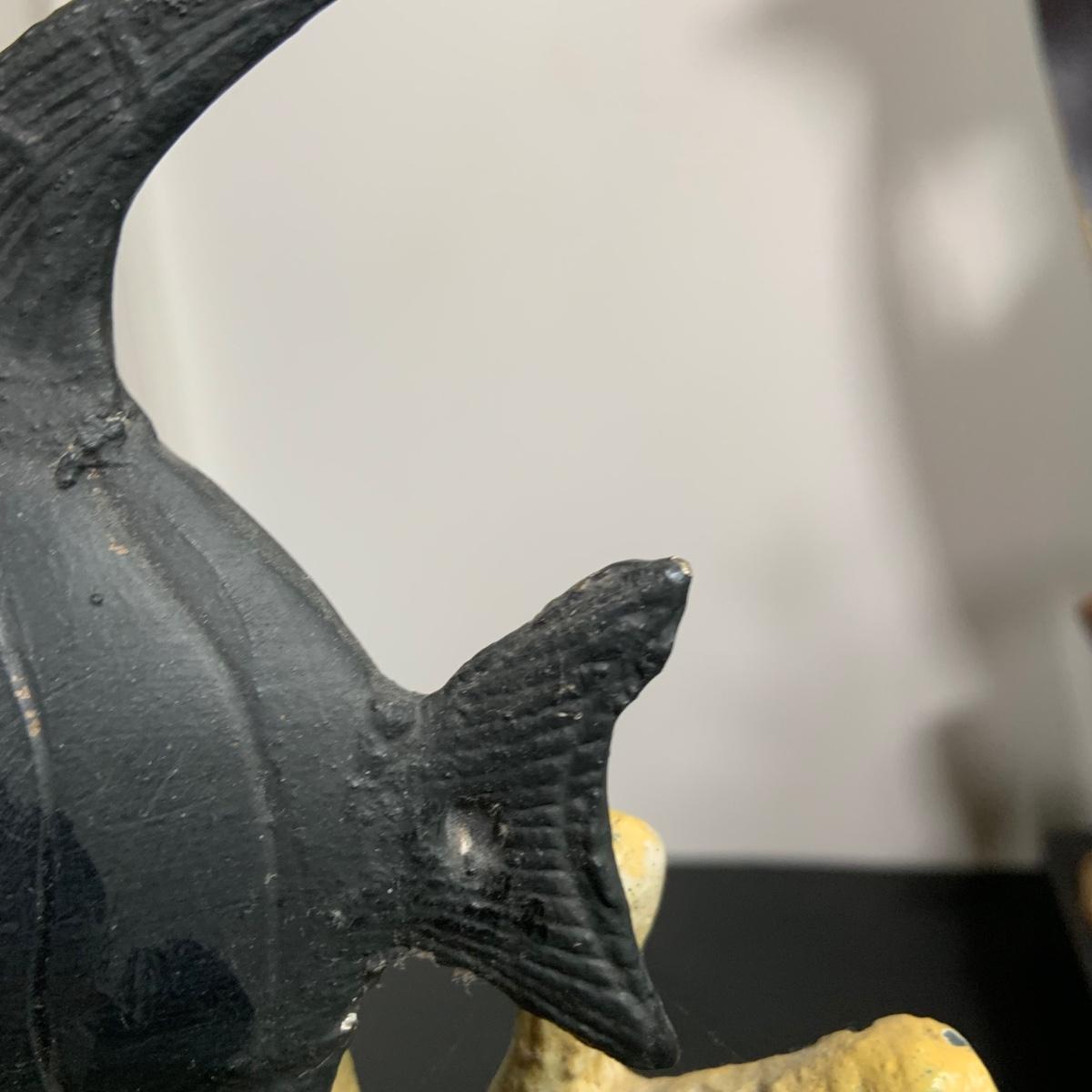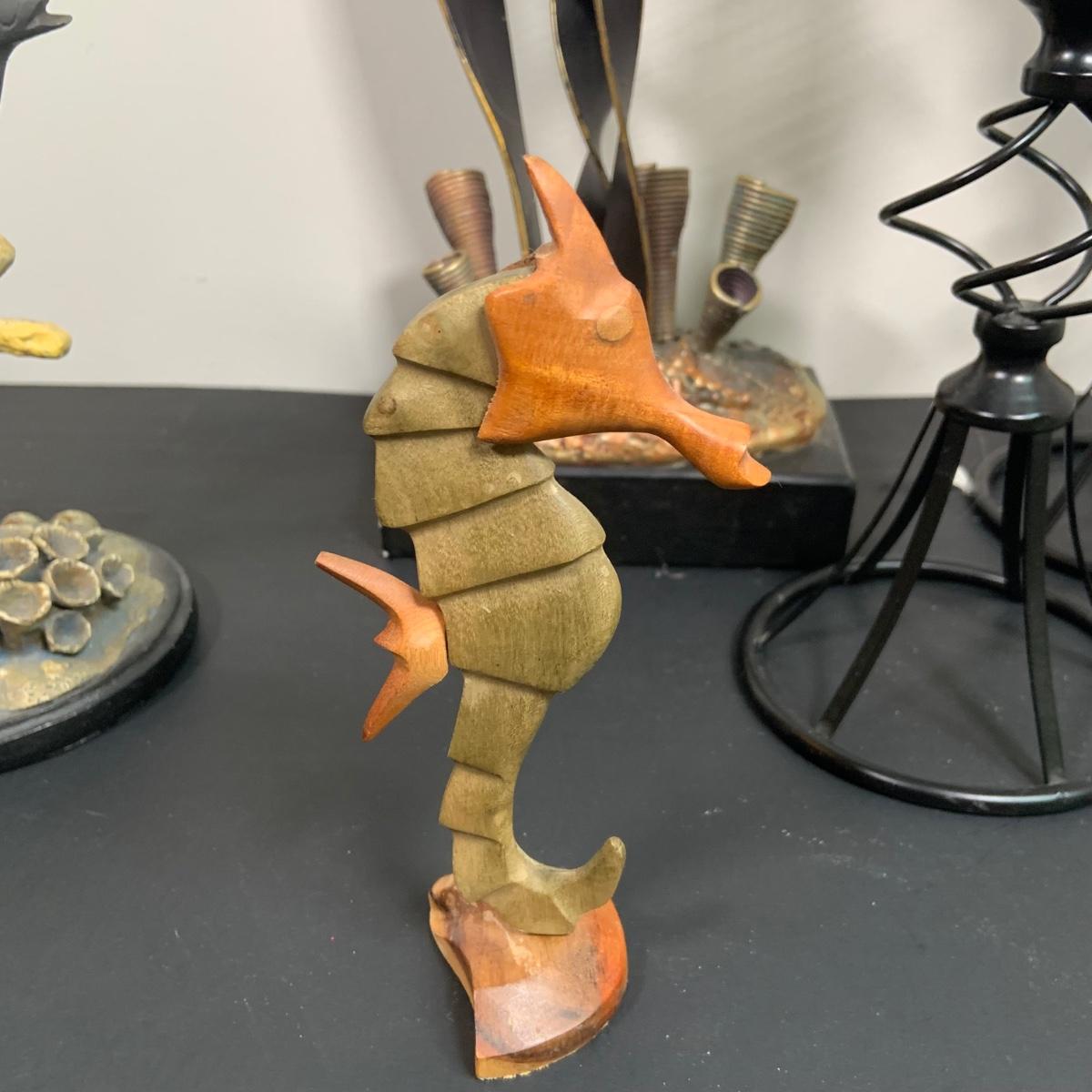 LOT:91: Under the Sea Home Decor Including 2 Angel Fish Statues, a Wood Seahorse and 2 Black Metal Candleholders
