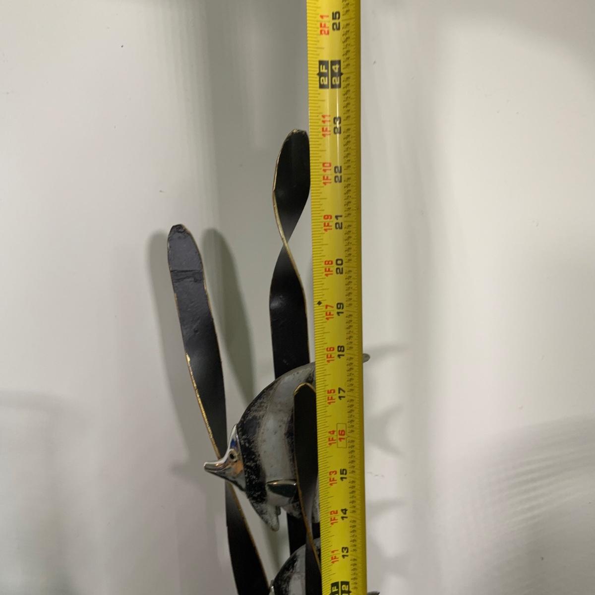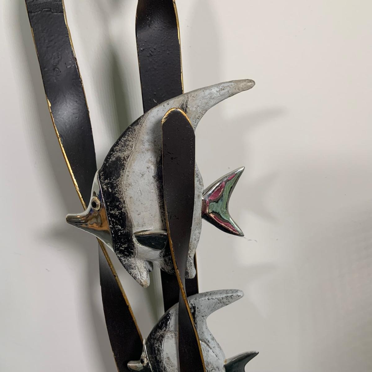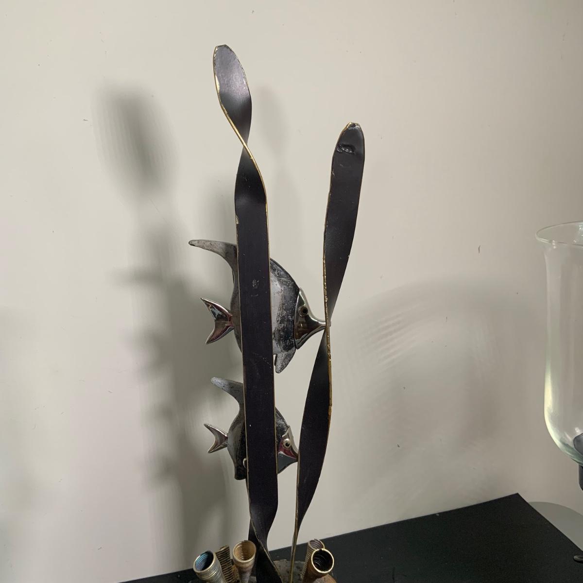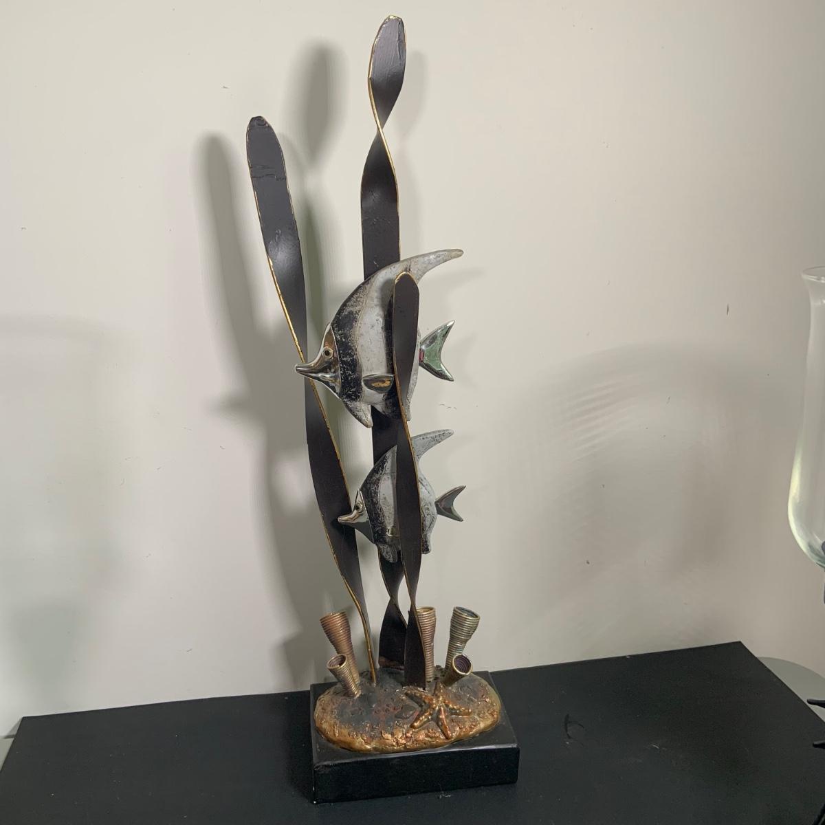 LOT:91: Under the Sea Home Decor Including 2 Angel Fish Statues, a Wood Seahorse and 2 Black Metal Candleholders