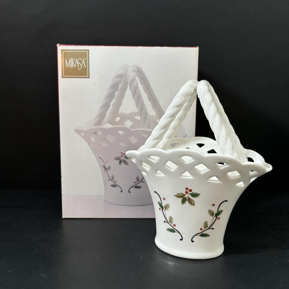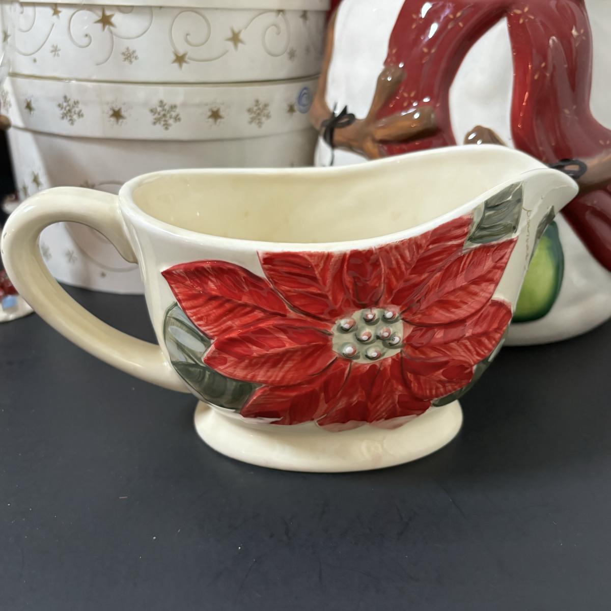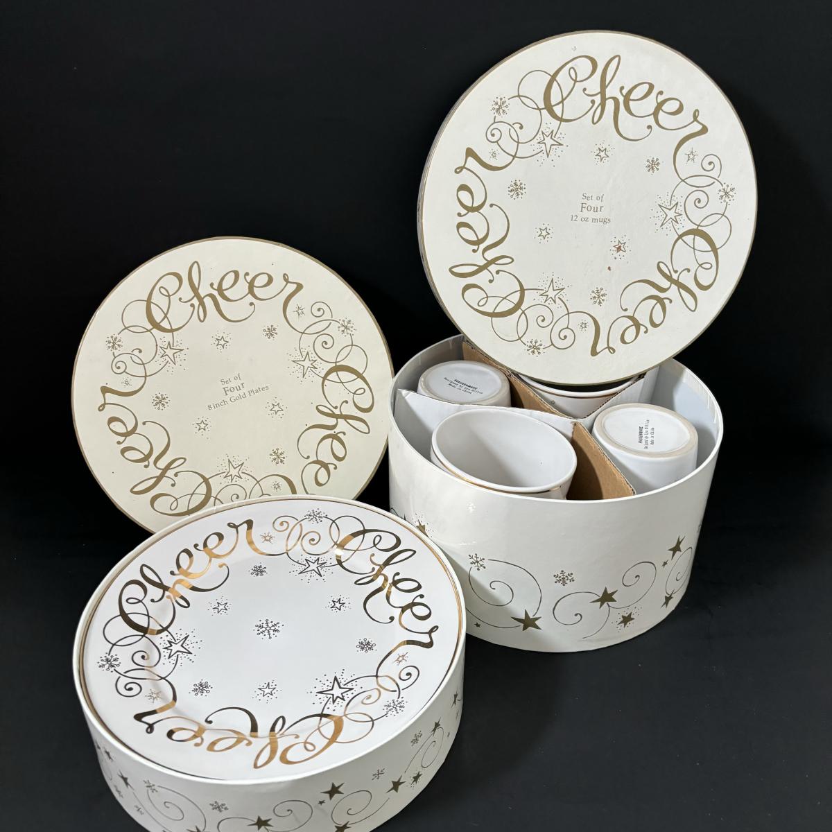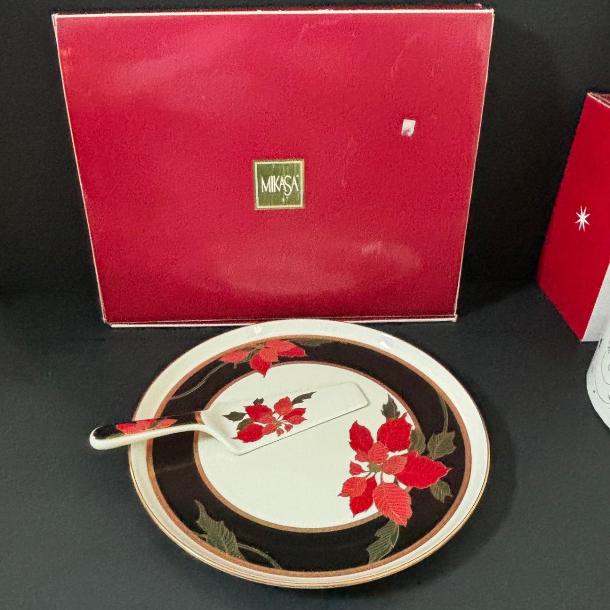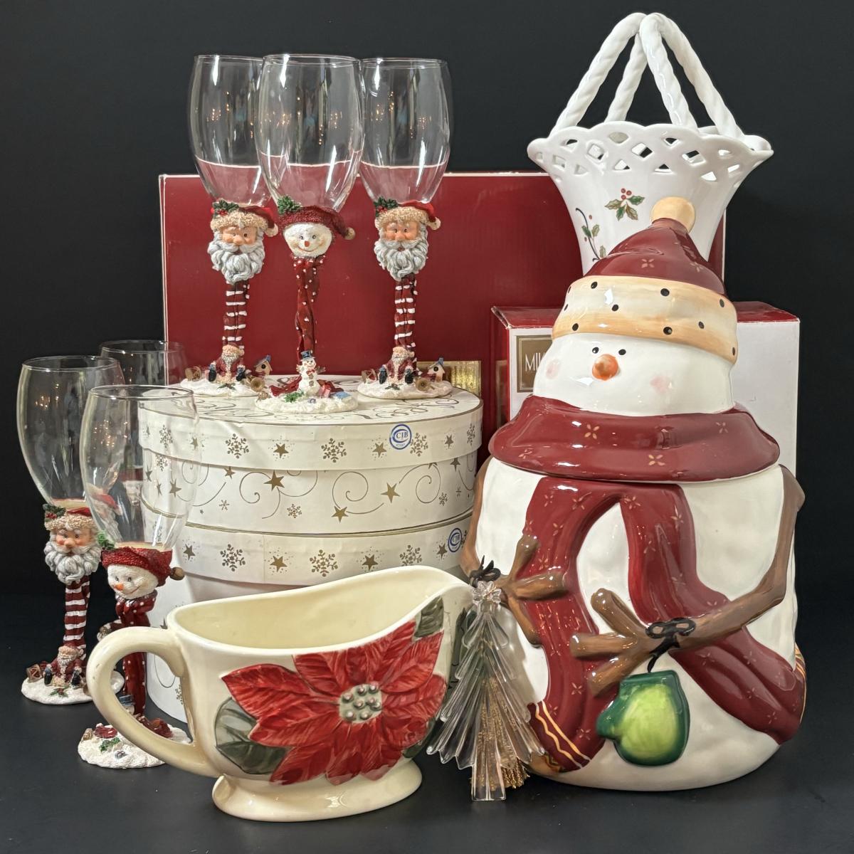 LOT 106: Holiday Entertaining or Gift Giving Collection: Boxed Mikasa, Boxed Hausen Ware by Lyn Dillin, Snowman Cookie Jar & Festive Santa & Snowman Glasses