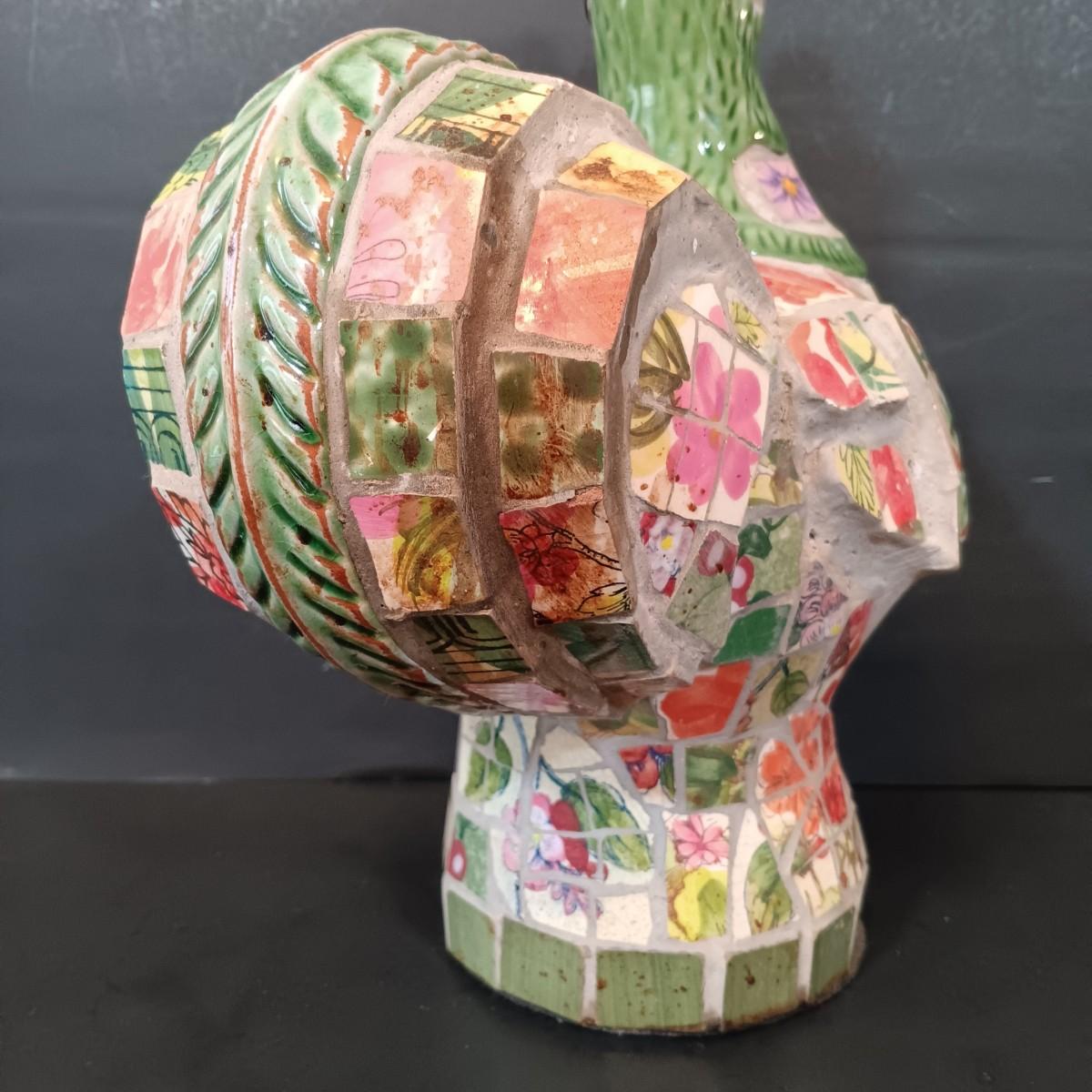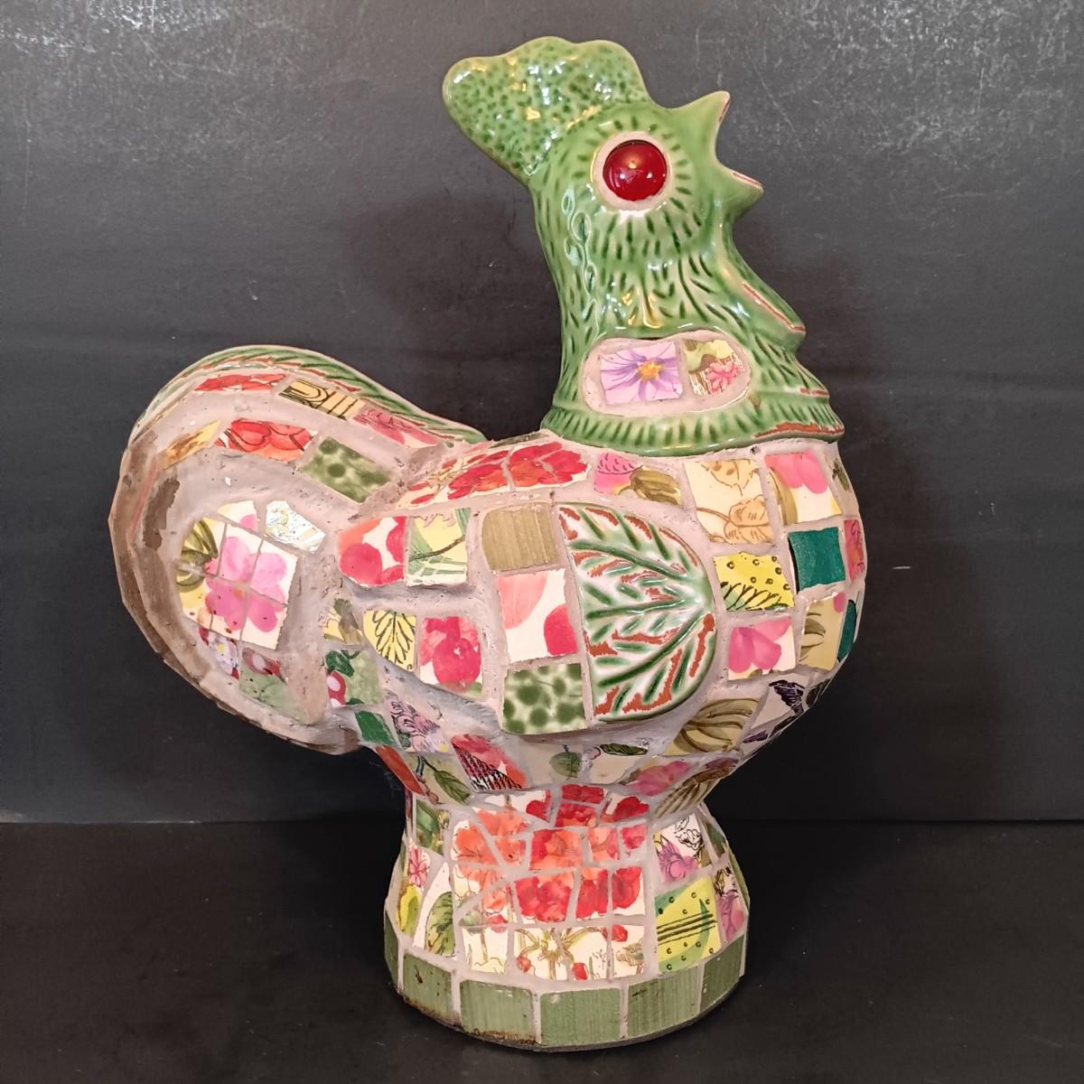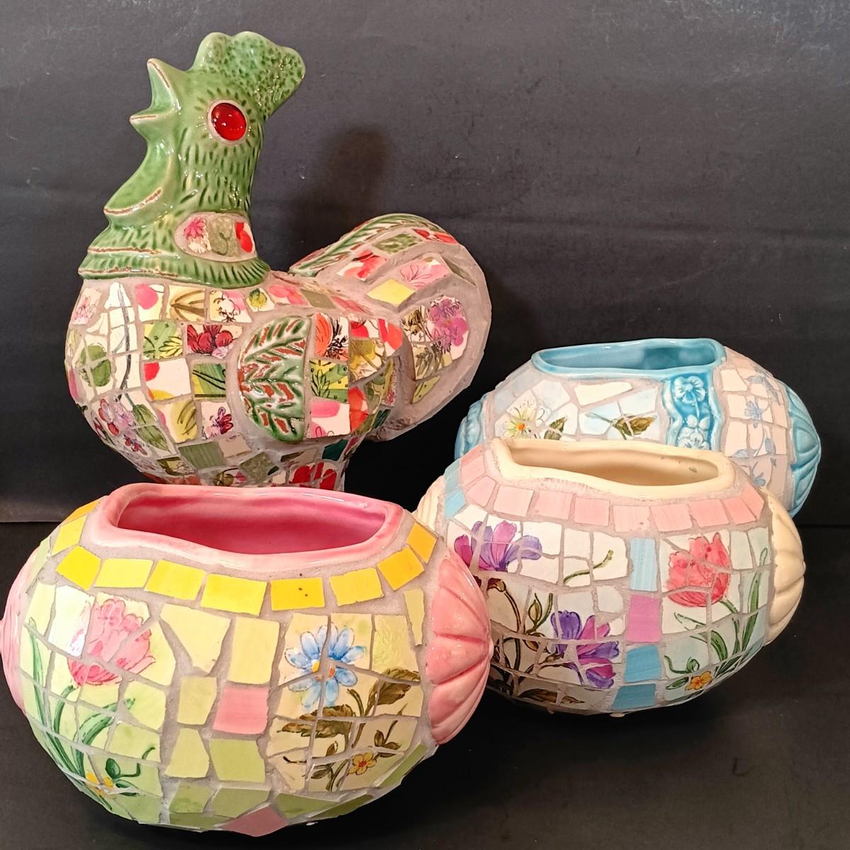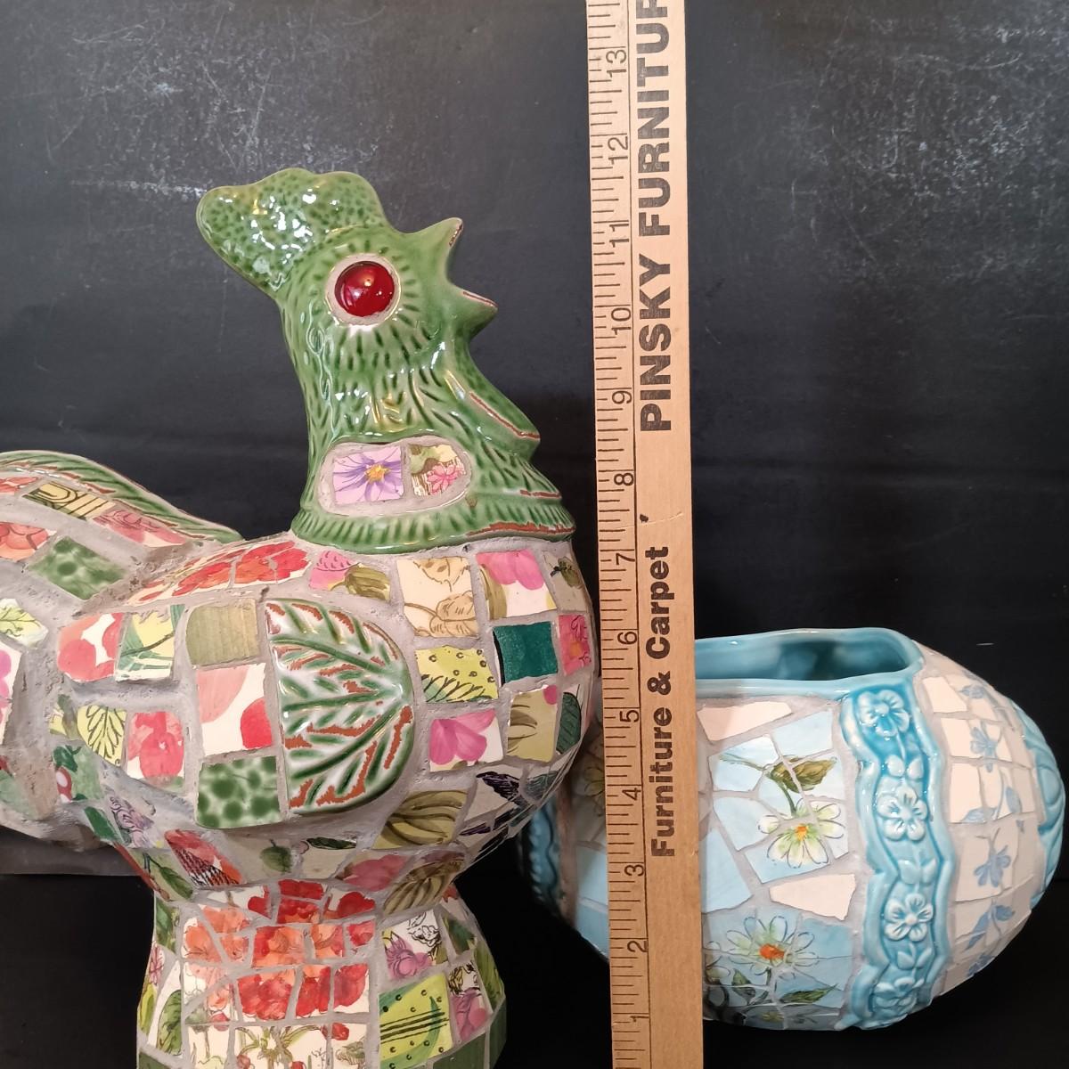 LOT 118: Handcrafted Mosaic Tile Rooster and Egg Planters