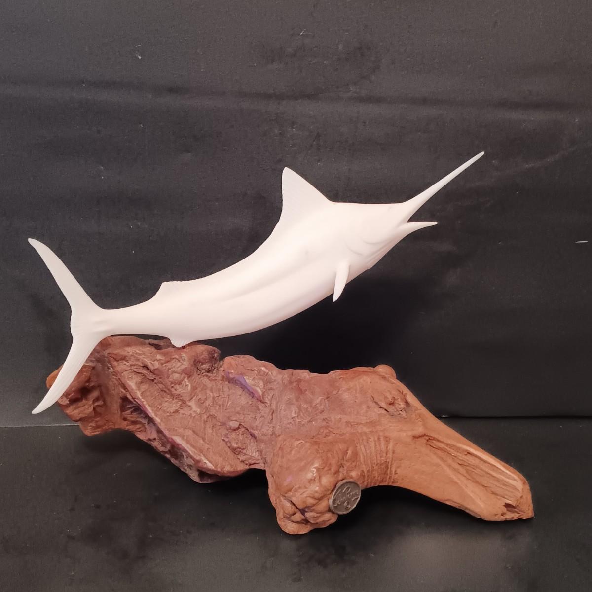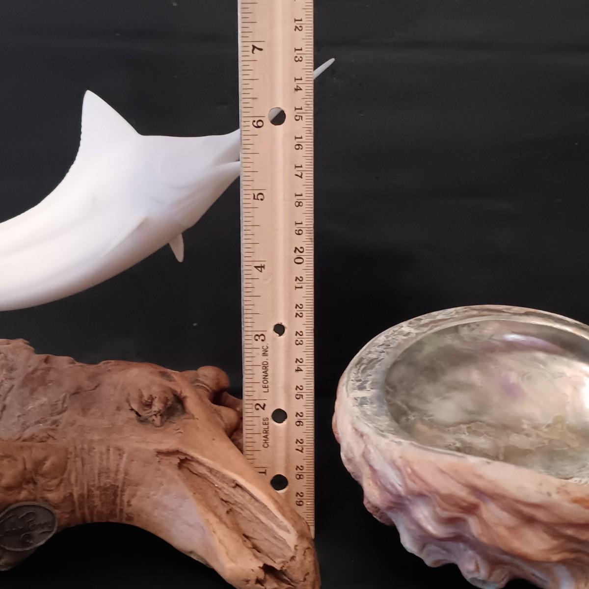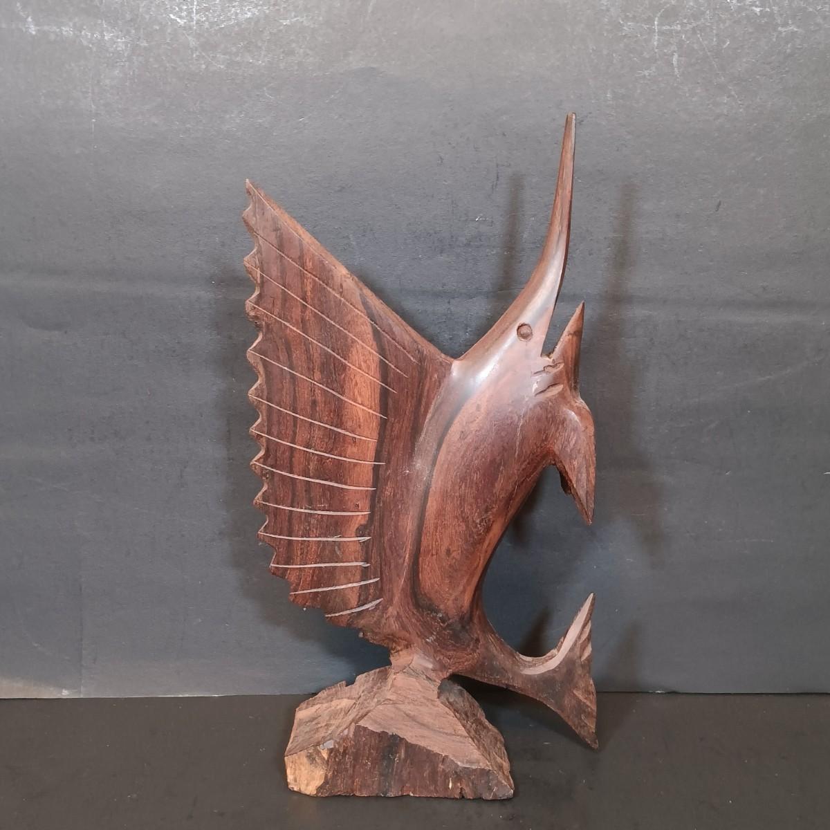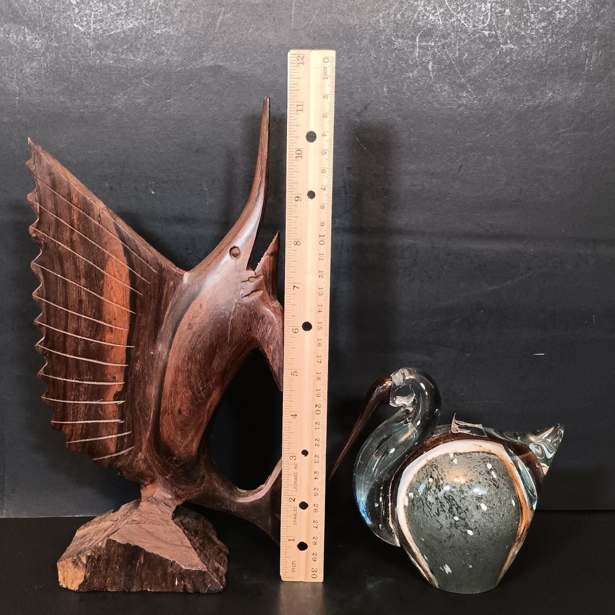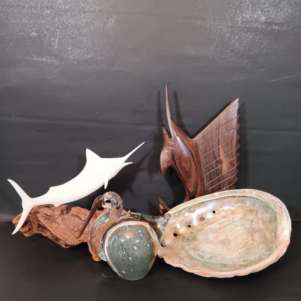 LOT 123: Vintage John Perry Swordfish Sculpture, HQT Glass Bird, Hand Carved Wood Swordfish & Large Red Abalone Shell