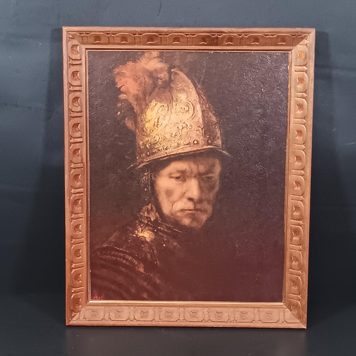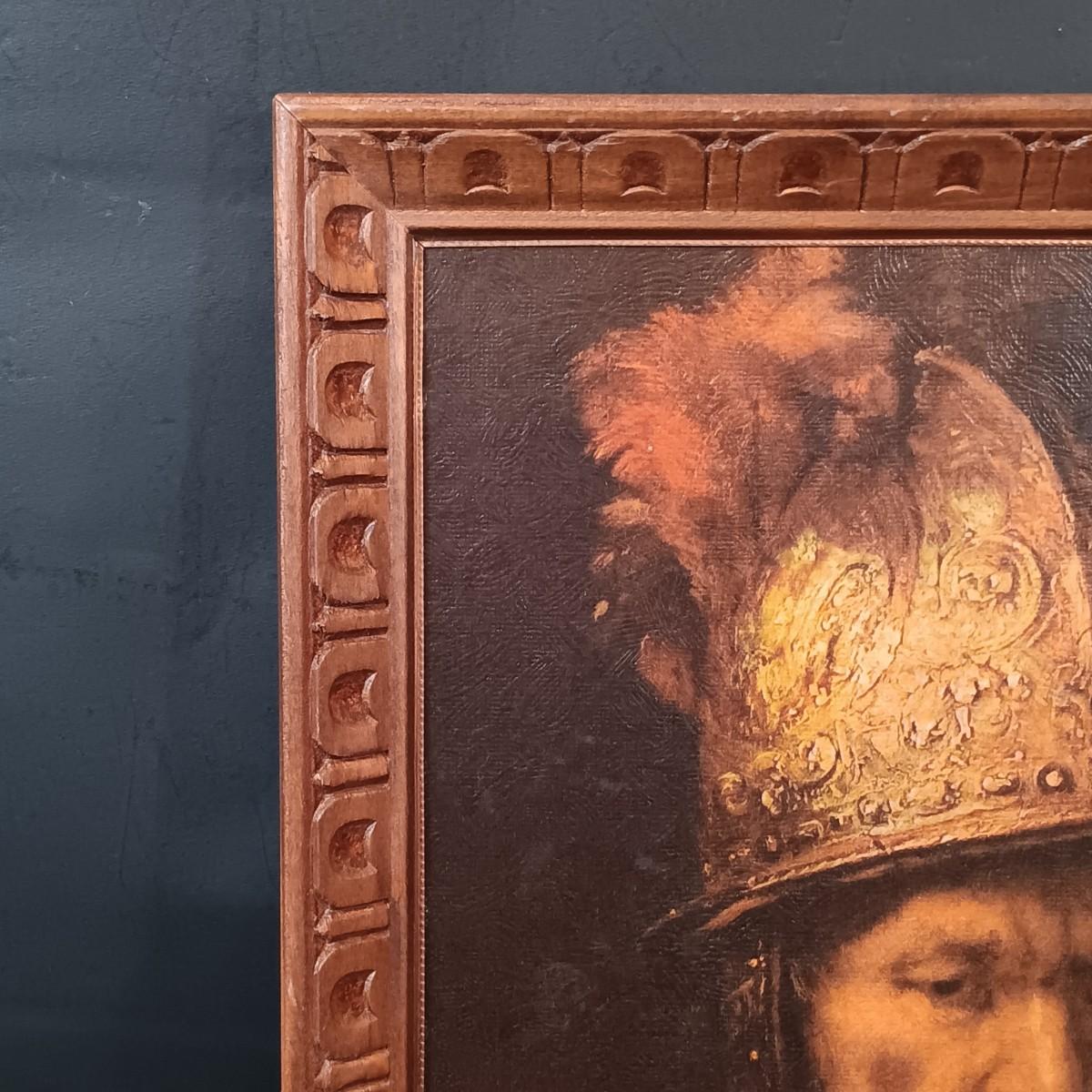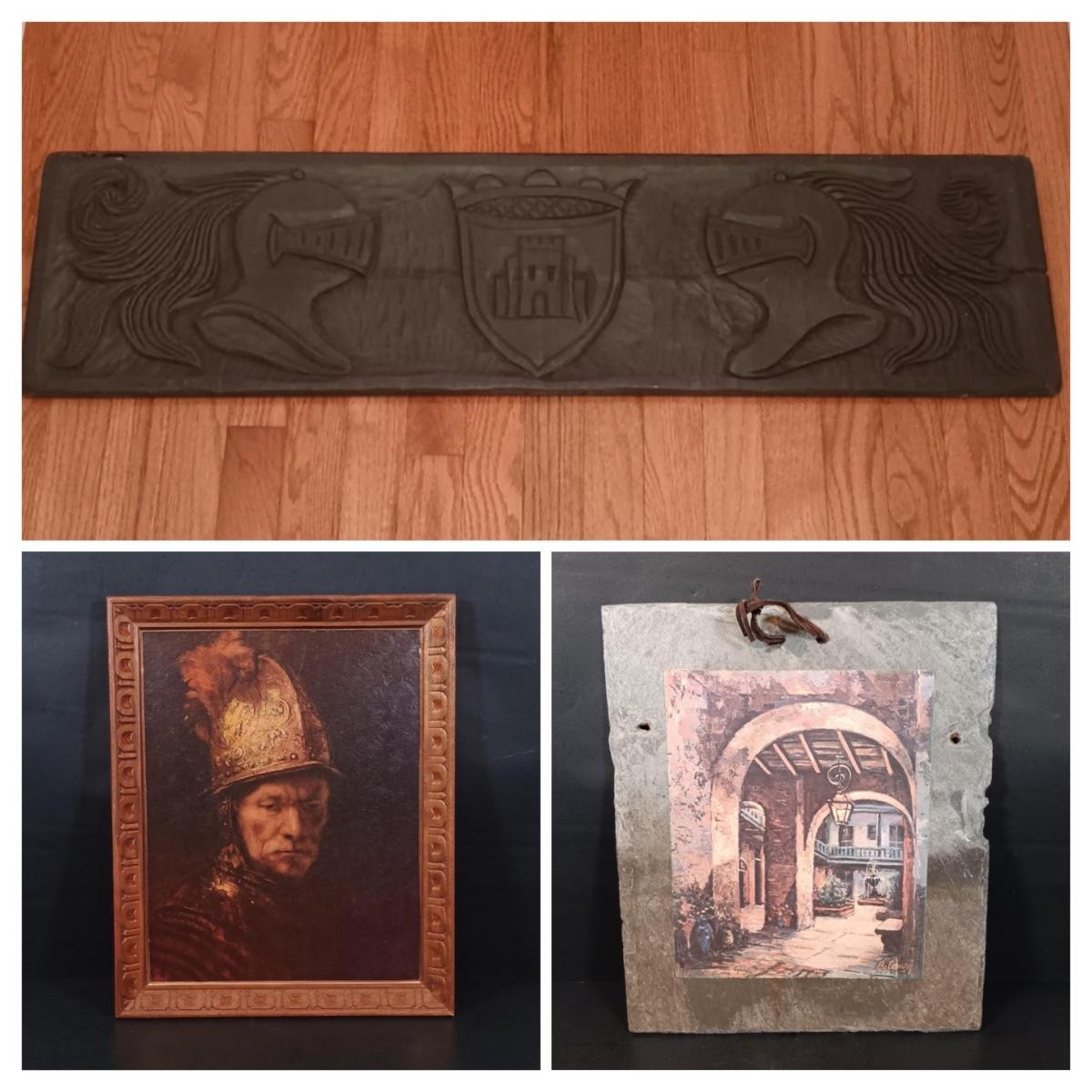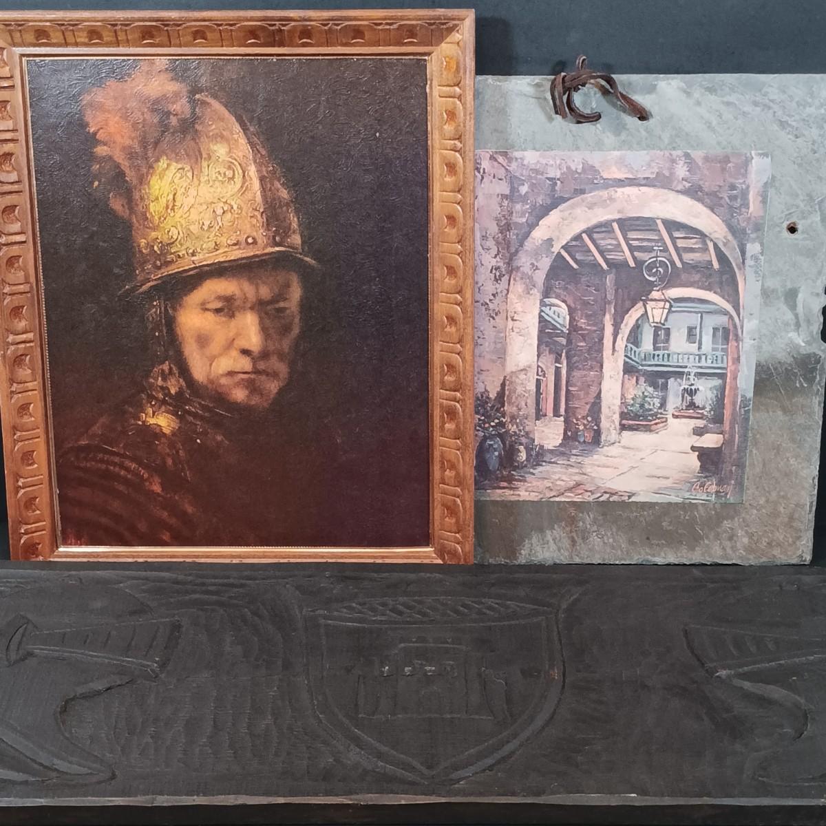 LOT 127: Antique Roofing Slate with Vintage Print, 'The Man With the Golden Helmet' Framed Print & Handcarved Wood Medieval Decor