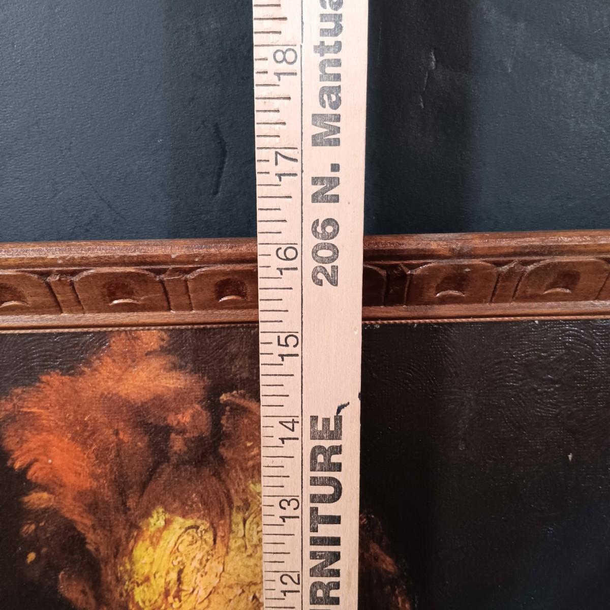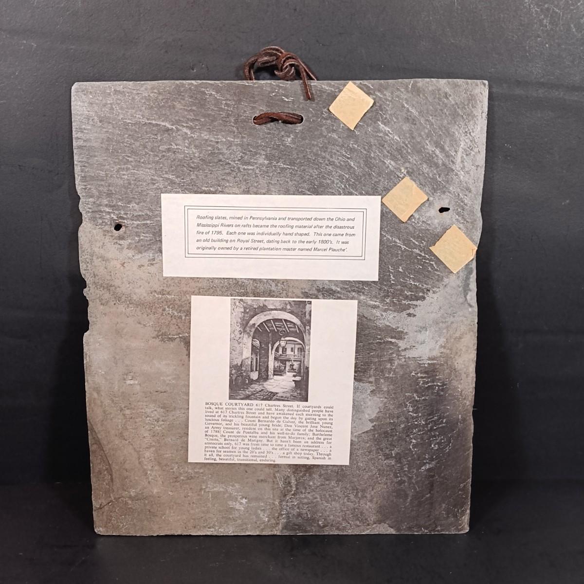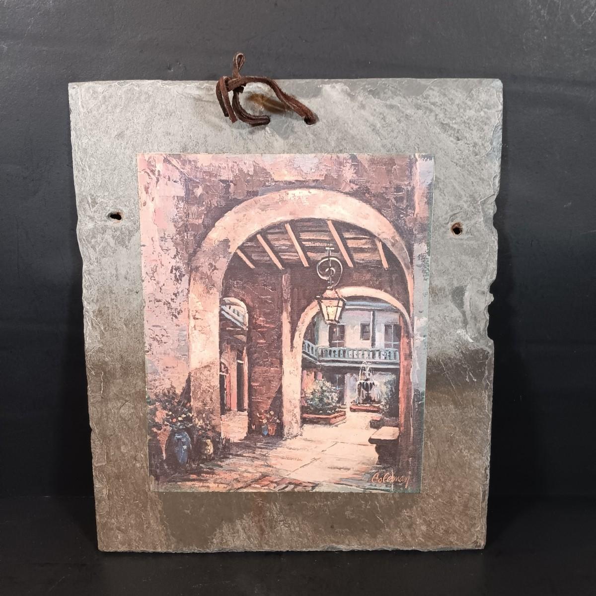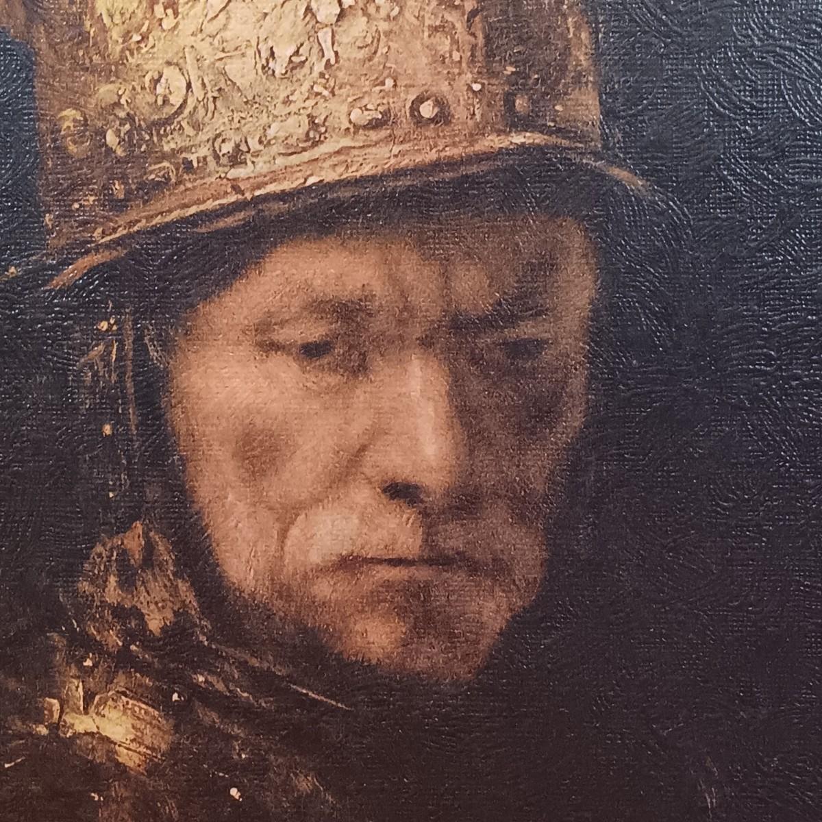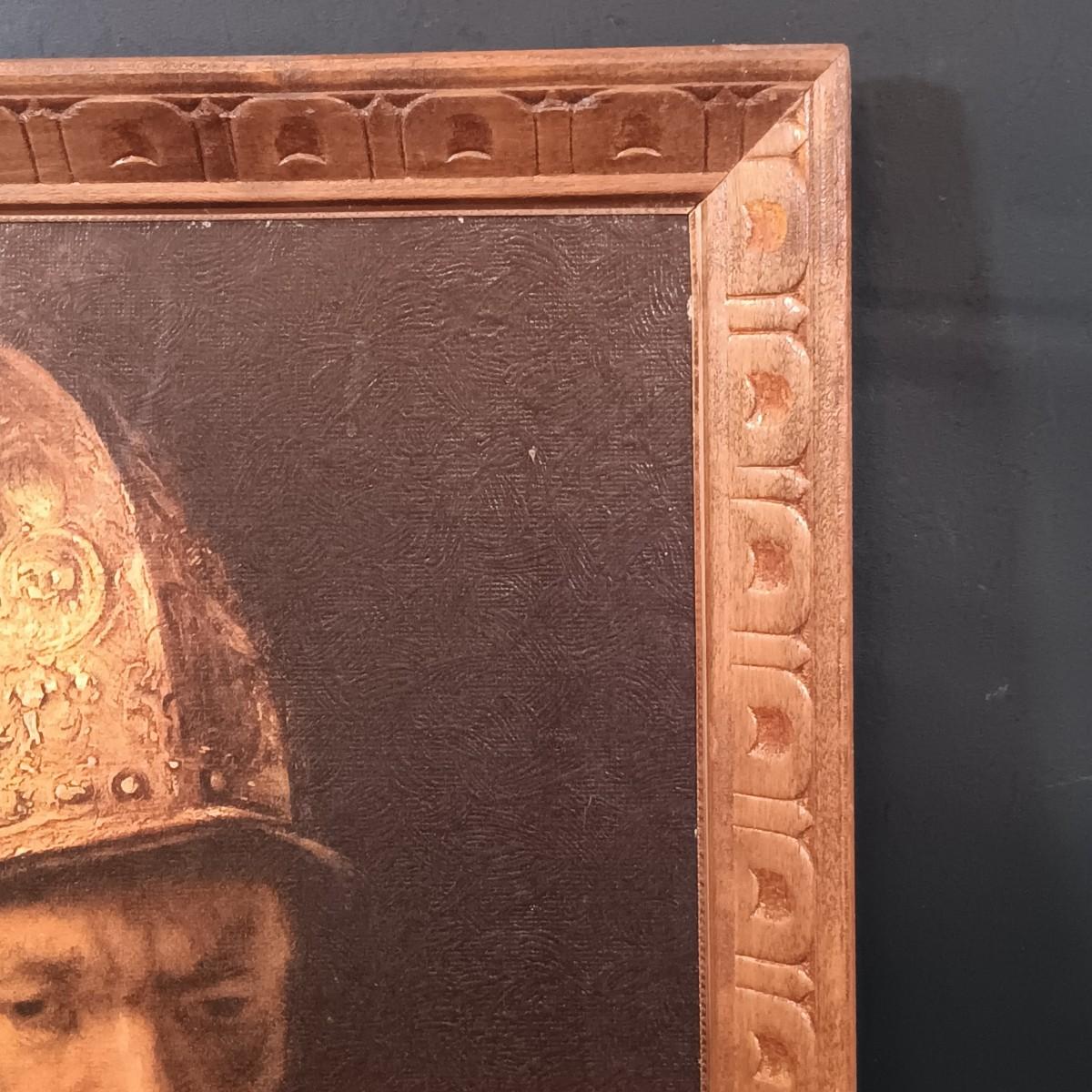 LOT 127: Antique Roofing Slate with Vintage Print, 'The Man With the Golden Helmet' Framed Print & Handcarved Wood Medieval Decor