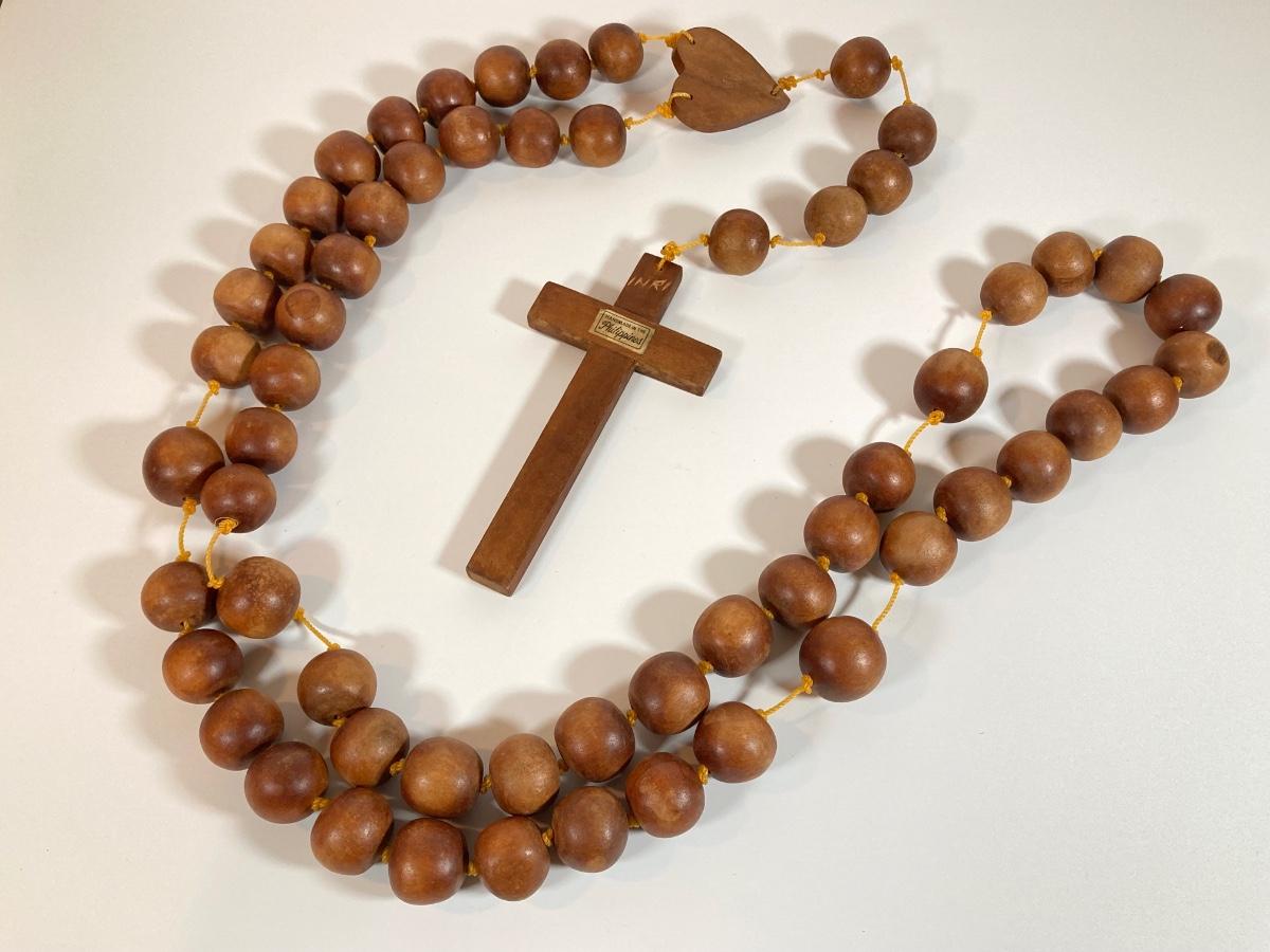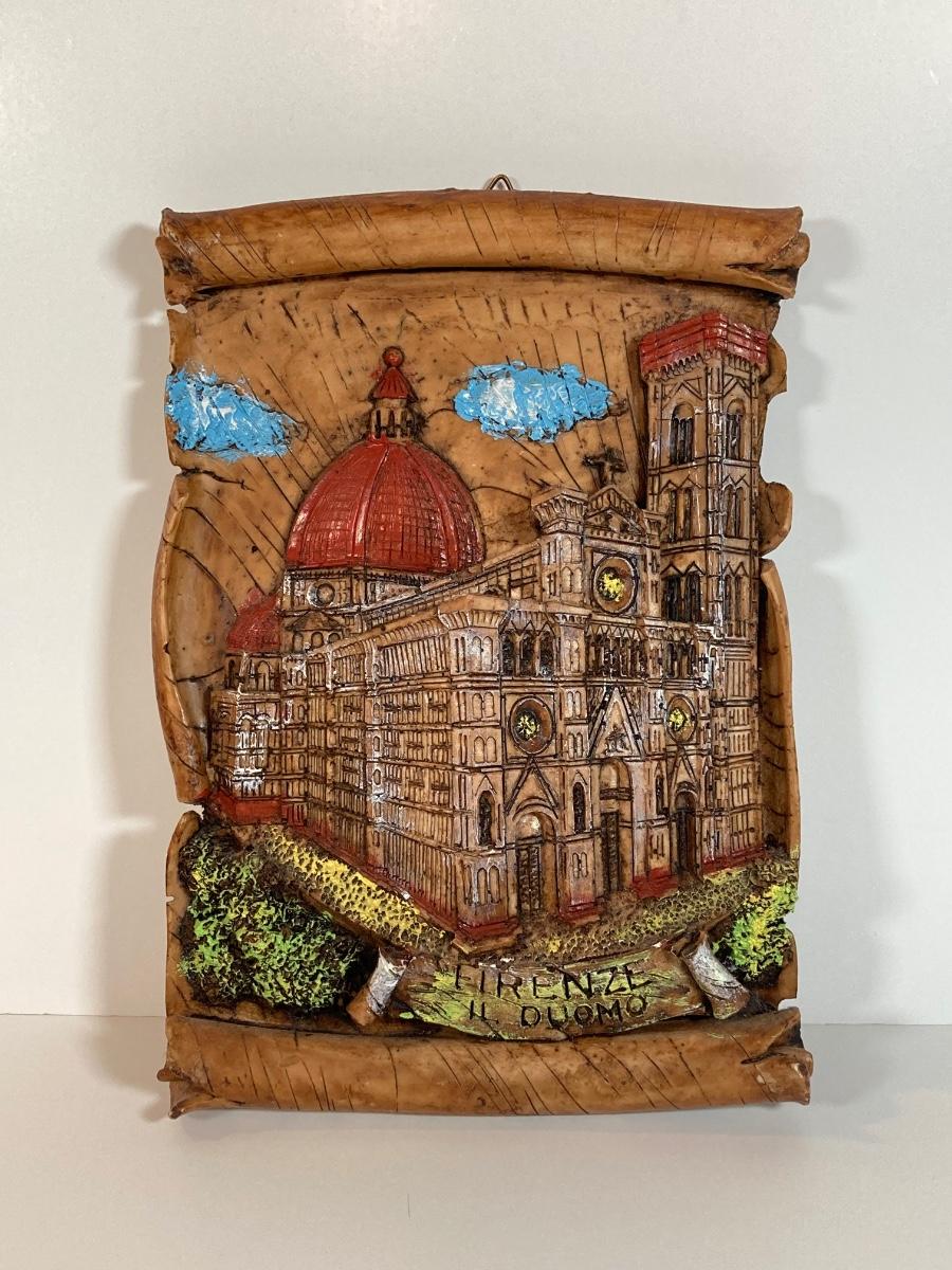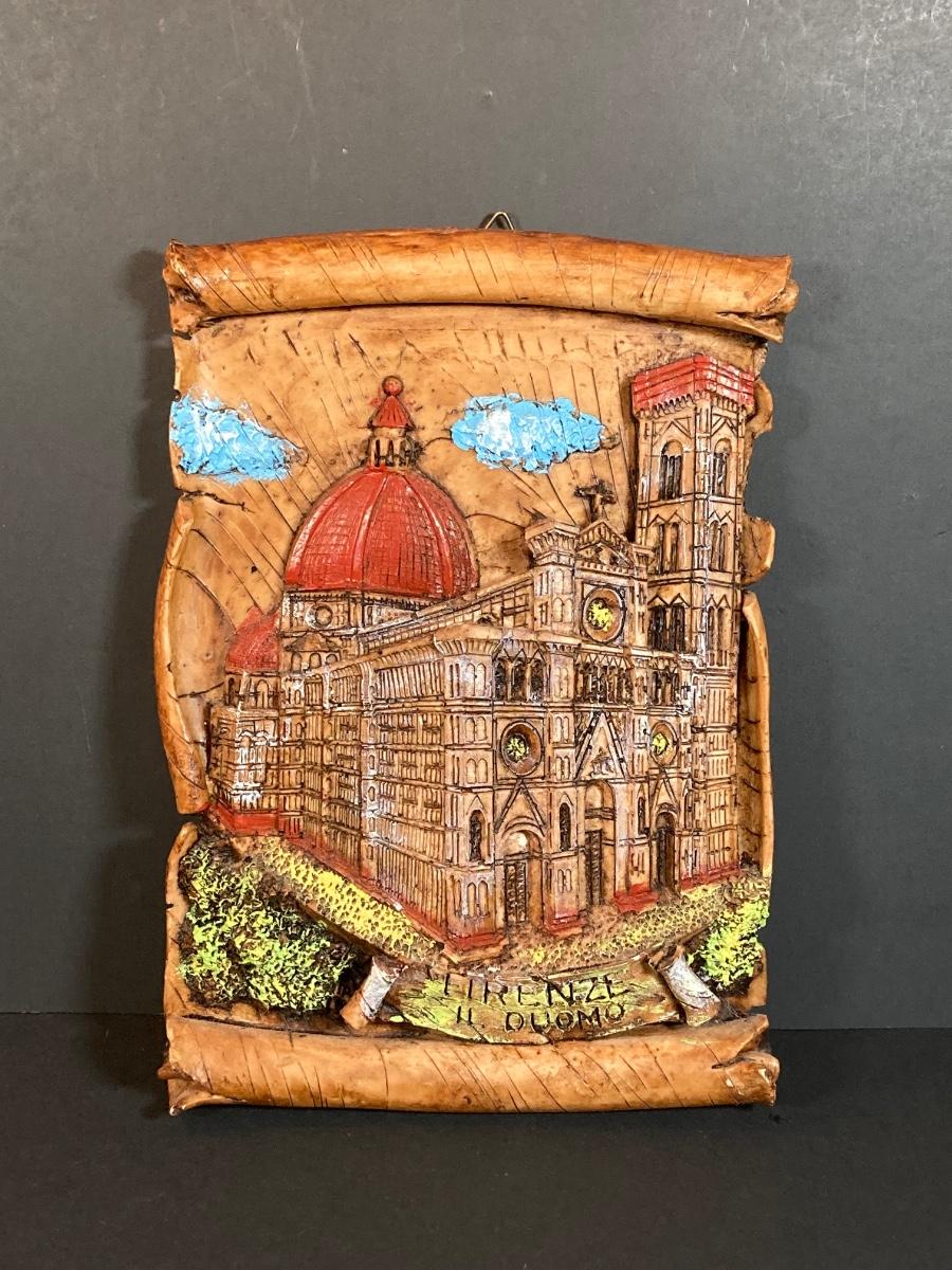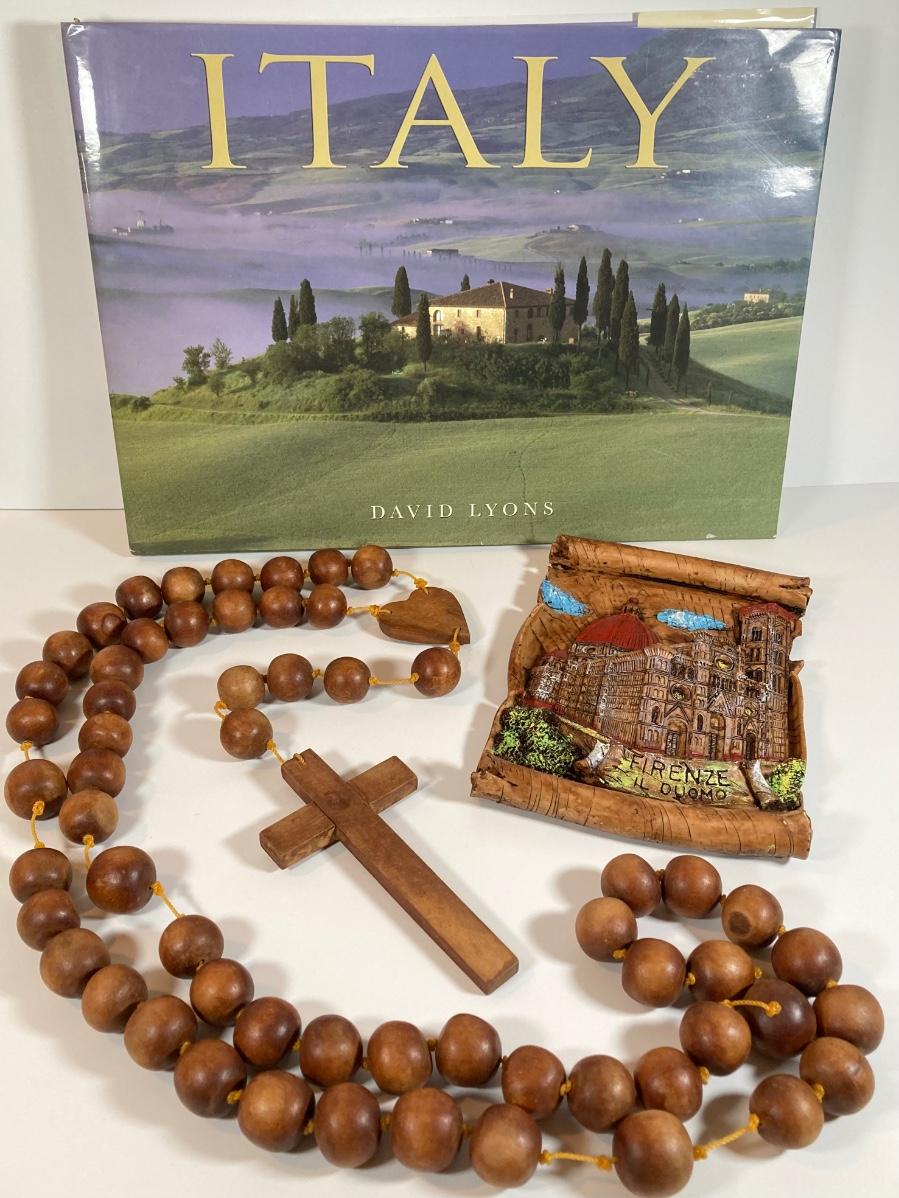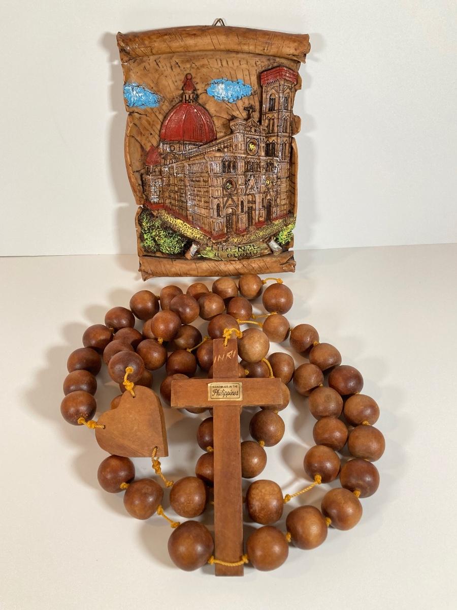 LOT 139L: Firenze Italy Wall Plaque, Italy Coffee Table Book and Set of Large Wooden Beads with Cross